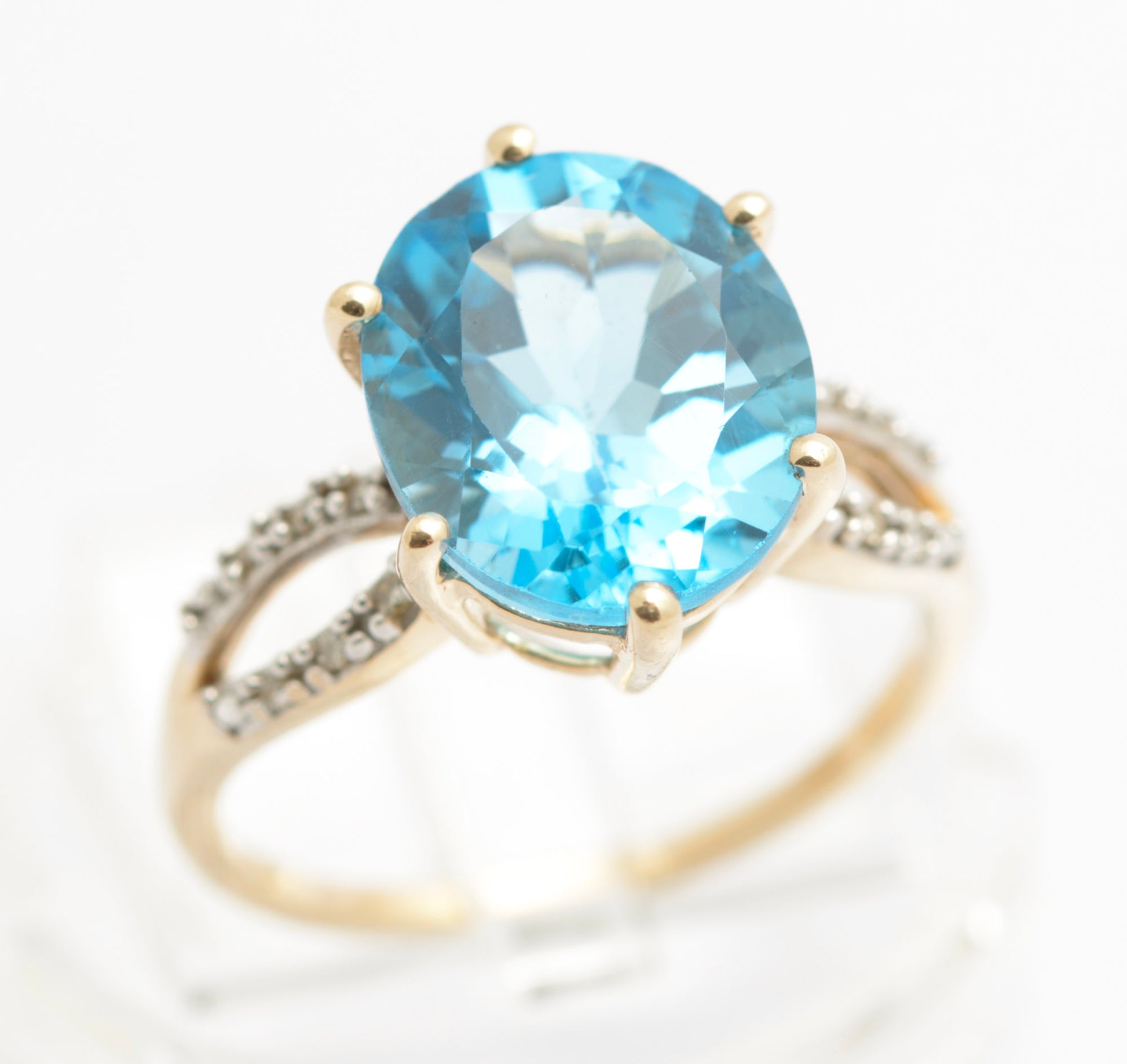 A 10K gold dress ring with a large natural blue topaz gemstone. It is oval facet cut and has a good sparkle in the light and is approx. 6.5 carats. The shoulders are bifurcated and set with diamonds. Inside the band it has a hallmark from the Birmingham assay office with date letter for 2017. There is also a 10K mark for 10ct gold and the makers initial G in a shield.