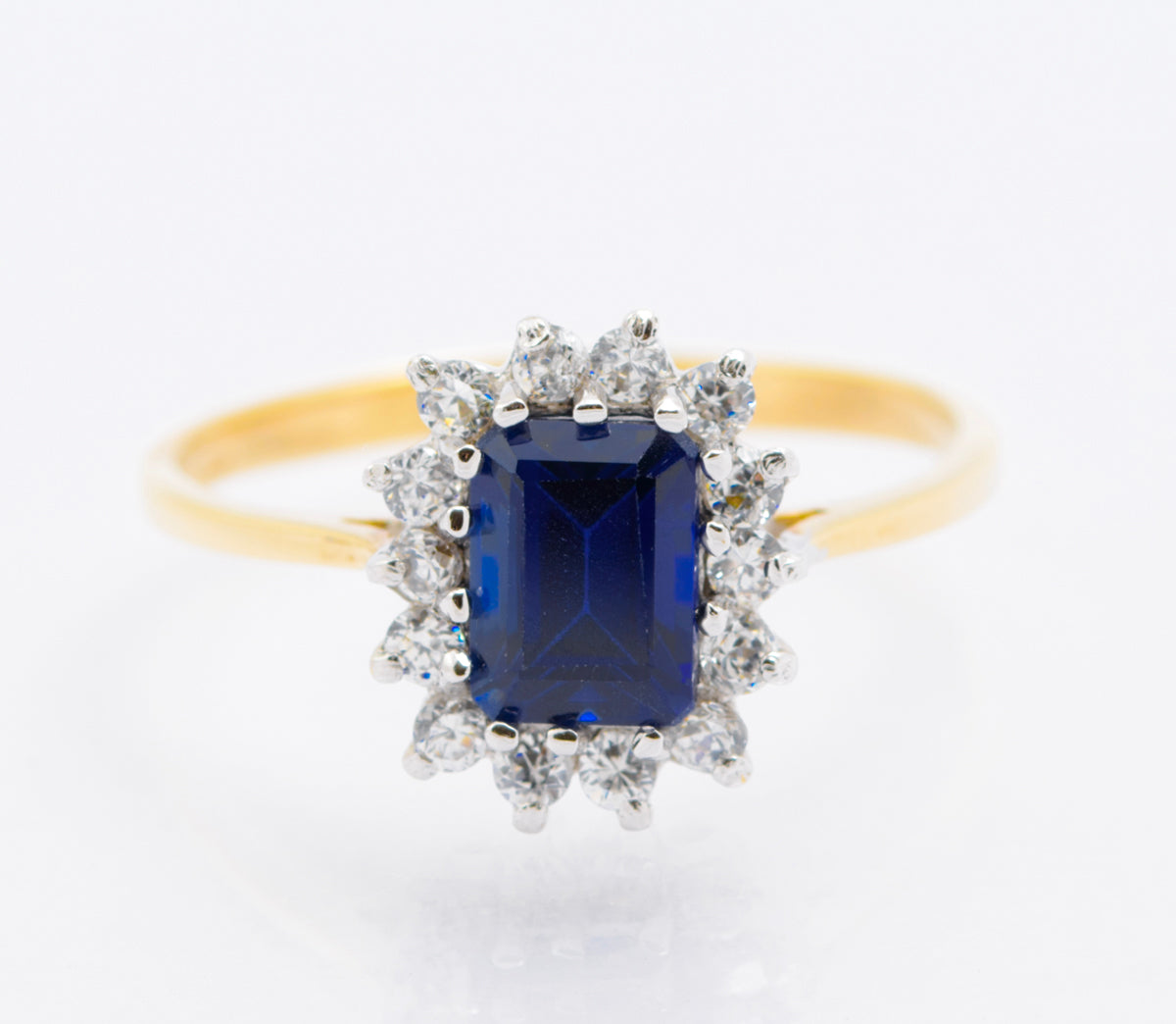 A 9ct gold ring with a central emerald cut sapphire and a halo of CZ gems. The sapphire is lab grown. Lab grown stones are identical to natural gems and test the same but they are generally free of impurities and faults unlike mined stones. As they are created in a lab they do not have the environment issues of mined stones or have the worry of social problems making them an increasingly popular choice.