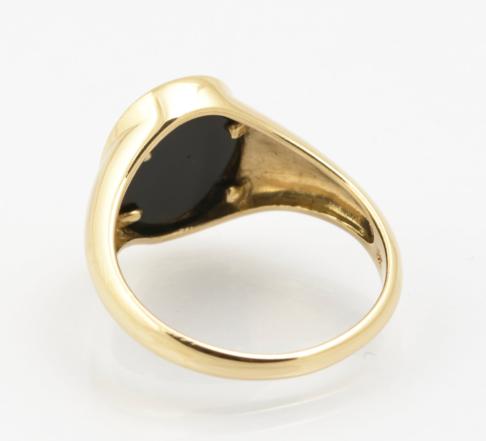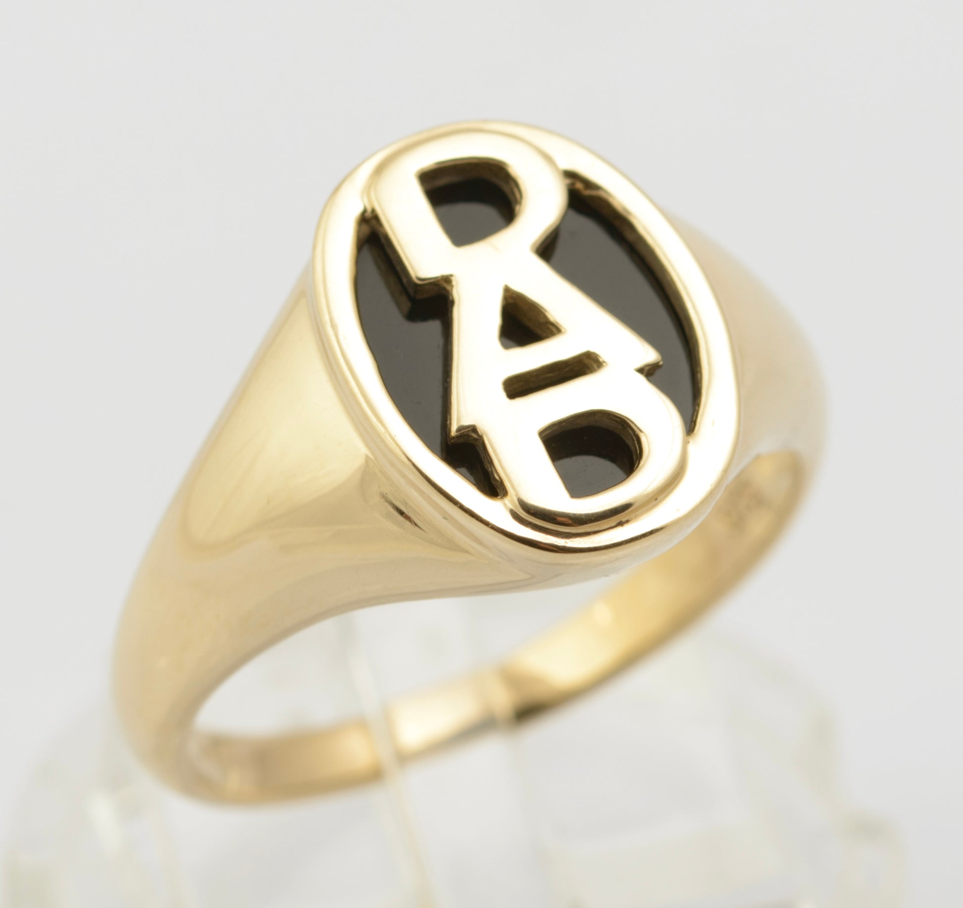 A 9ct gold ring with DAD to the face over a black onyx tablet. The ring is of traditional signet shape with a plain band tapering to the top. The letters are contrasted nicely with the onyx below. Inside the band it has 9K marks for 9ct gold along with a Birmingham hallmark from the late 20th century and makers mark STS.
