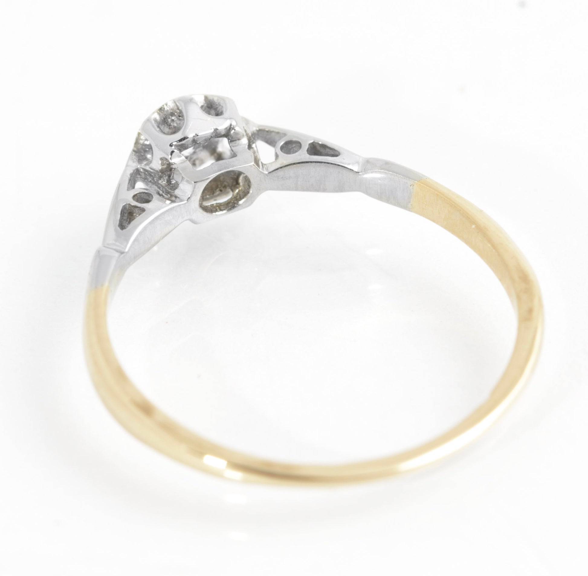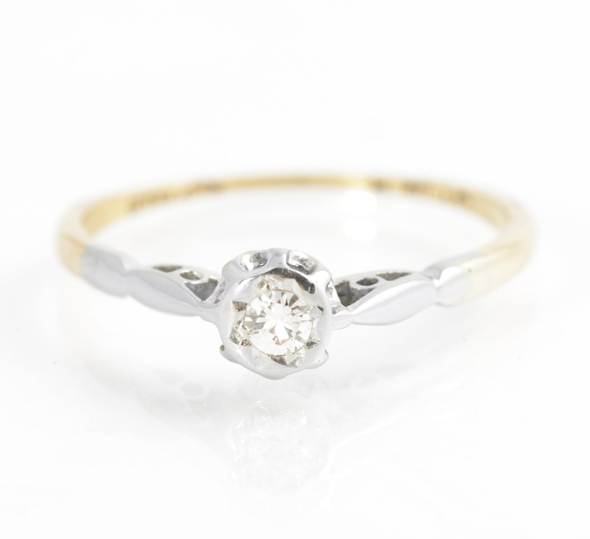 An antique diamond solitaire ring dating to the early 20th century. It has an 18ct gold band and a platinum head and bridge. It is set with a 2.6mm round facet cut diamond. Inside the band it is marked 18ct in the older style British mark and this style was typically used between the Edwardian and Art Deco period. It was quite likely used as an engagement ring.