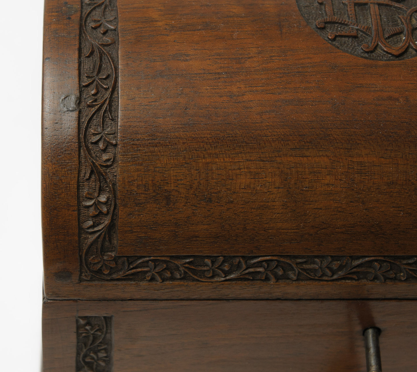 A mid to late 19th century Anglo Indian carved domed top box. It has decorative channels carved in the Northern Indian style with small flowers. The top features a set of carved interlocking initials, these are rather hard to make out but may be 'RDL' or similar. The lid hinges to reveal a plain interior and there is a working lock with key. The box is reasonably deep for it's proportions and is sturdy along with two carved handles so may have been for something reasonably heavy for it's size. It has a plinth base with green felt (which is a replacement). The wood appears to be teak and it is very nicely made and was clearly a quality piece. A fine item for the desk or to store some precious objects.