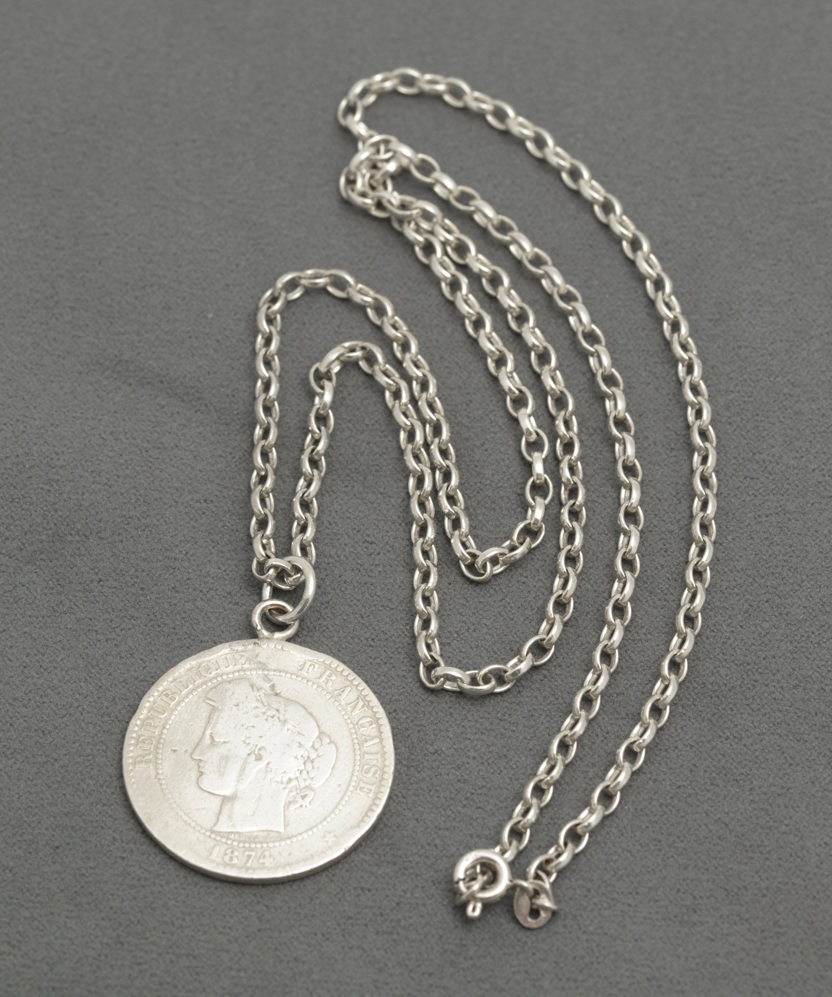 An interesting necklace using a French 10 Centimes coin with date stamp for 1874. Coin catalogues suggests this coin was made in bronze, however this coin tests as sterling silver so is possibly a special token rather than a circulating coin of the period. It comes on a good quality sterling silver chain with spring ring clasp. The chain is marked for sterling silver with a hallmark from the Sheffield assay office and date letter for 1984.