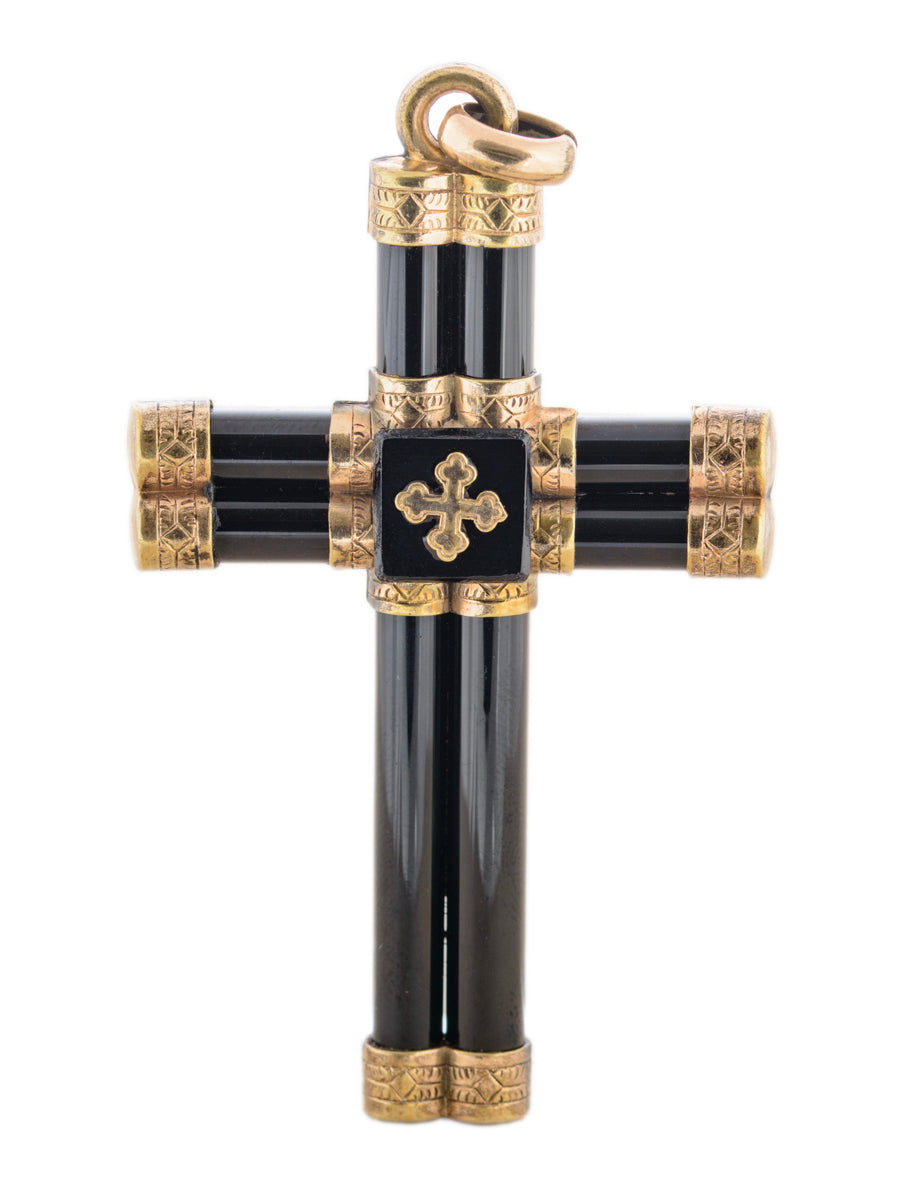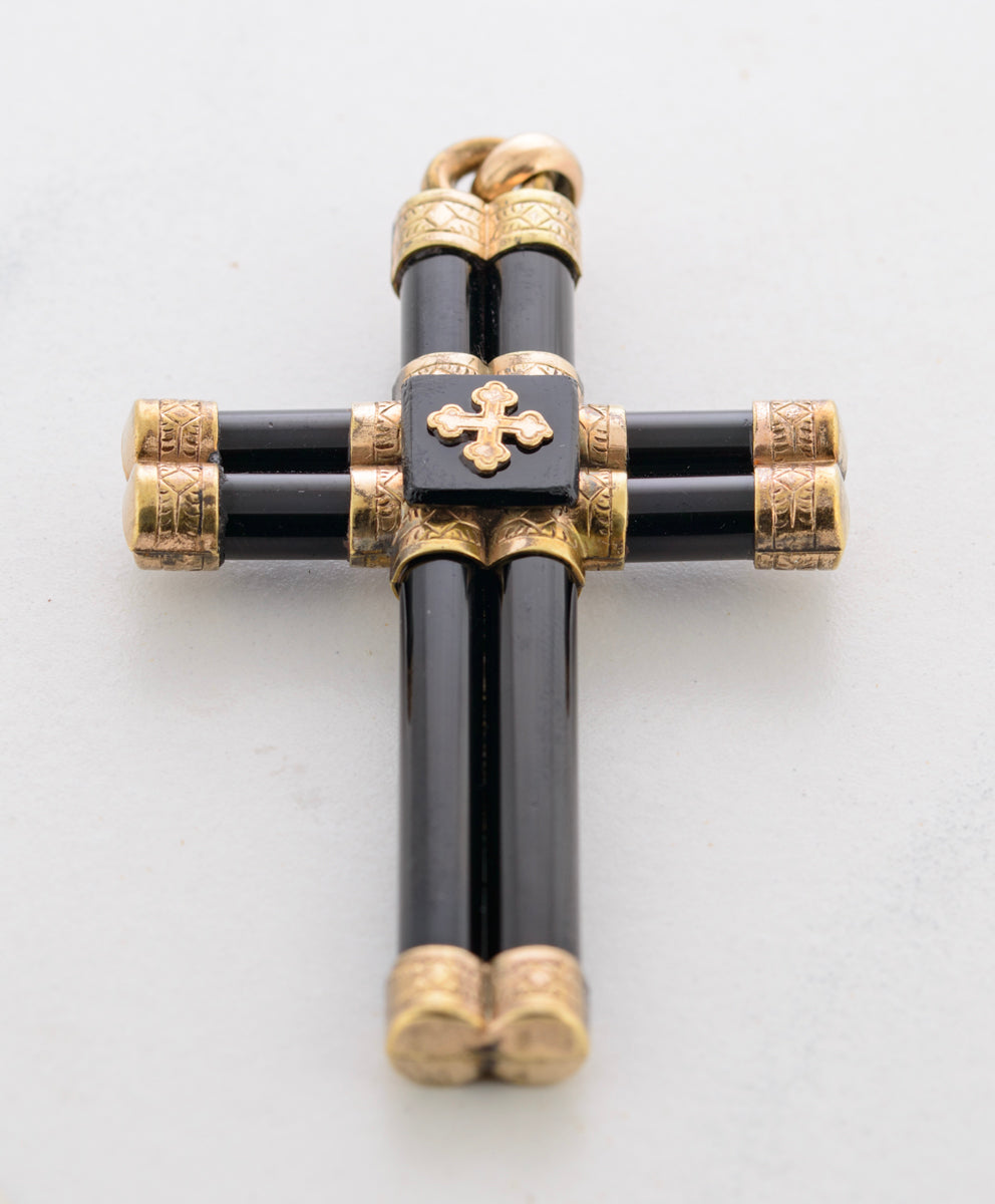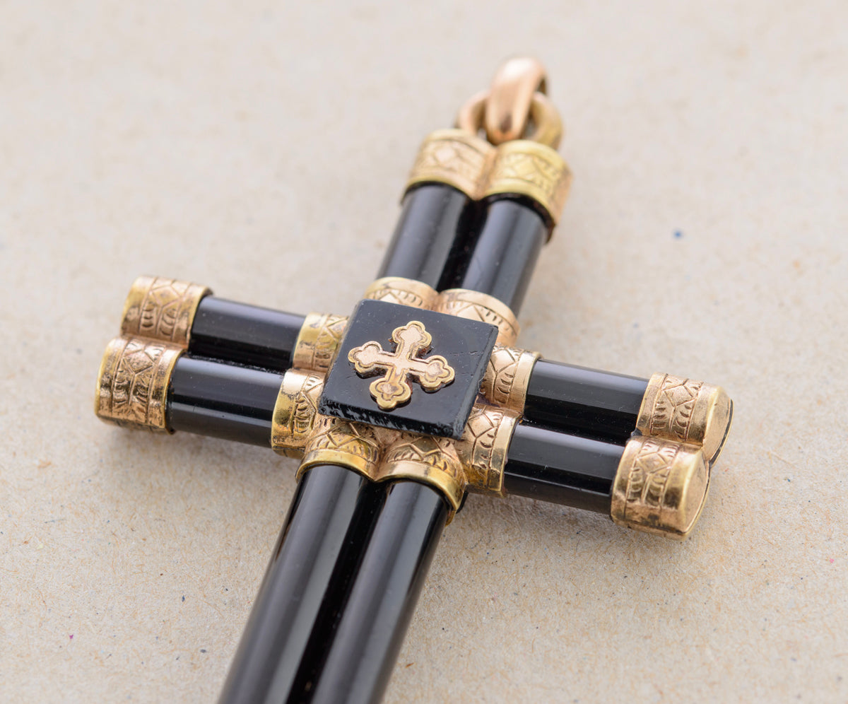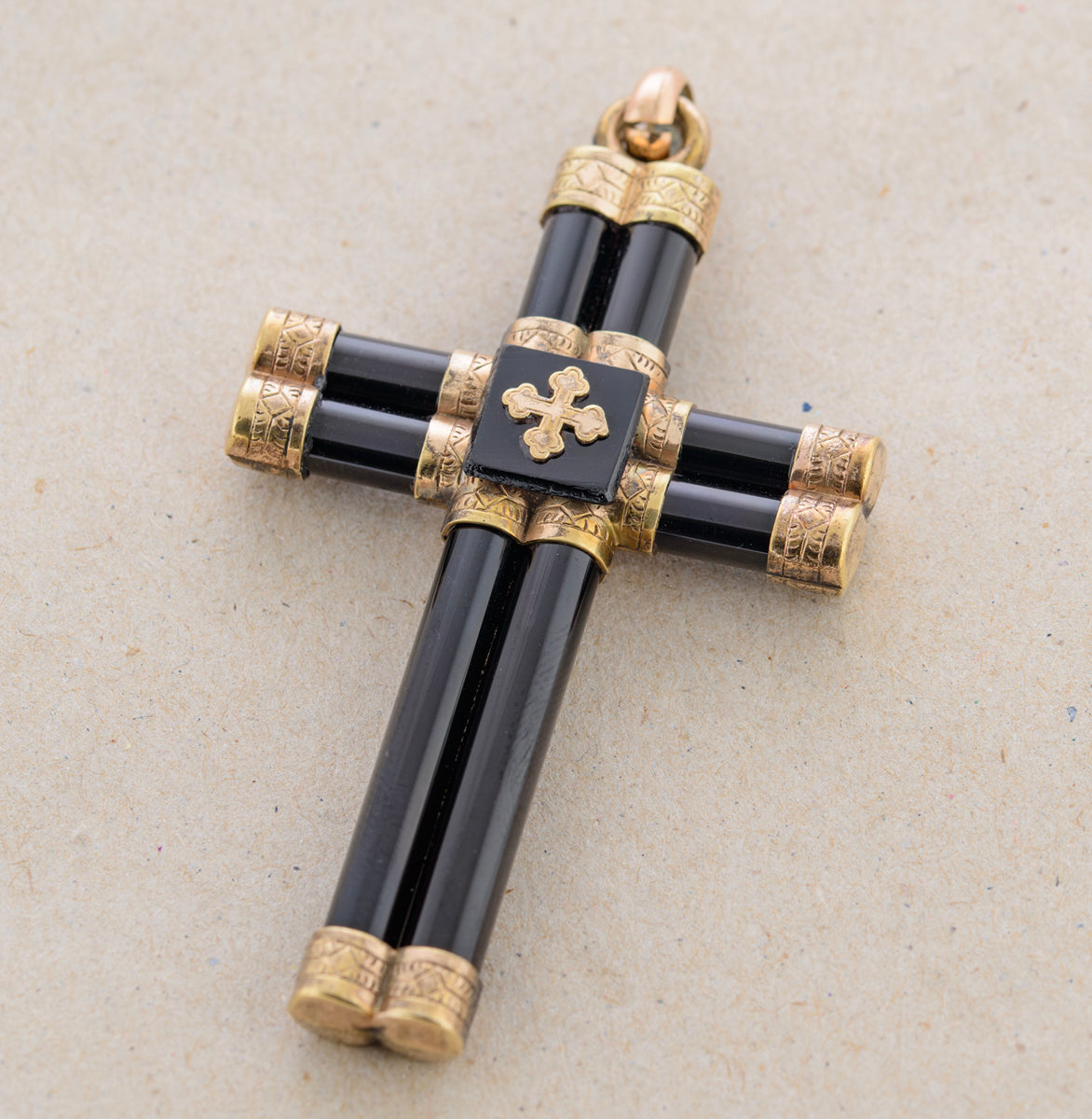 A large 19th century pendant in the form of a double bar cross. It is produced in French jet and gilt metal and has a Maltese style cross to the centre panels. The cross has a suspension loop and integral bale. There are no makers marks or details and it dates to the late Victorian period (French Third Republic). It has a Gothic look and given the size will certainly be noticed when being worn.