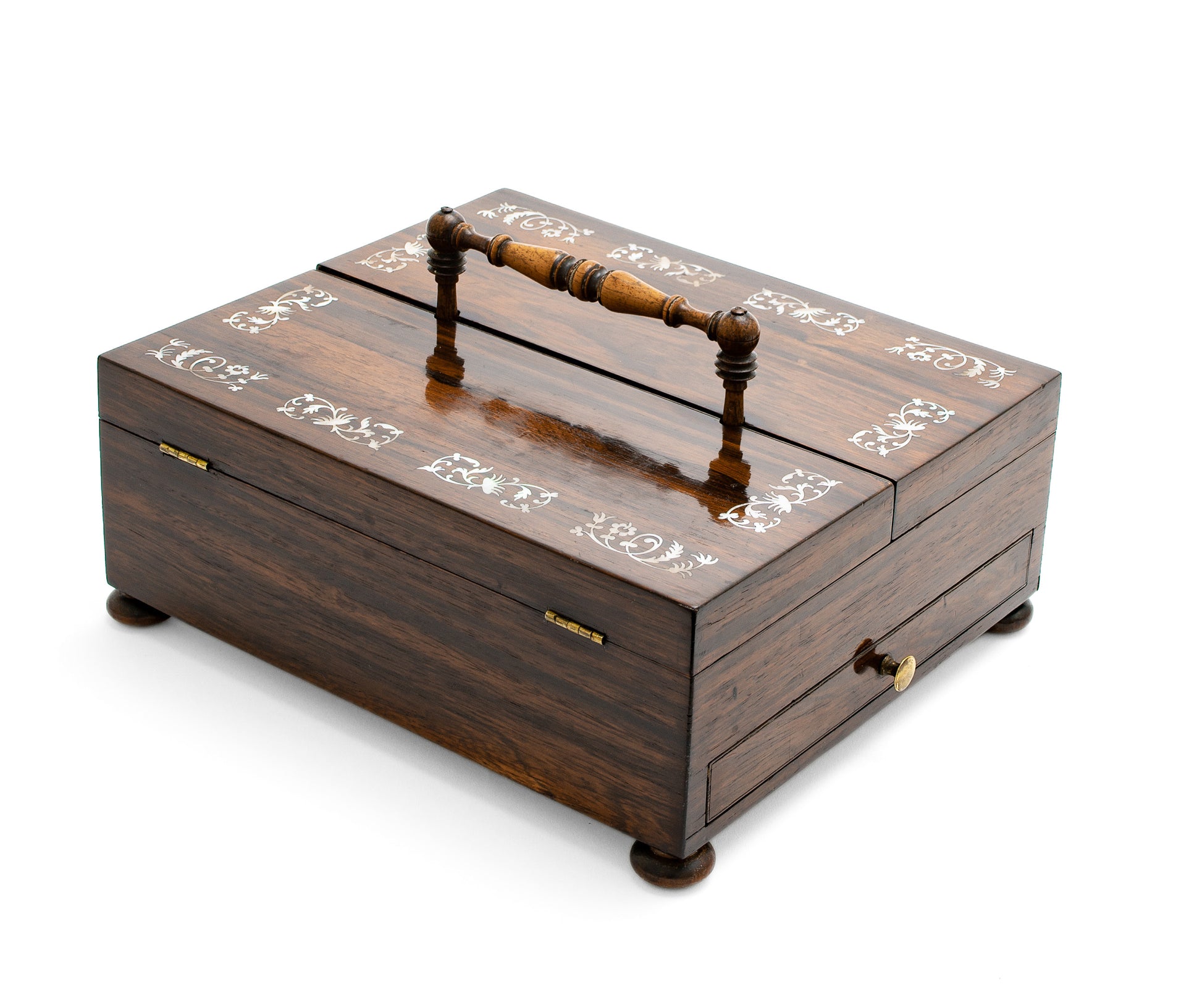 A Regency or William IV period rosewood portable inkstand & writing box. It features a turned wood carrying handle and flip opening lids. It also has a slim drawer to the lower part for documents, paper etc. To the lid it has inlaid mother-of-pearl detail to the lid in the 1830's style. The interior has two areas for pens, a central lidded reserve and two inkwell spaces. It comes with two brass lidded inkwells to complete the look. It is a fine looking stylish example and would make a great feature item in a study or period desk.