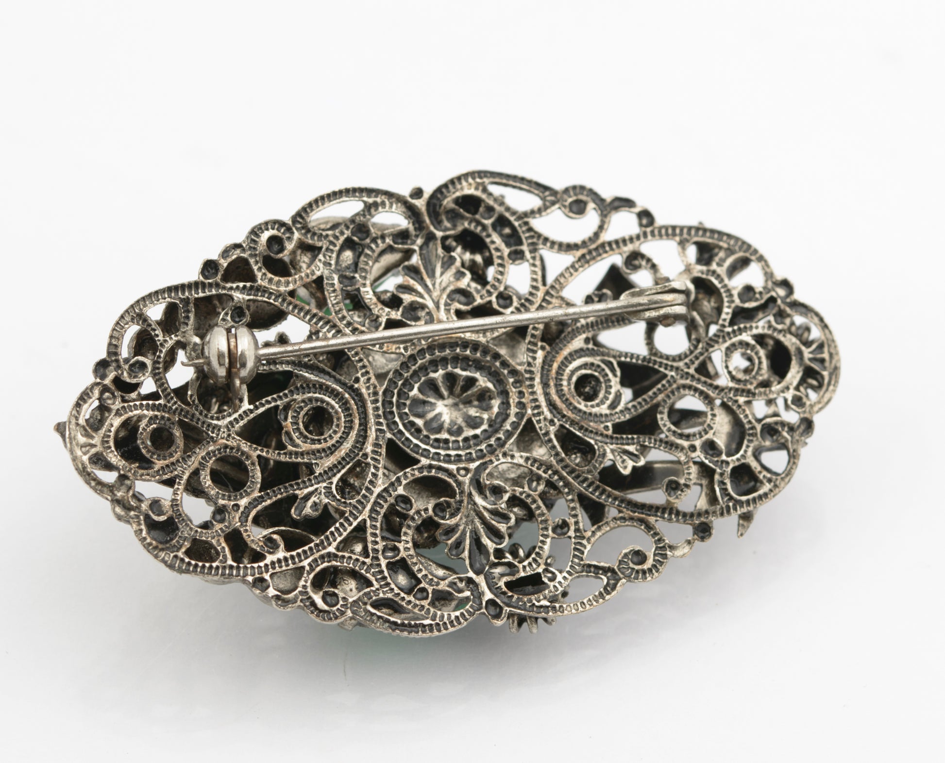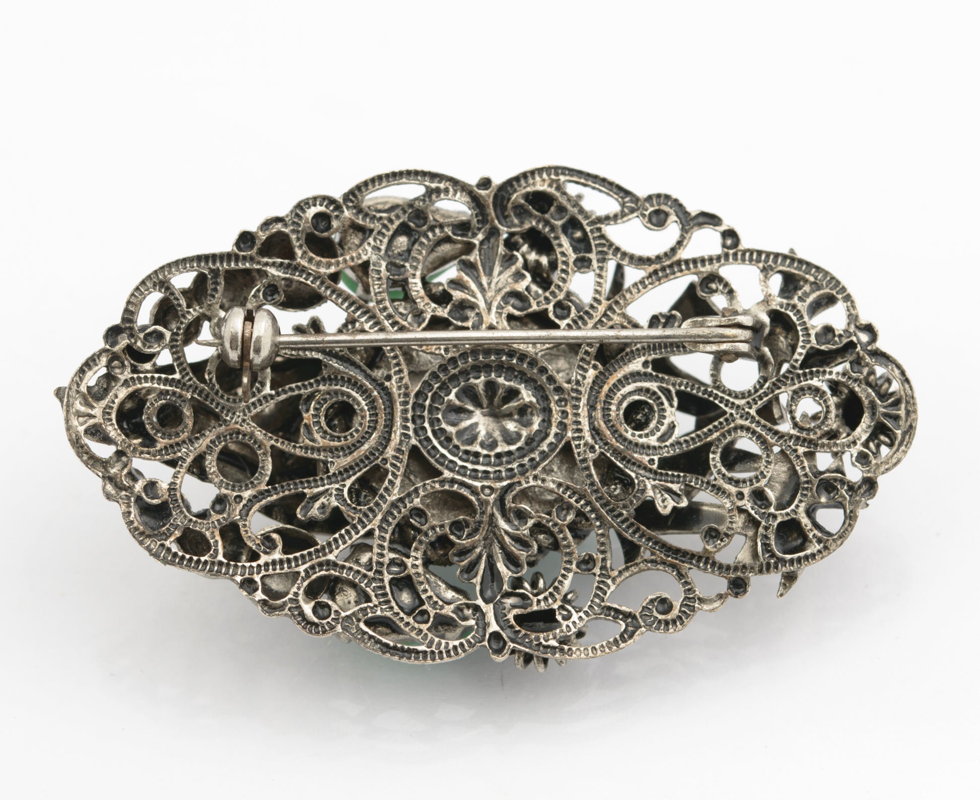 An antique Max Neiger brothers brooch dating around 1930. It is in pewter toned metal with milled detail to the backing plate. It is part of the jade dragon series and features a dragon head and three Czech glass 'jade' cabochons. The main cabochon is oval and the outer two are teardrop form. To the reverse it has a standard hinge pin and roll over clasp fixing.