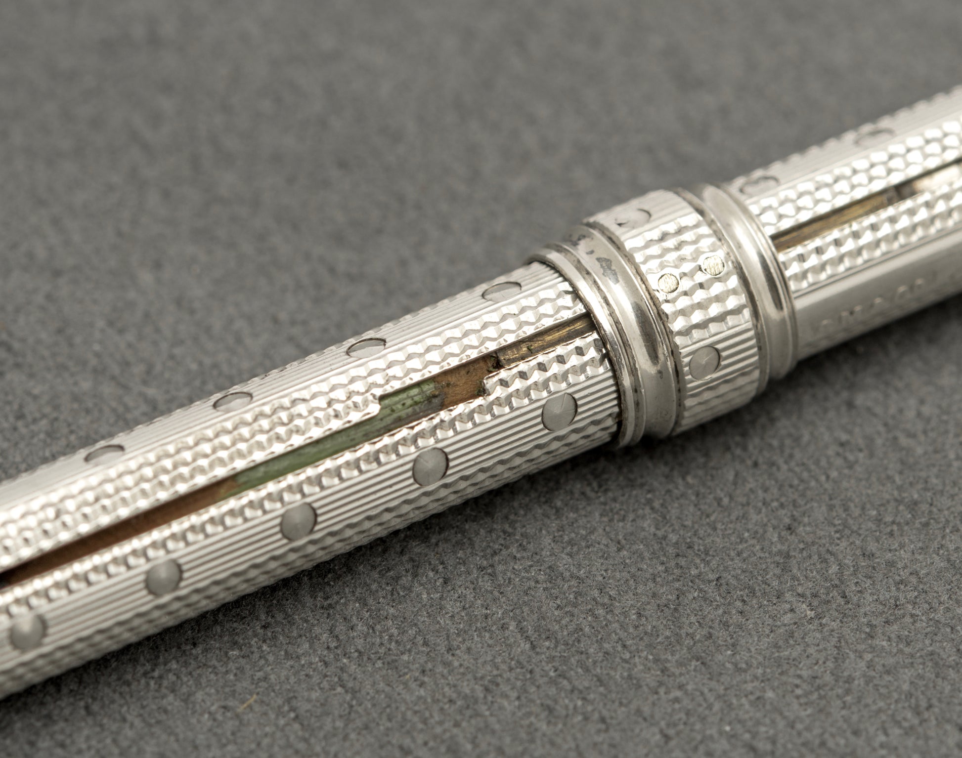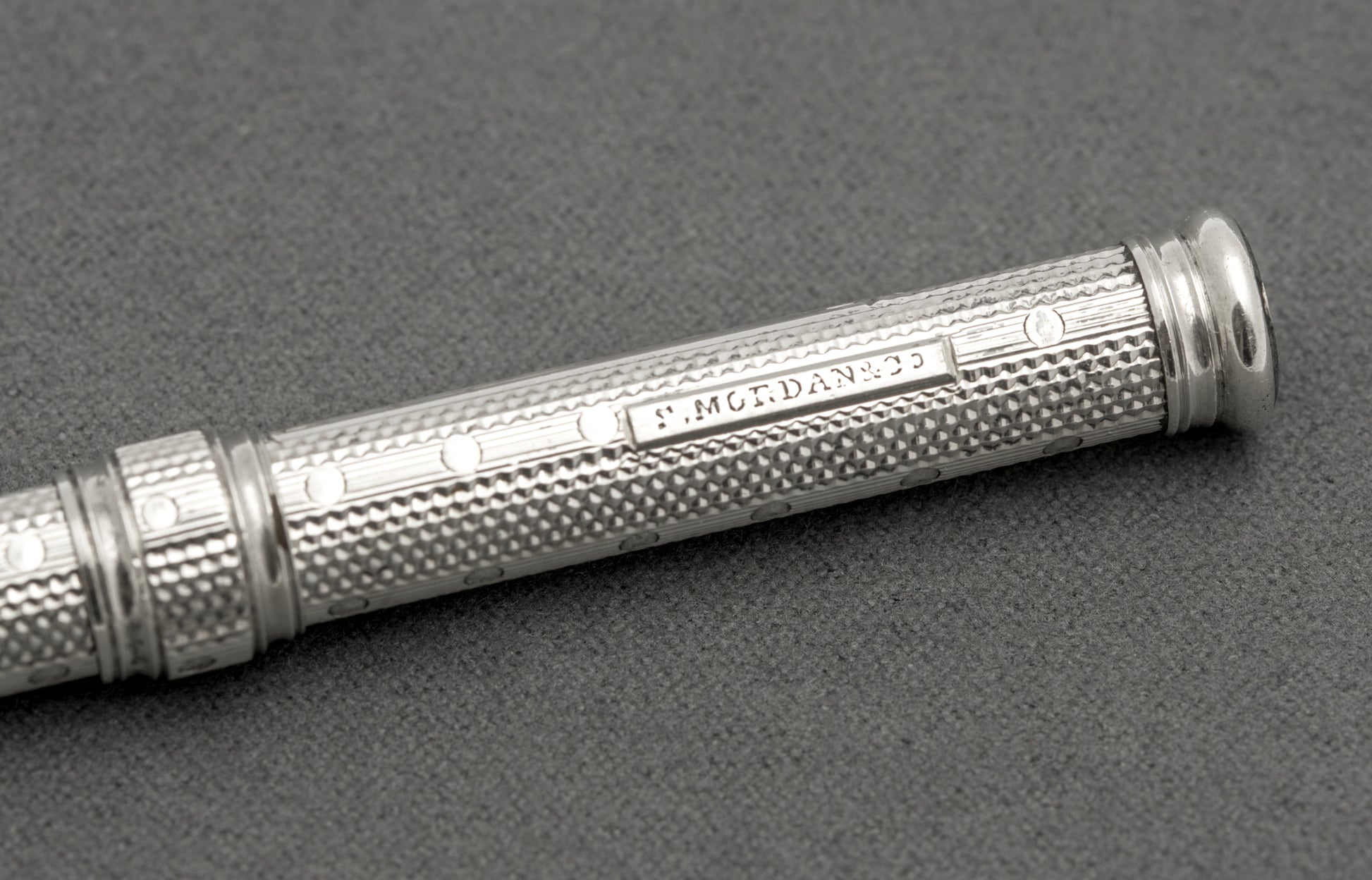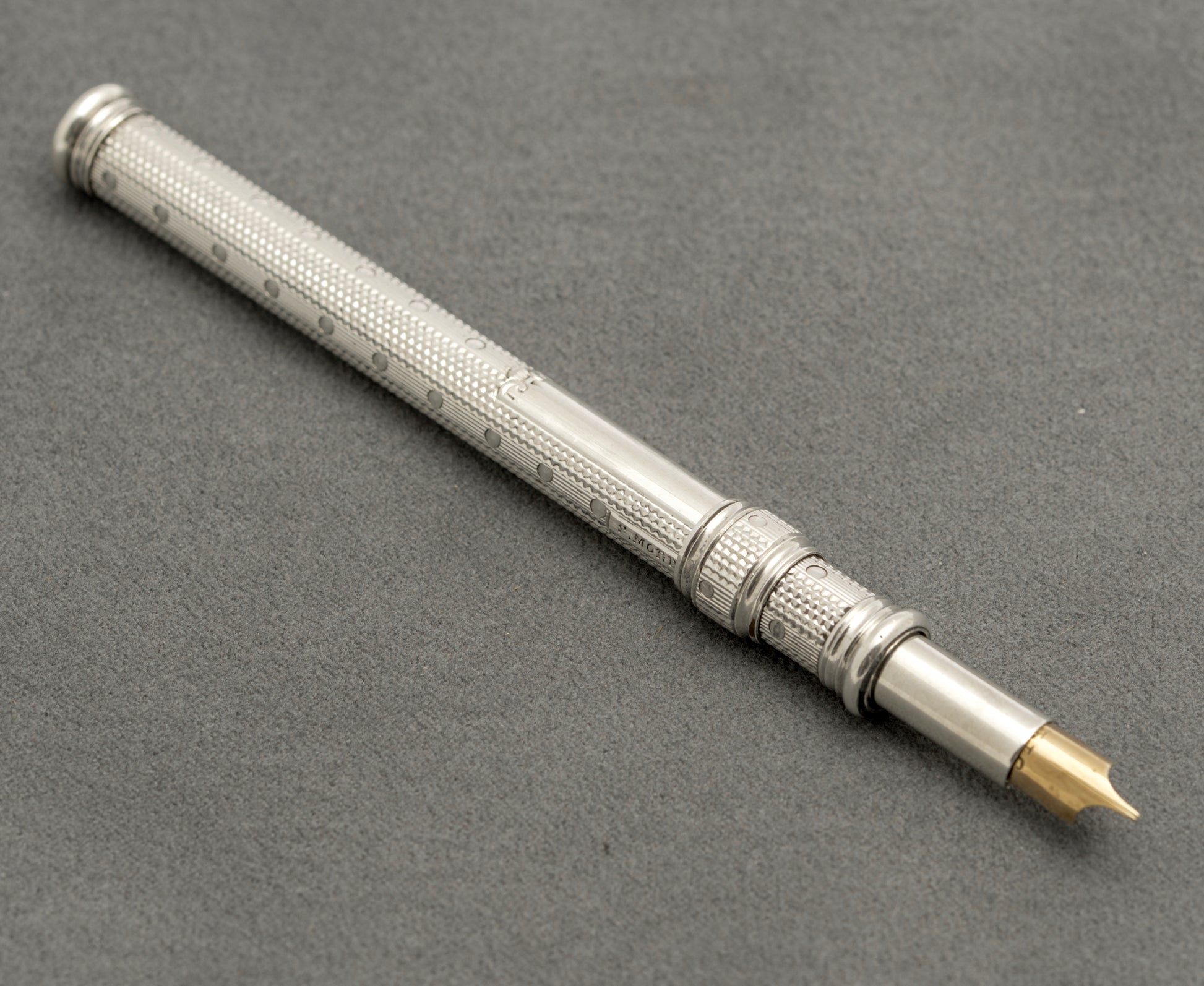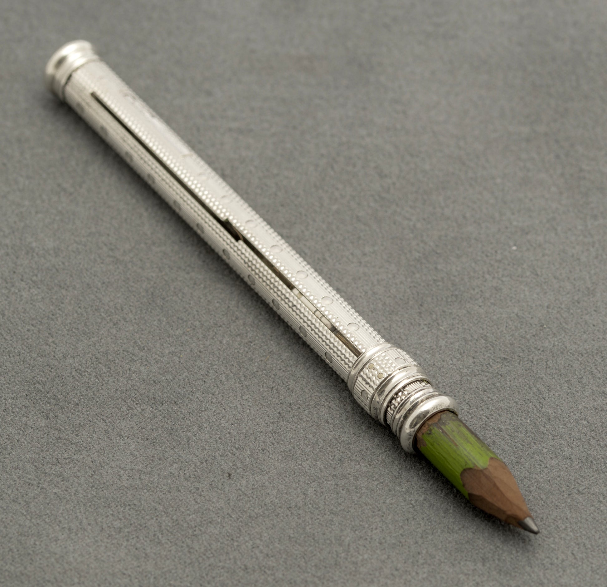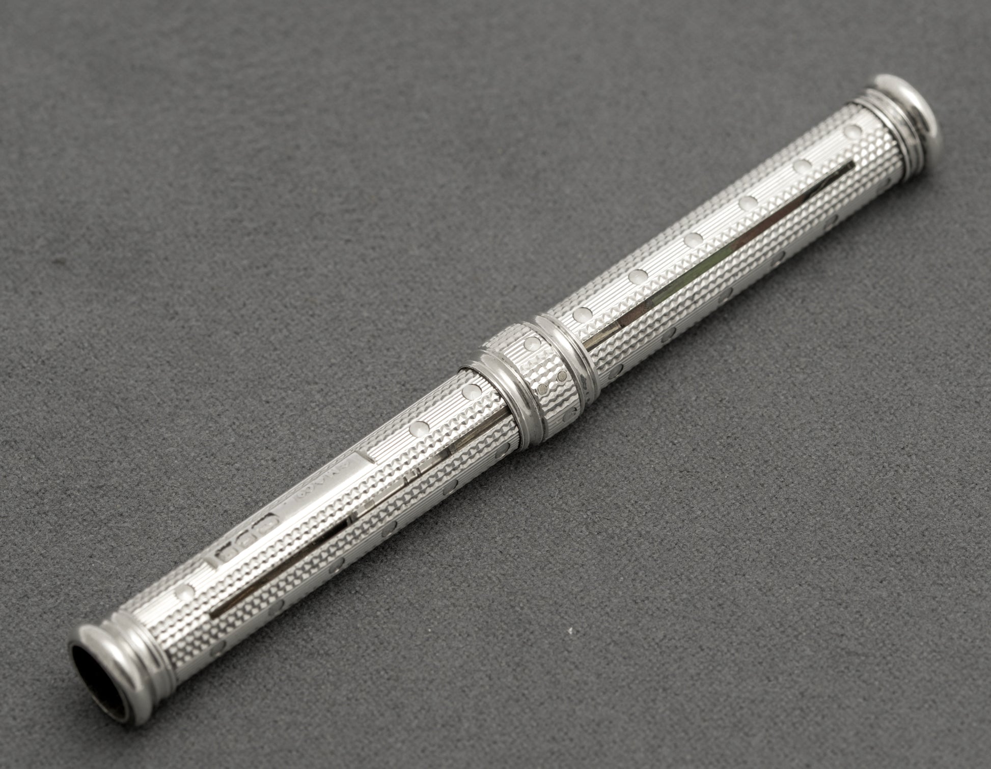 A very nice antique sterling silver Sampson Mordan double ended pen/pencil. It slides one way to reveal a dip pen which is furnished with an Esterbrook gold coloured nib. The collar then slides into the body to a stop point, makes a slight turn and then slides a pencil stub out the other side currently set with a small pencil stub. To the barrel it has a blank cartouche. There is a London hallmark with date letter for 1902 making this an Edwardian example. It also has the SM & Co. mark and also S Mordan & Co. The barrel is engine turned.