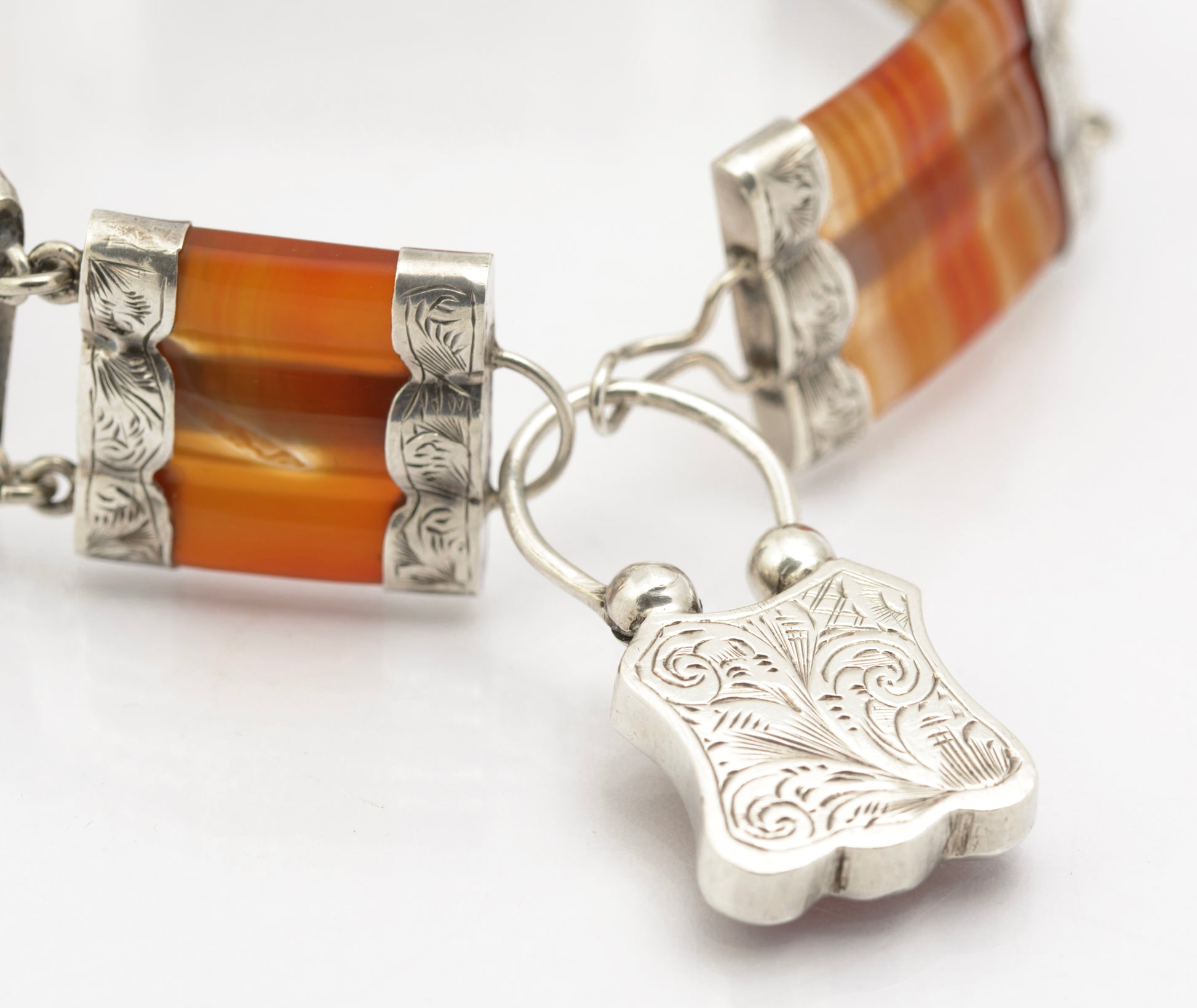 An antique Scottish sterling silver and agate bracelet. It has six agate panels which are carved and terminated with silver decorative ends. The clasp is in the shape of a padlock and has a compression closure which is working. The back of the clasp has chased detail and the front has an agate panel.