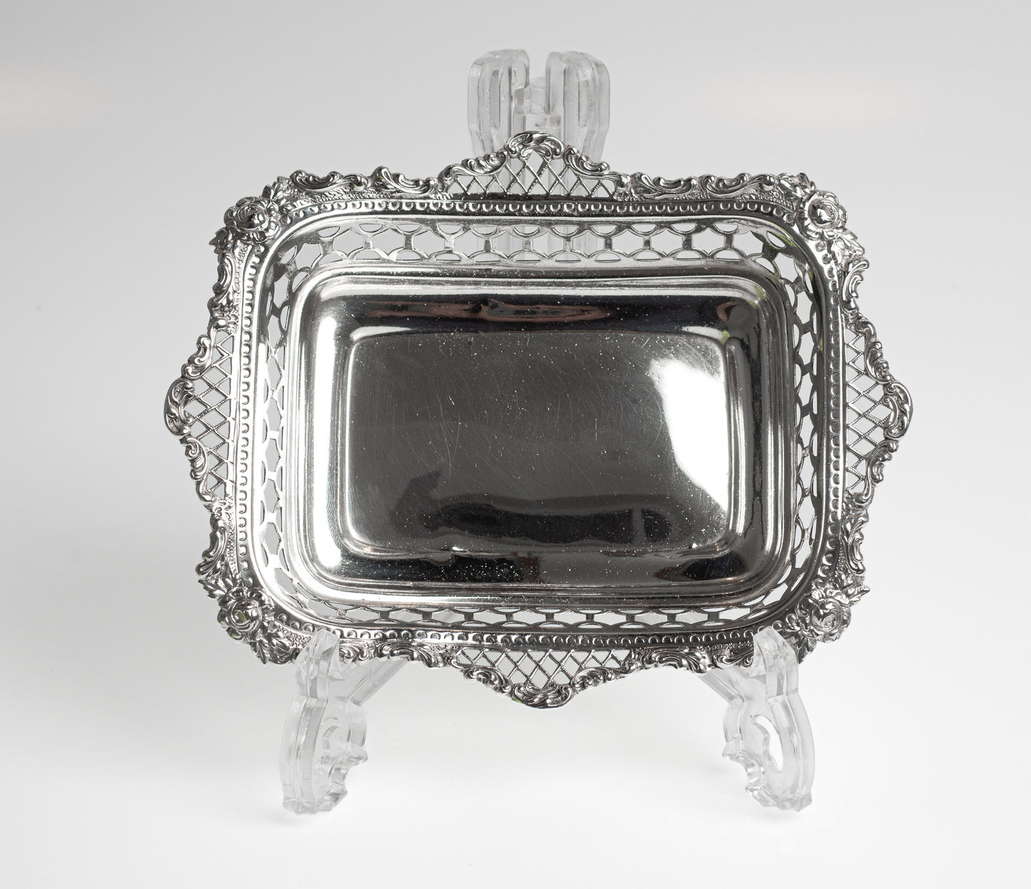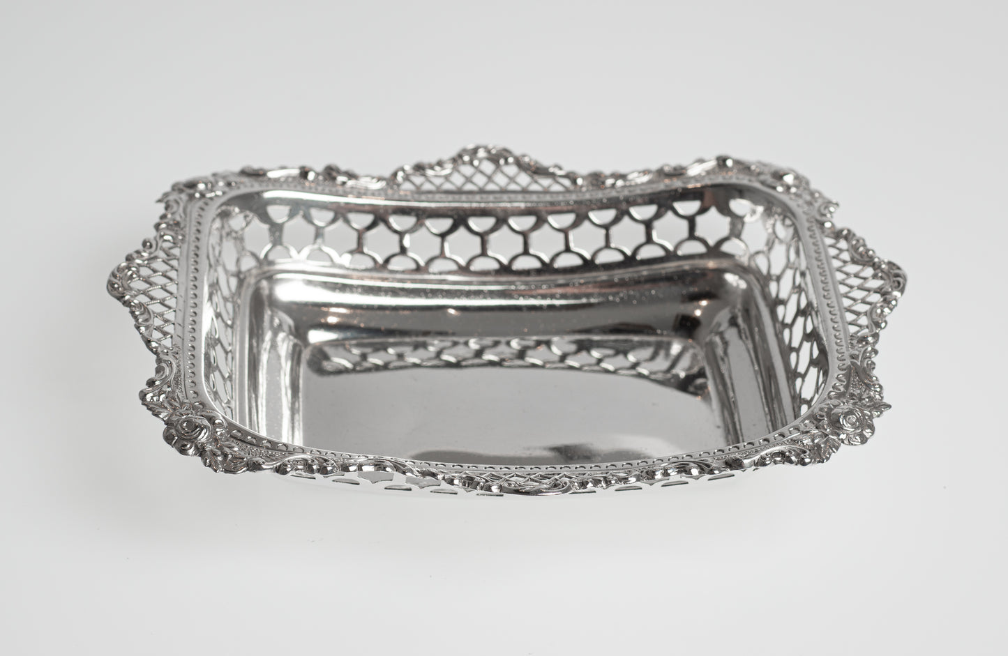 A late 19th century Victorian period silver dish. It has pierced work sides and decorative details around the rim with scroll and flower detail. The hallmark is for London 1897 and the makers mark is for William Comyns. It was likely intended for sweets etc, but can of course be used for many purposes.
