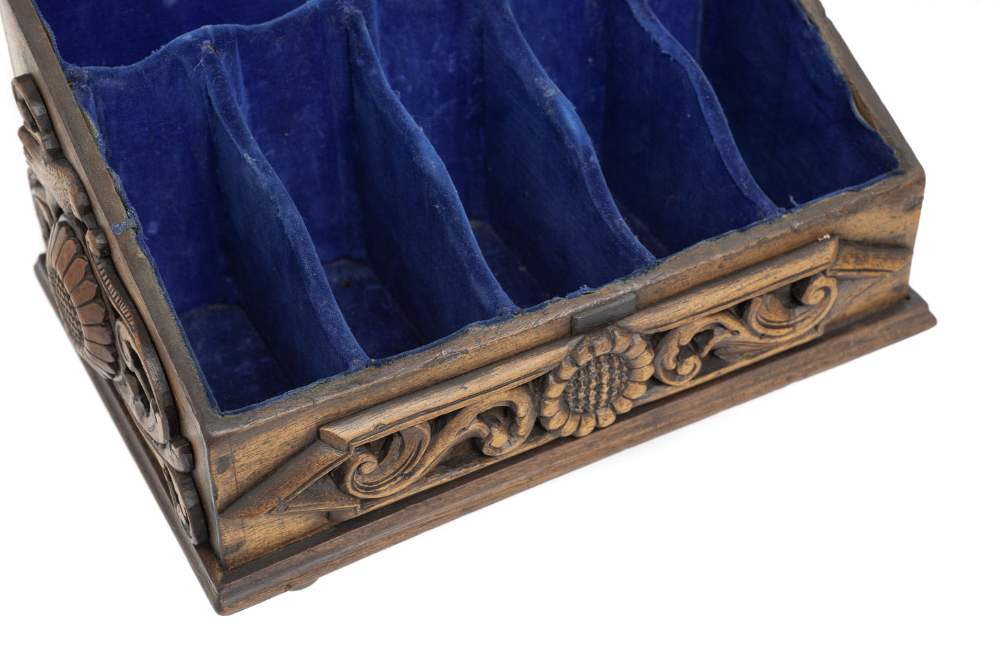 An interesting antique wooden box with carvings and a very unusual lock. The style is Spanish from the early to mid 19th century and it is likely the box is from this region. We suspect some of the elements including the base form of the box may be earlier and that it was made into this final form around 1840-60. The carvings are applied to the box rather than being blind carved from the wood, the moon faced birds are particularly unusual. The box is of wedge form with internal divisions lined with blue velvet. The wood appears to be walnut.