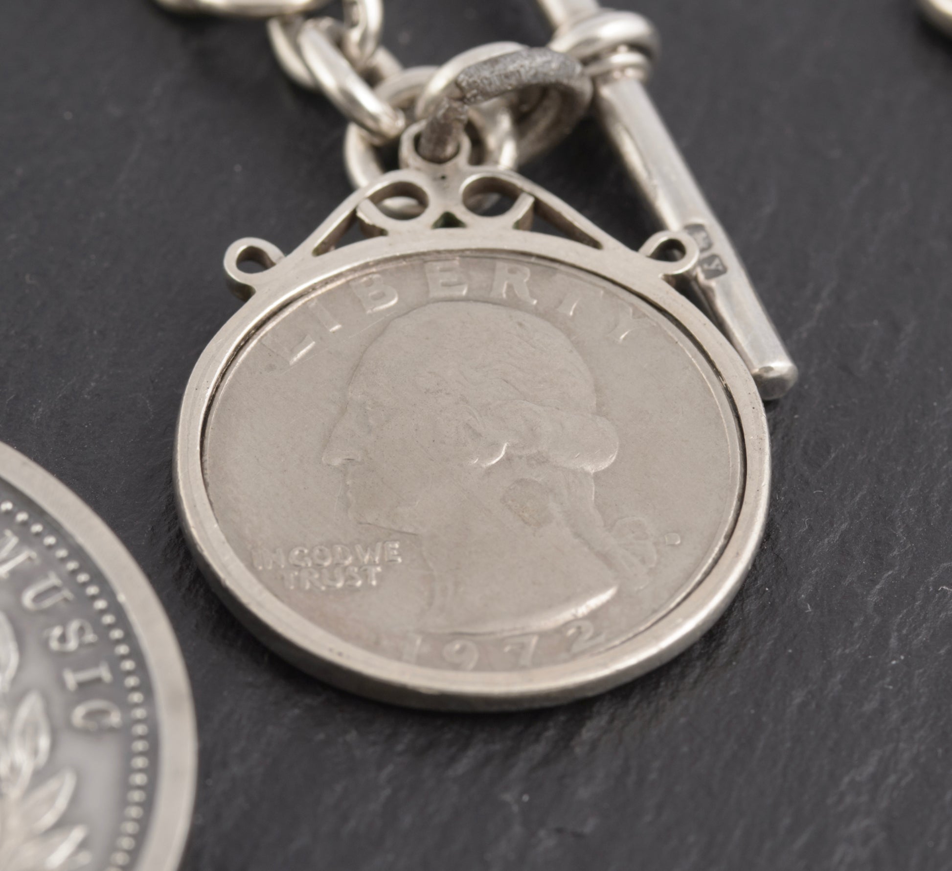 Antique Sterling Silver Albert Watch Chain 1/4 Dollar & Royal Academy Medal (C2774)