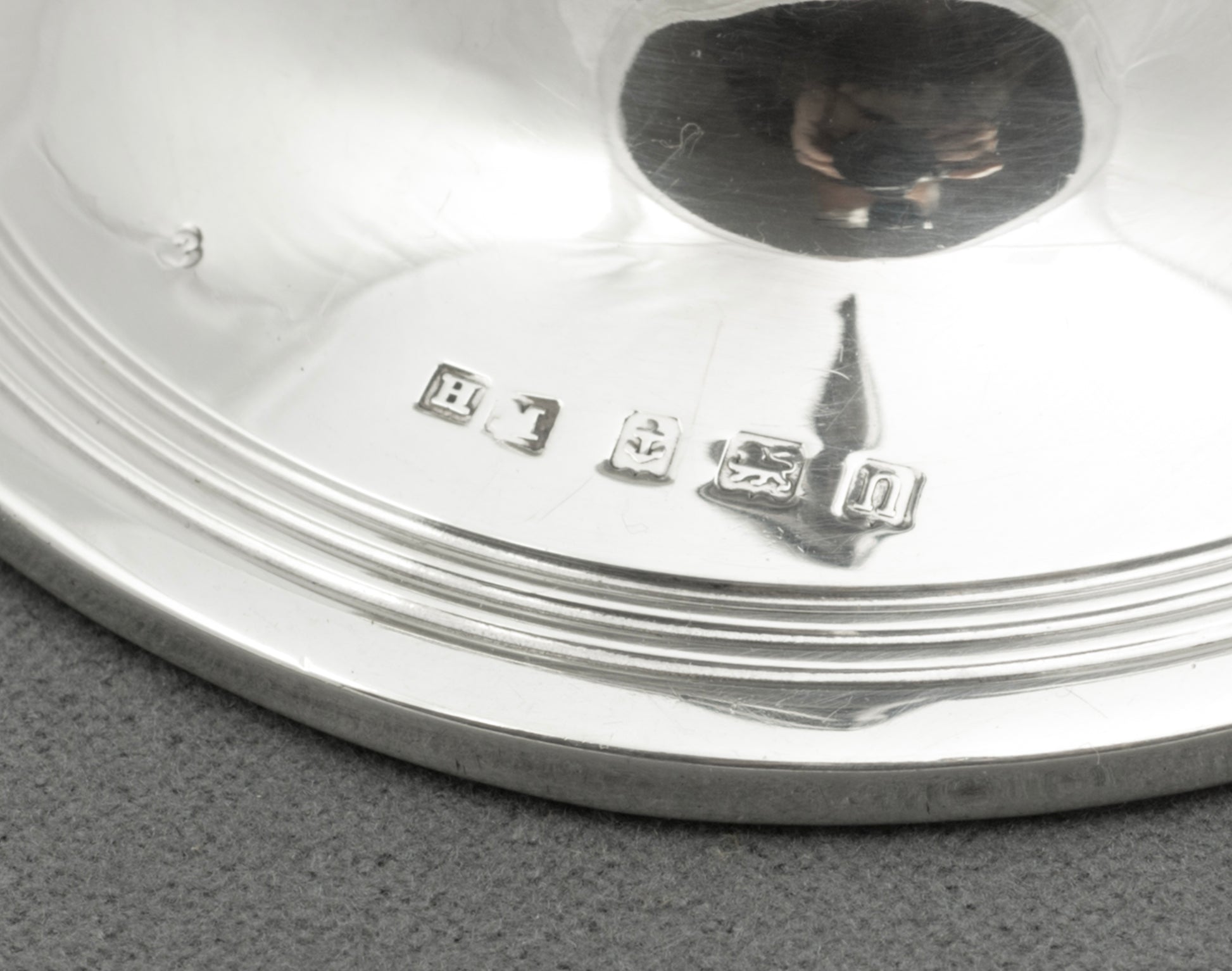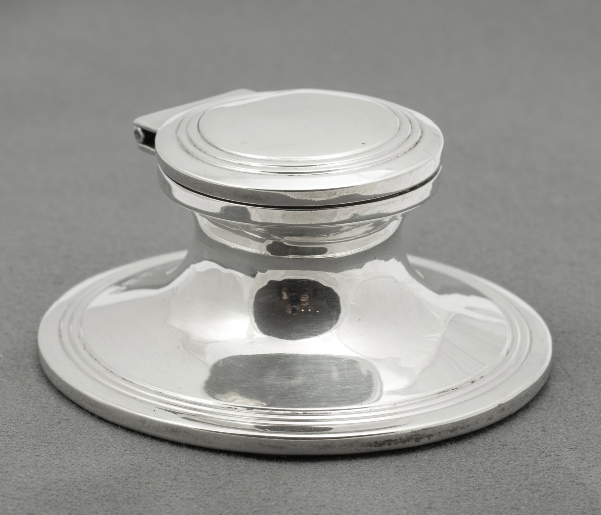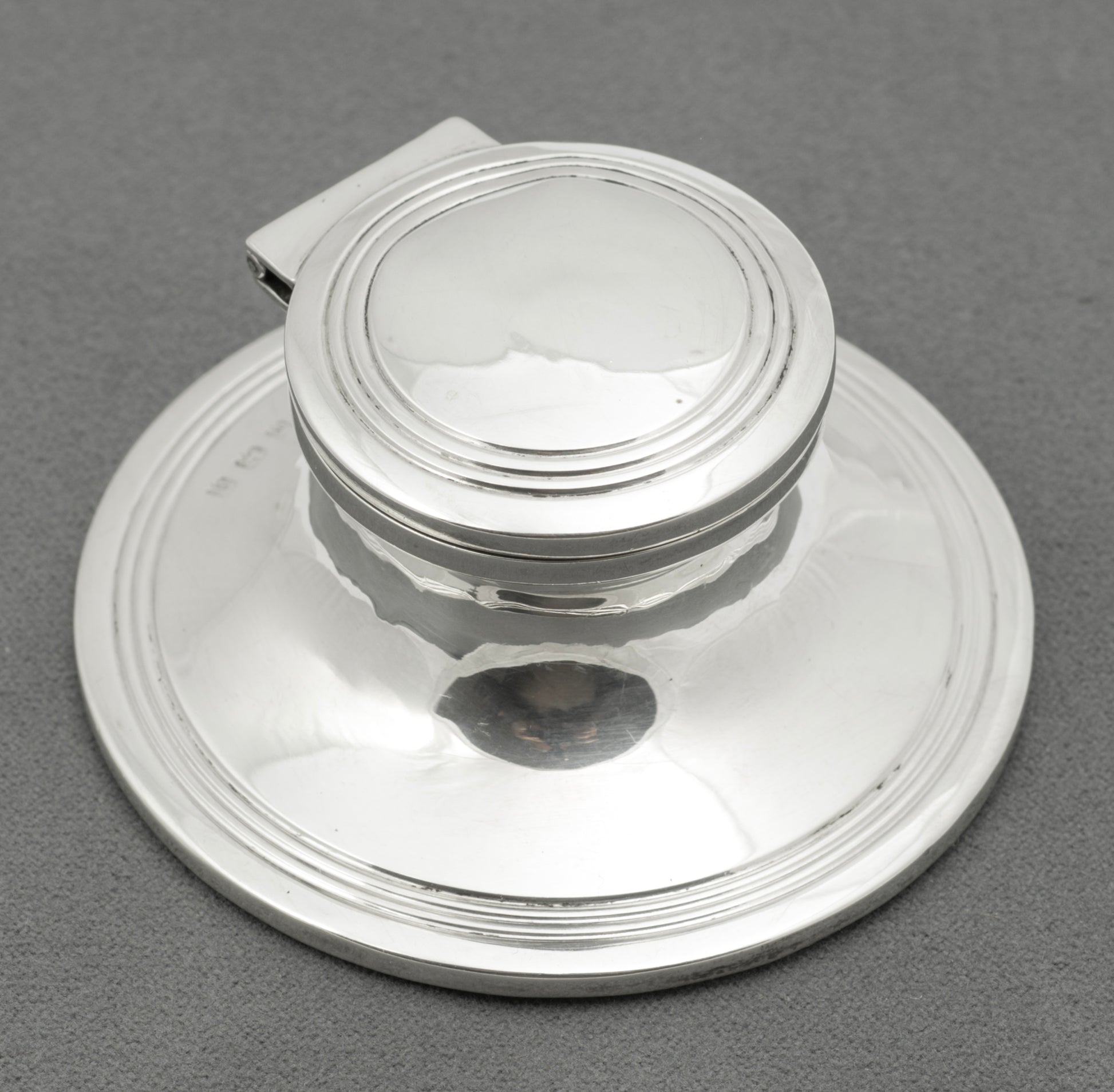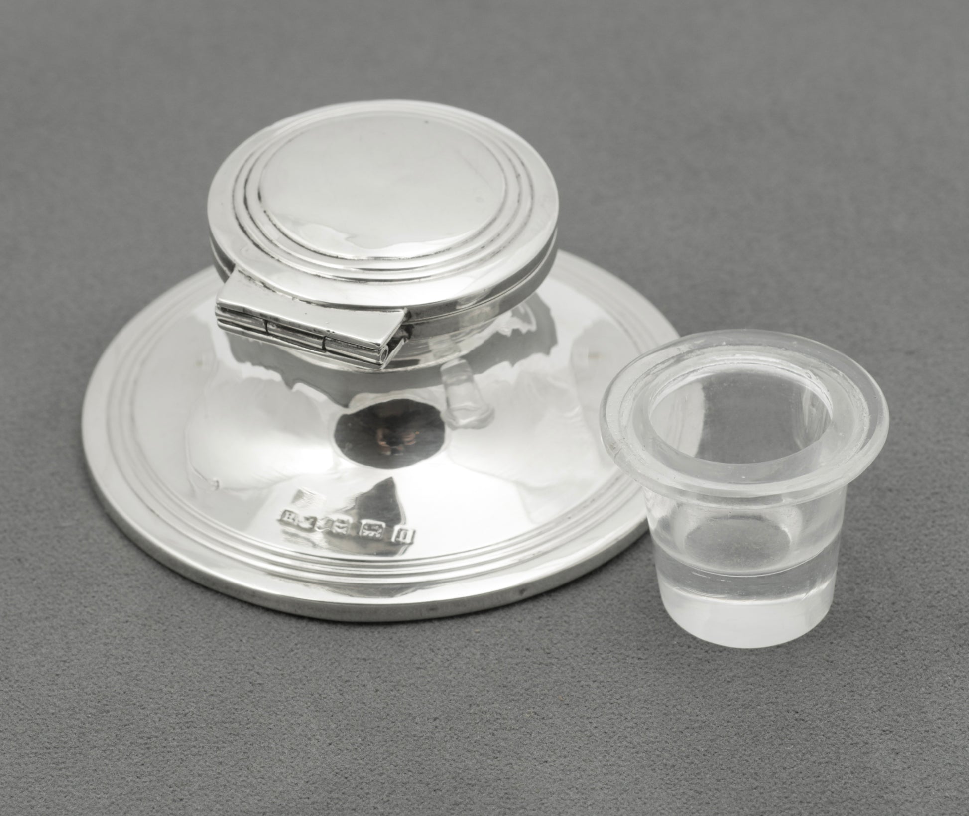 A very sweet early 20th century inkwell in sterling silver. It is of capstan design and weighted so it is very difficult to knock over. The hinged lid opens to reveal a clear glass liner. It is hallmarked from the Birmingham assay office with date letter for 1912. The makers mark is for Henry Matthews, a well known silversmiths of the period.