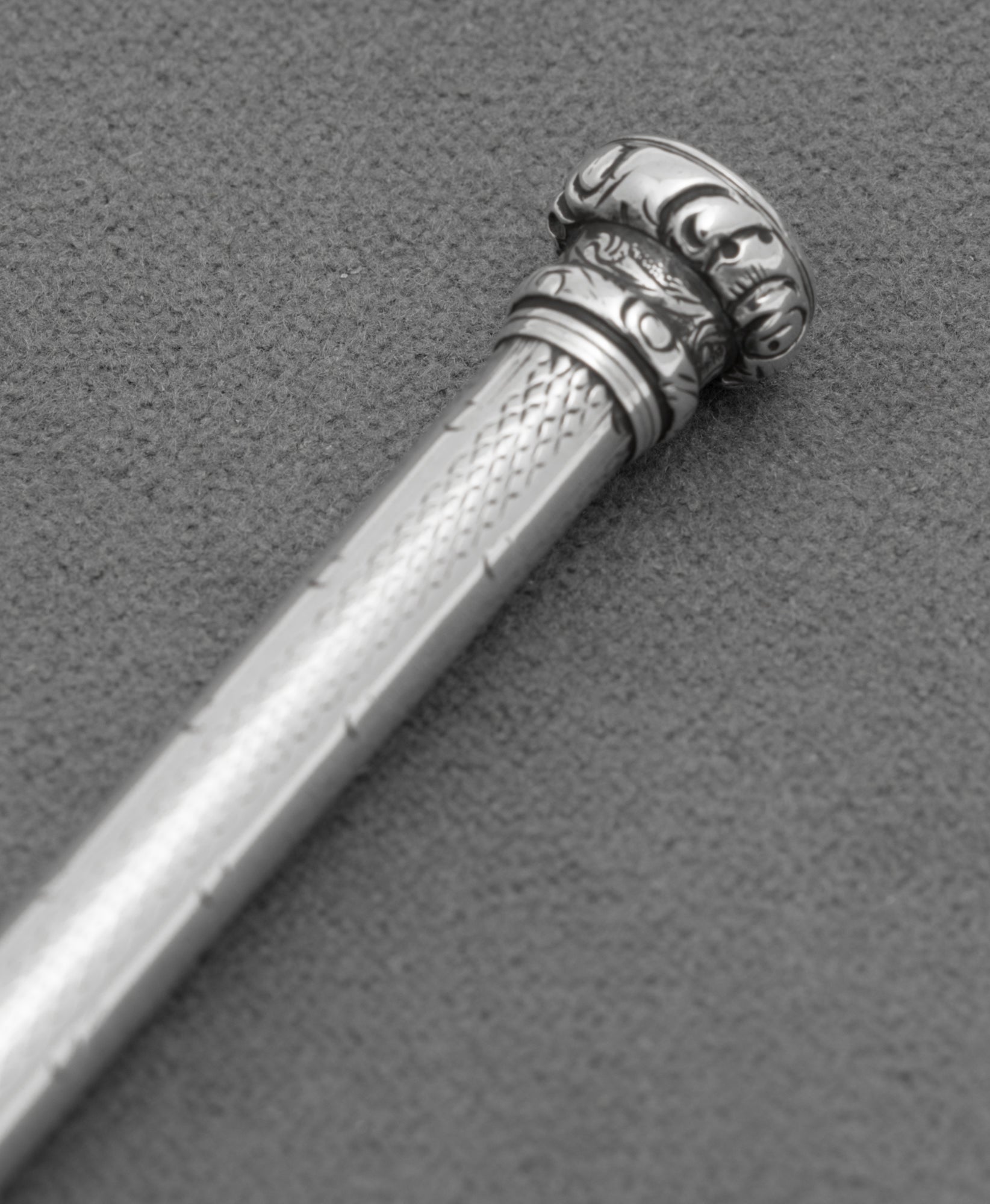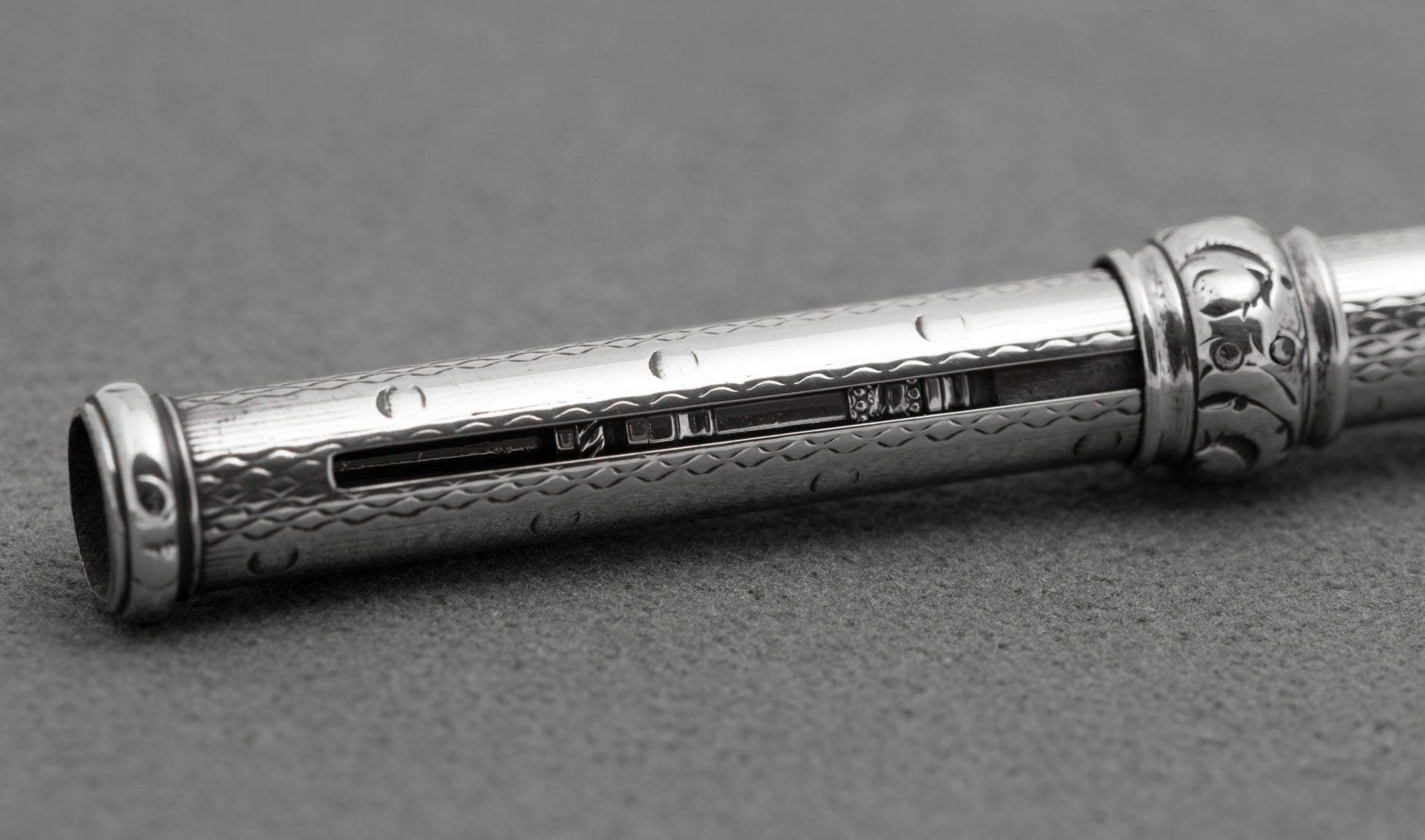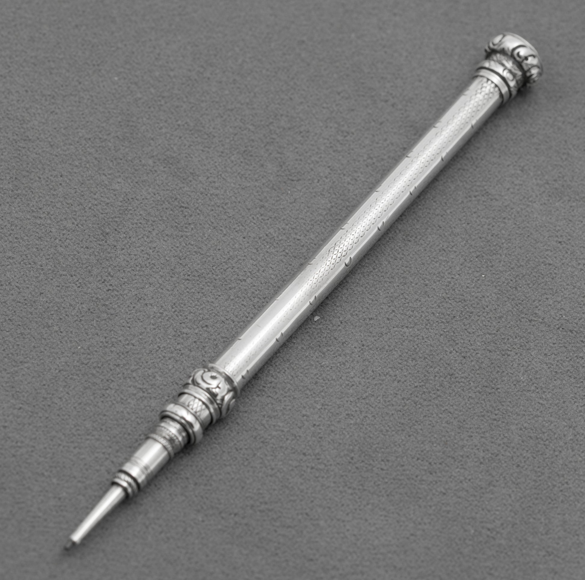 Very good for period with some softening of the detail through use. Slide action smooth and propelling mechanism working fine. Not hallmarked but tests as sterling silver. Some lead in place.