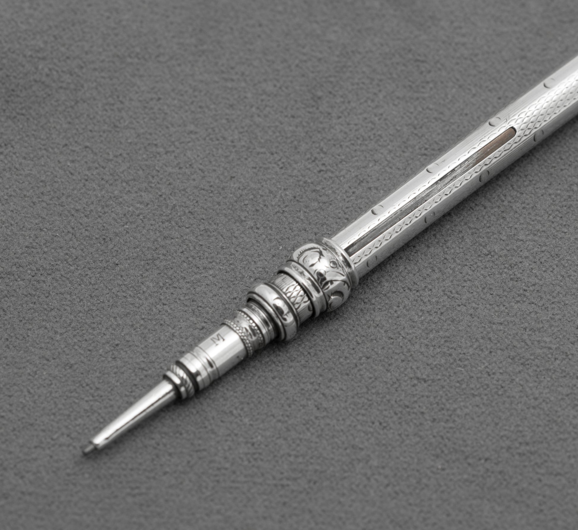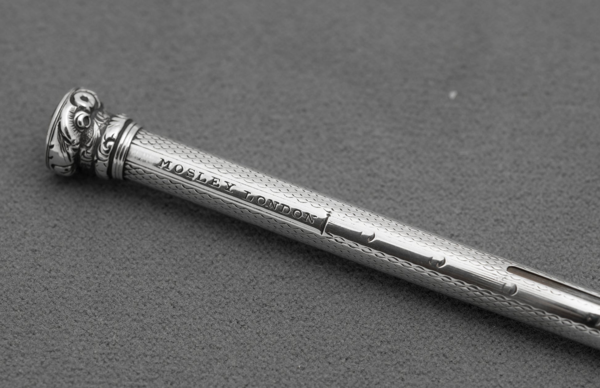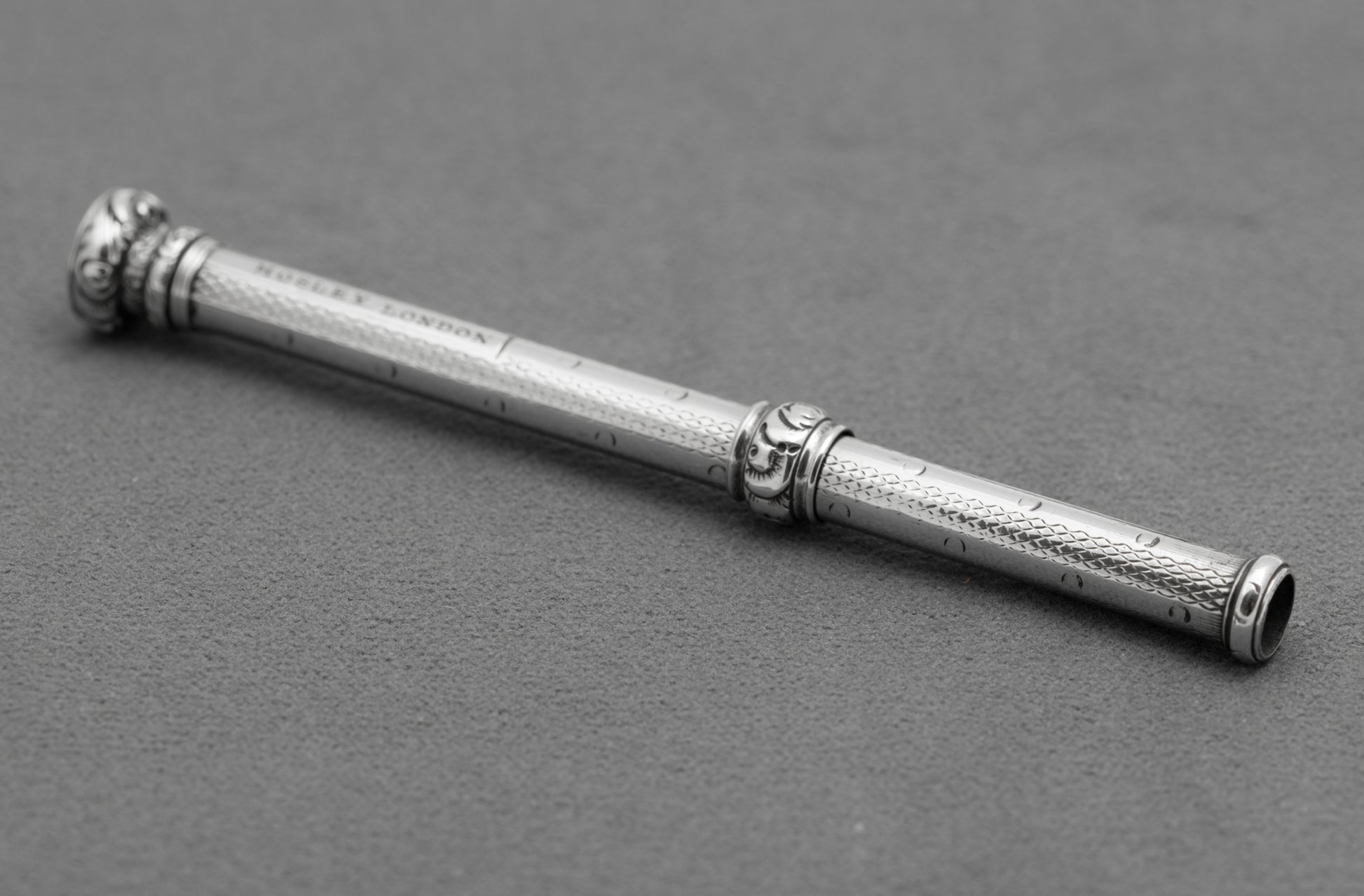 A scarce early design mechanical pencil by Richard Mosley of London dating c.1840 (William IV or early Victorian). It has a sliding action to reveal the tip and then it has a twist action to propel the lead. The push back is manual.