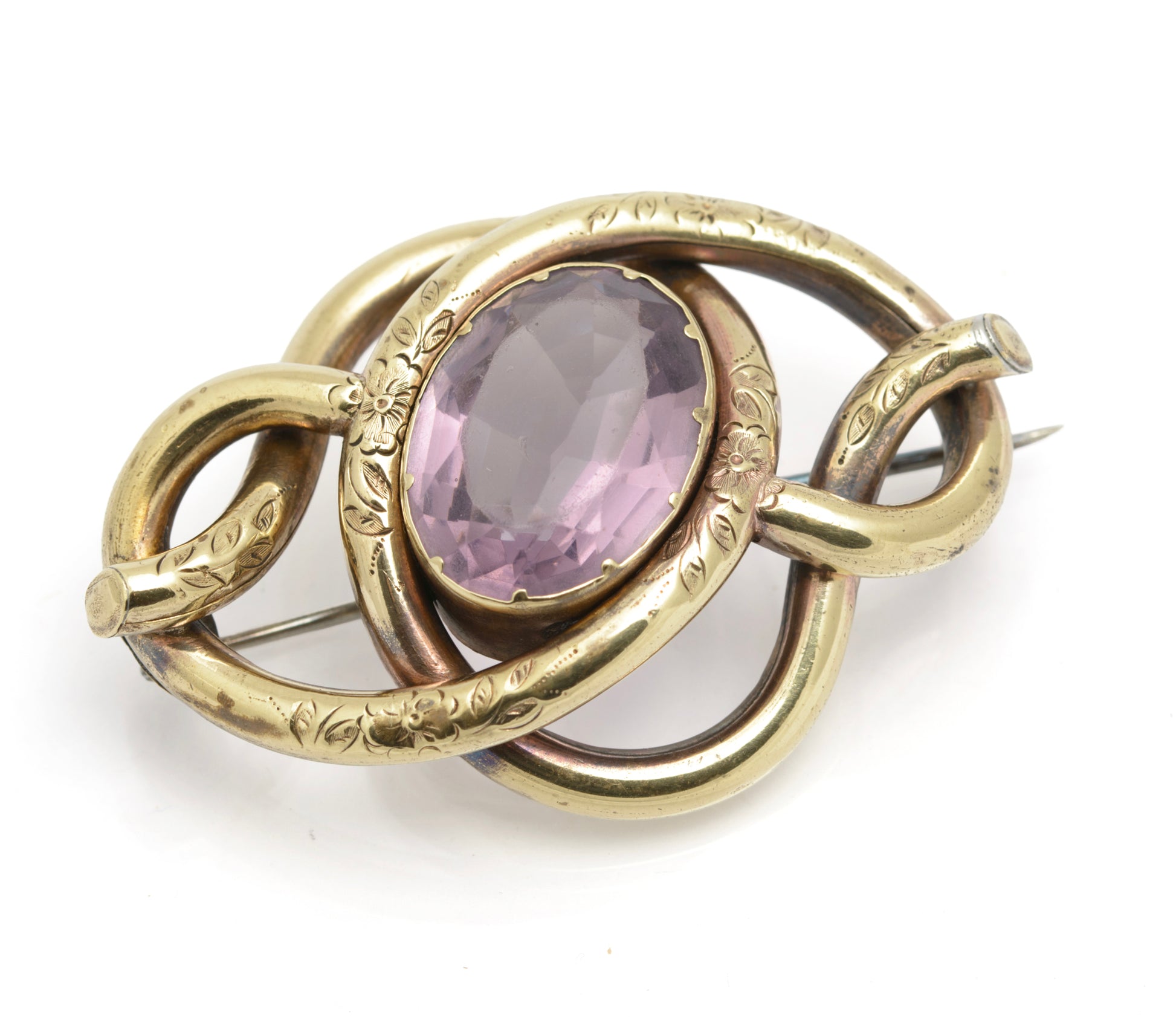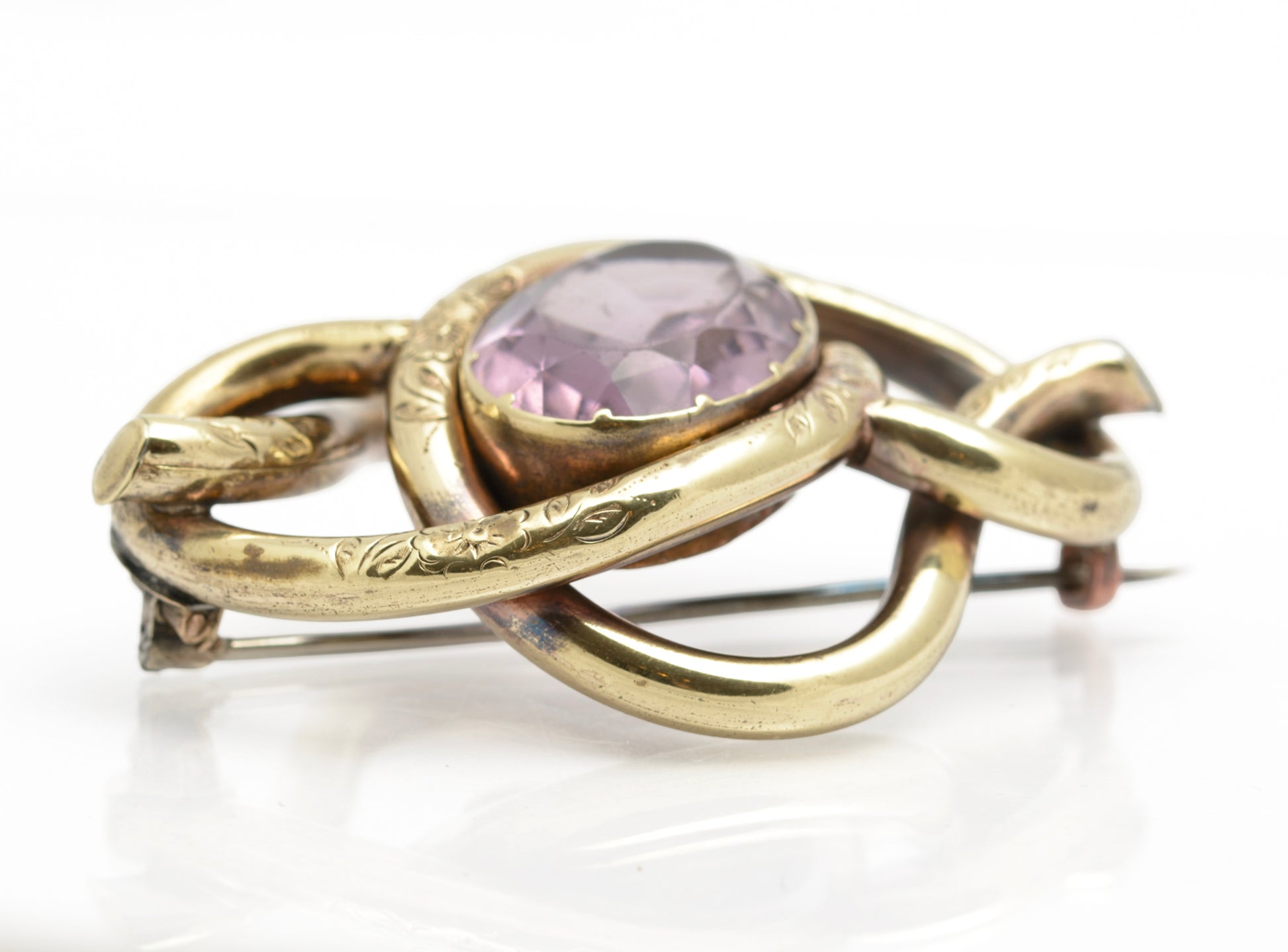 A large lovers knot brooch in pinchbeck type metal dating to the Victorian period c.1880. Tubular style body with a large paste glass central gem in a purple tone emulating an amethyst. Standard hinge pin fixing to the back which is working fine. No makers marks which is correct for this type of item.