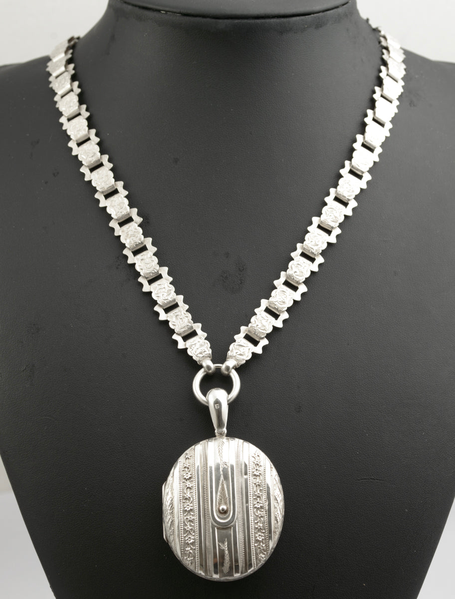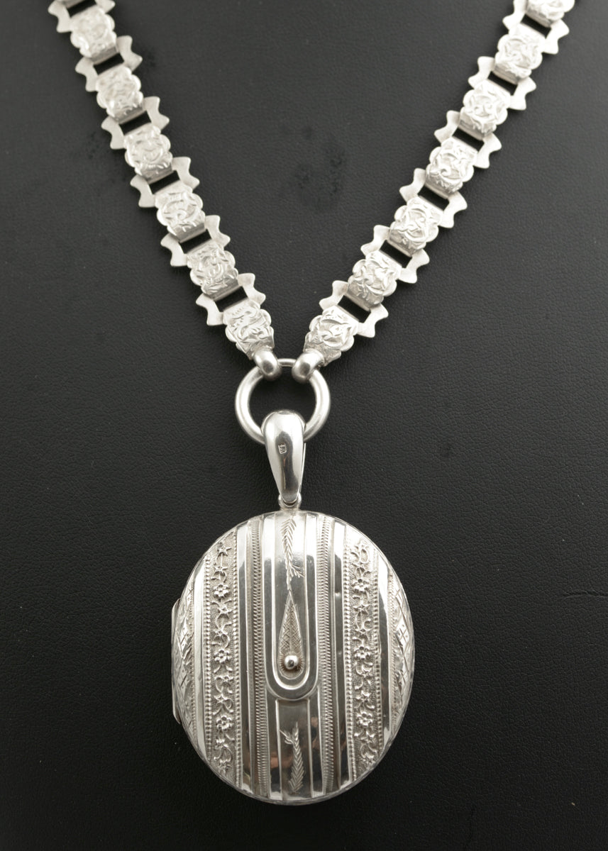 A wonderful Victorian large sterling silver locket on a book chain. The locket has vertical details with floral bands and geometric designs. To the back the locket has a hallmark from the Birmingham assay office with date letter for 1881. The chain is not marked but also tests as sterling silver. Inside the locket there is one glazed panel with a retention ring which has the lion silver mark. The other side is just an open area. The locket also has a bale which has the lion silver mark.