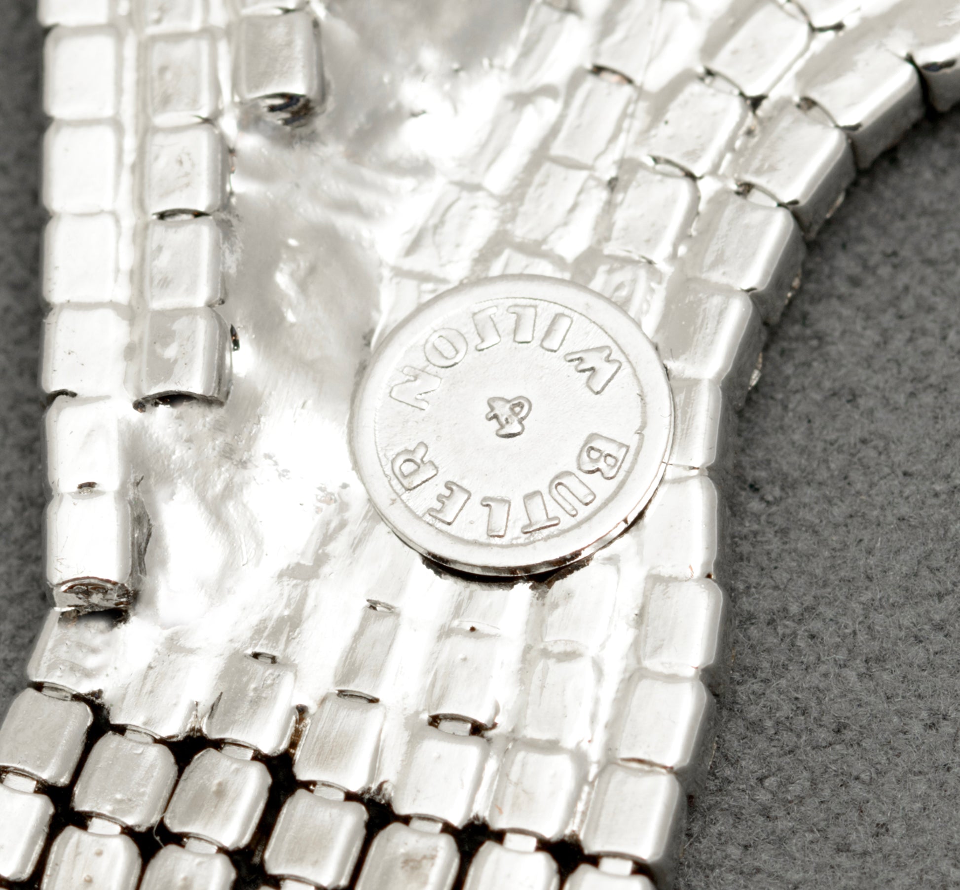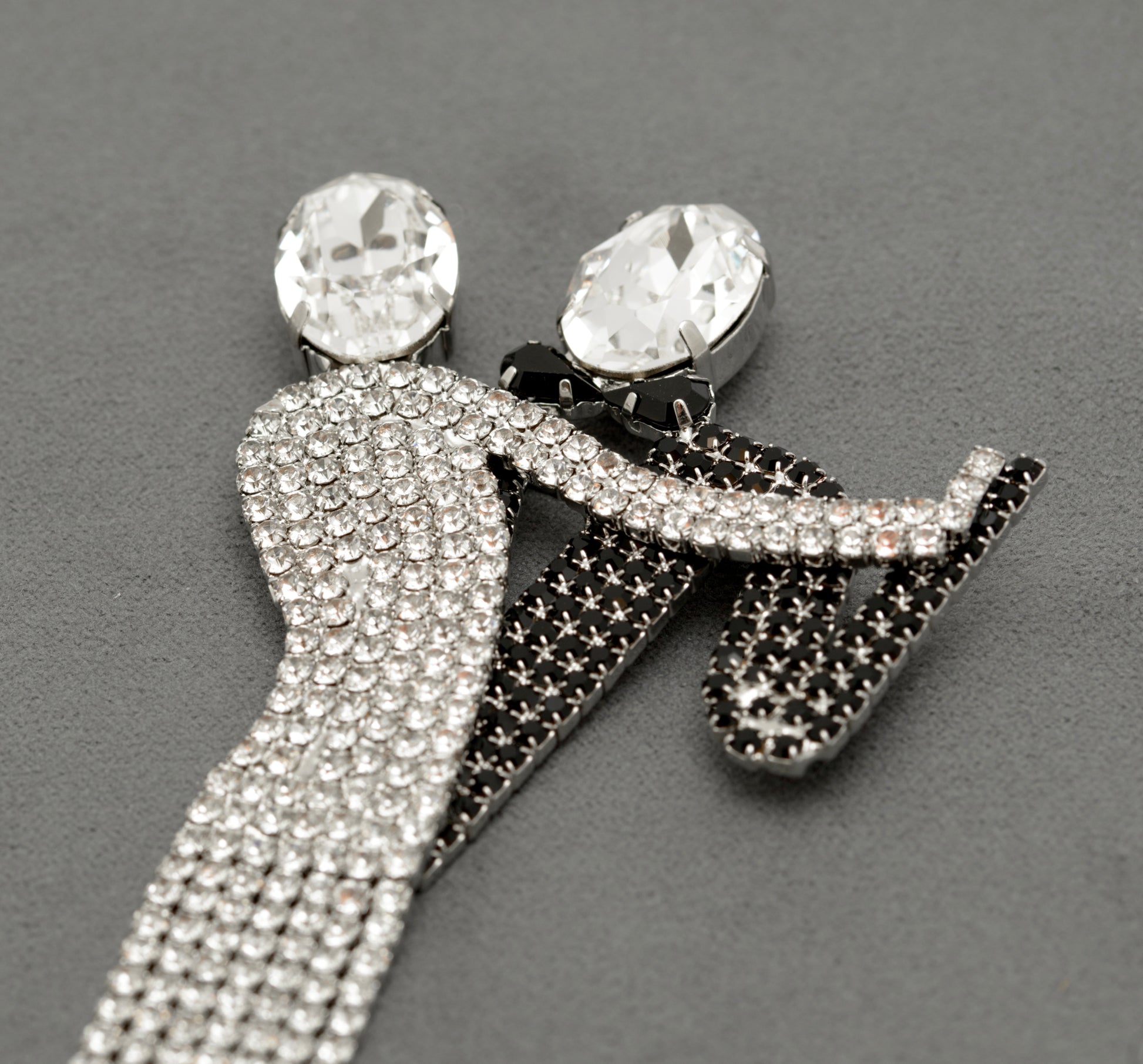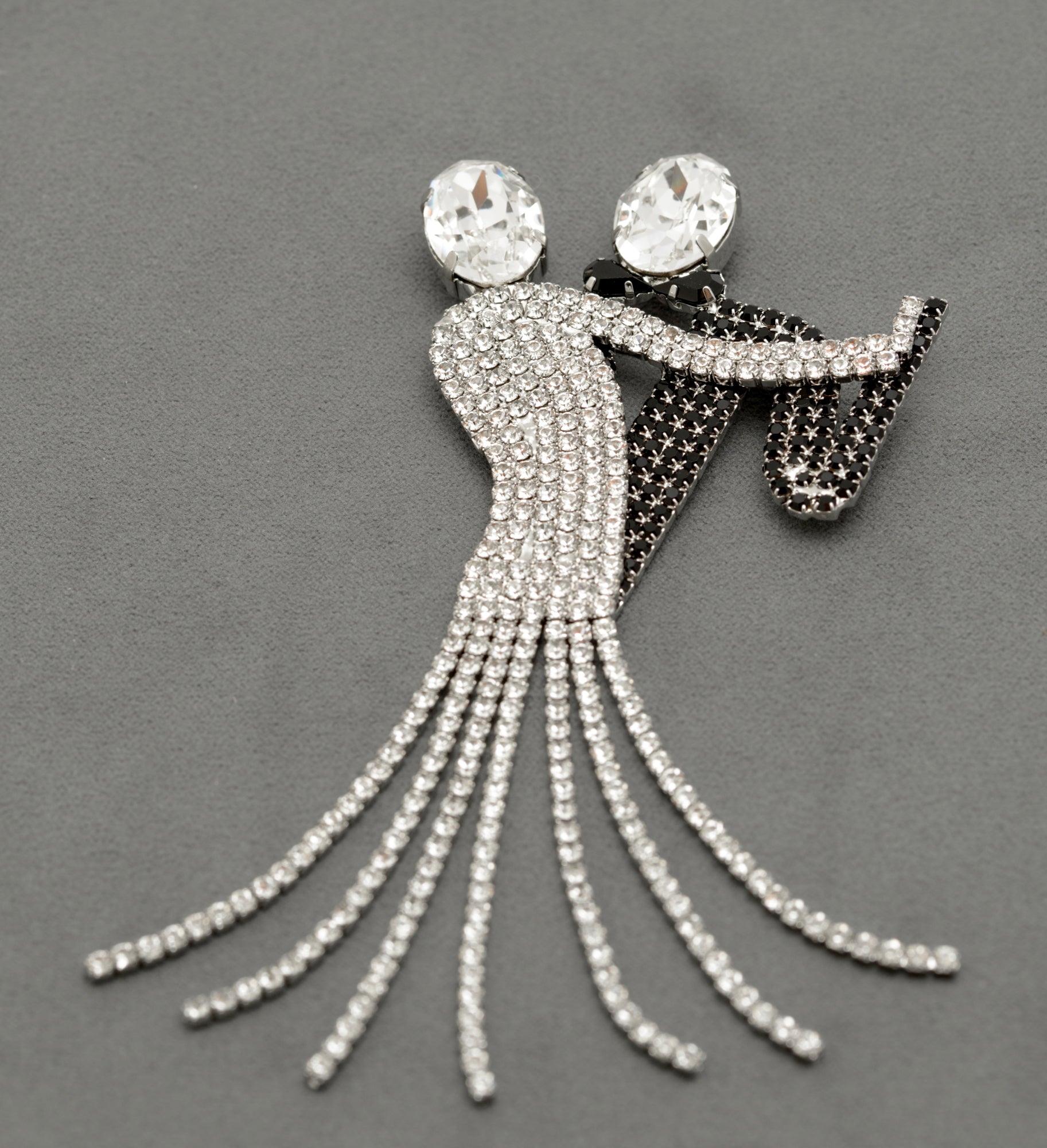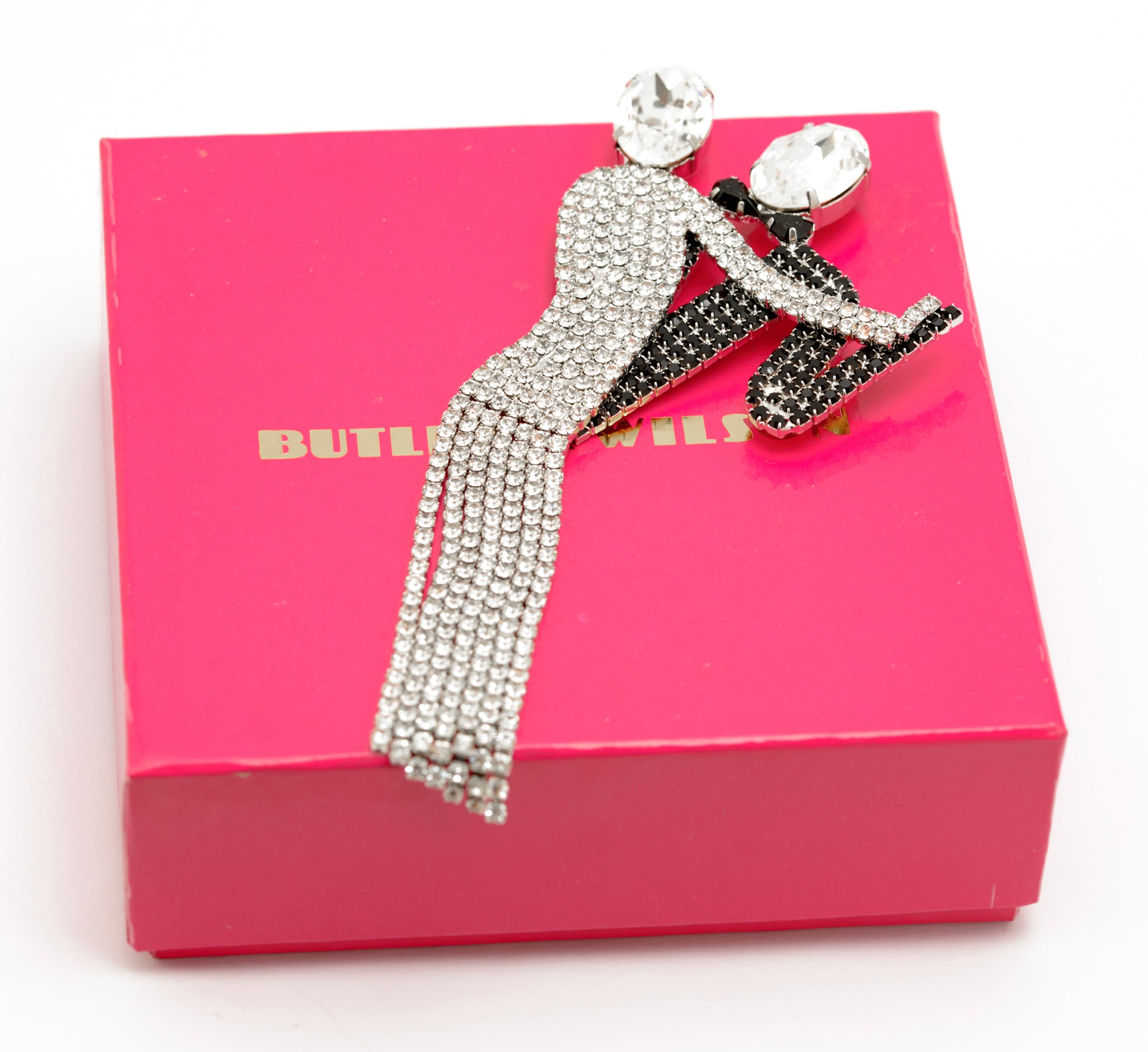 A Butler & Wilson brooch in the form of a couple ballroom dancing. They have large clear crystals for heads. The lady is set in clear crystals and the man in black crystals with bow tie. The setting is silver toned and it has a safety roll over catch fixing. To the reverse it has the Butler & Wilson button mark. The lower half of the 'dress' is formed from seven articulated strands giving movement to the piece.