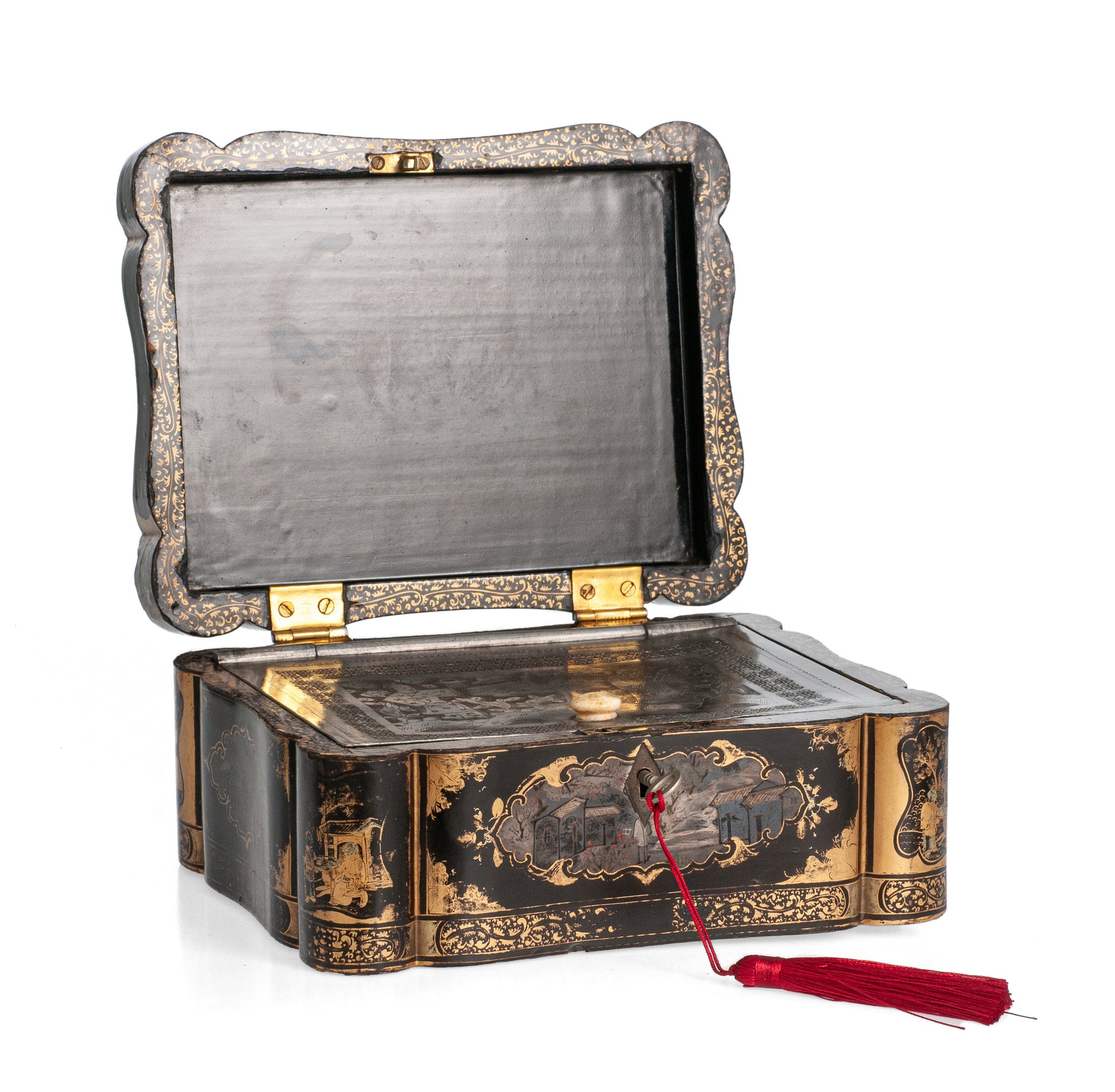 The lid opens to reveal the interior edges also painted with gilt patterns. It has a large internal hinged lid chased with Chinese characters and a pattern border. This inner lid opens to reveal a plain lead lined interior.