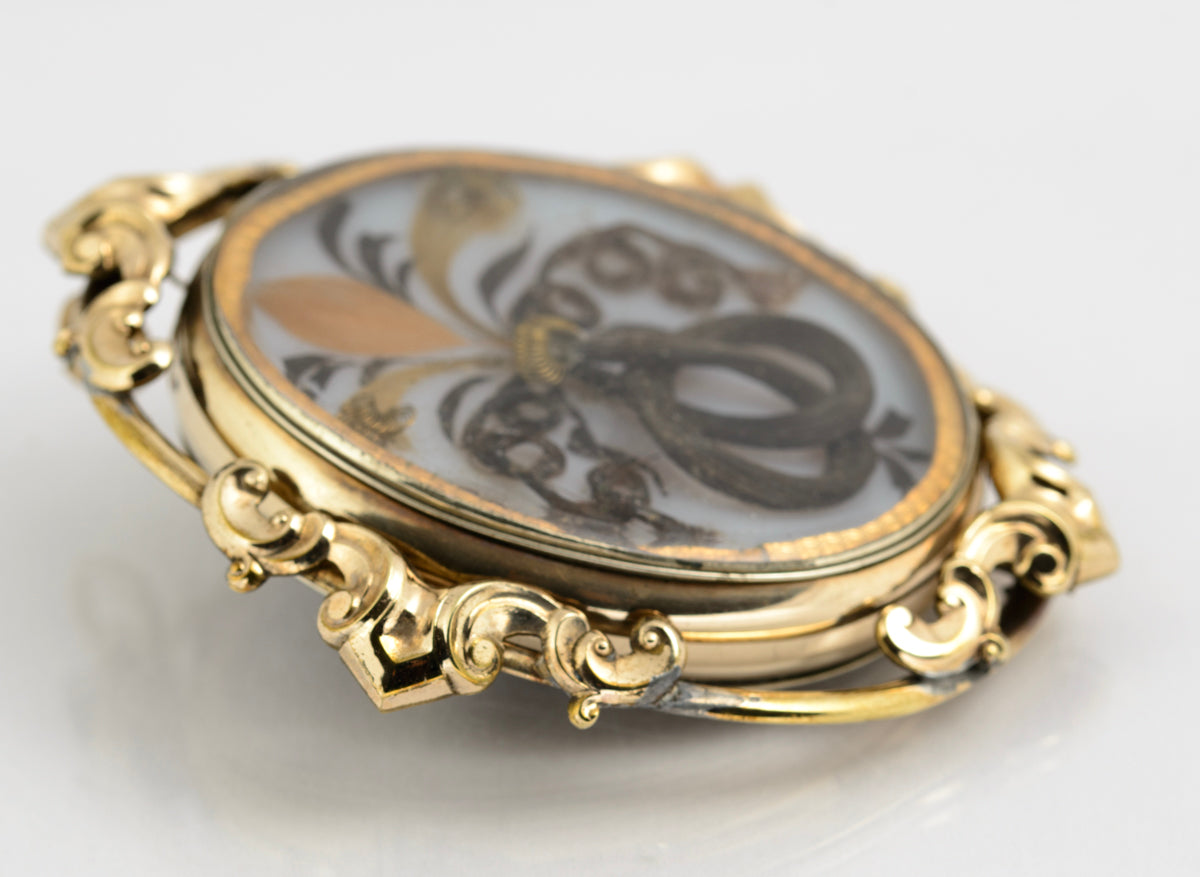 A large and impressive late Victorian hair art mourning brooch. It is in gilt metal and has a decorative frame with scrolled detail. The centre panel rotates and is held in place simply by the pin to the back. To one side it has a decorative design formed from hair and to the other it has a fine plait of hair. The panels are glazed. To the reverse there is also a suspension loop so it could be used as a pendant.