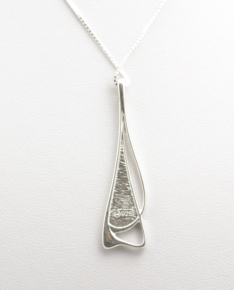 A sterling silver & enamel pendant necklace designed by Malcolm Gray for Ortak jewellery. The pendant is of sinuous form and has an Art Nouveau look to it. To the reverse it has the MG logo mark and 925 for sterling silver. It comes with a good quality silver trace box chain which has a silver mark to the link and also to the spring ring.