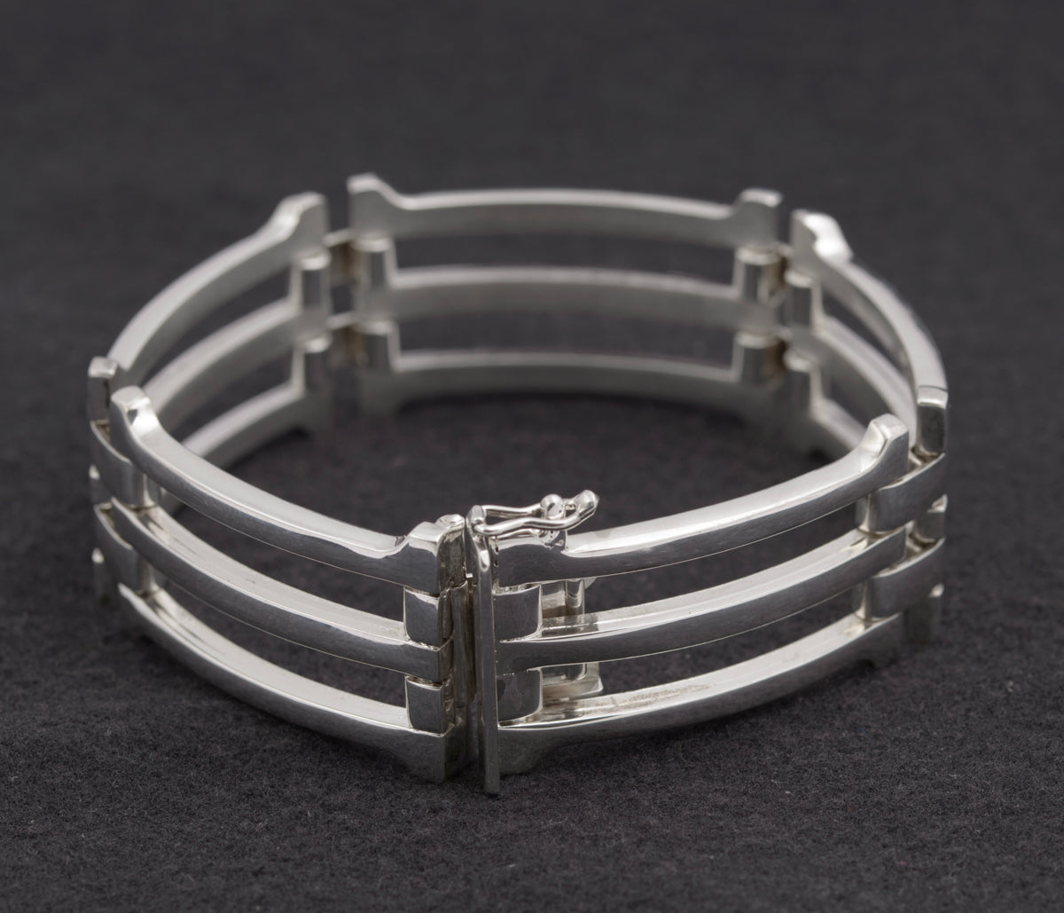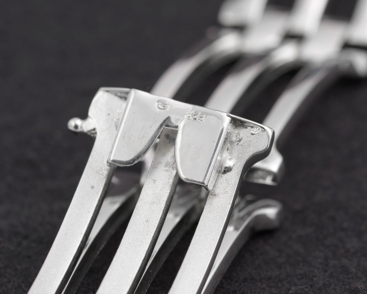 A vintage heavy silver gate bracelet. It is made in .835 grade silver so is likely German, Austrian or Portuguese. It is much heavier that the traditional British gate bracelet with the silver bar some 2.6mm thick. It is made up of five panels which are articulated and it has a slide clasp with safety tab. It is marked 835 to the underside of the clasp and also has another stamped mark which is most likely a makers stamp rather than a control mark. The bracelet is of high quality and good weight.