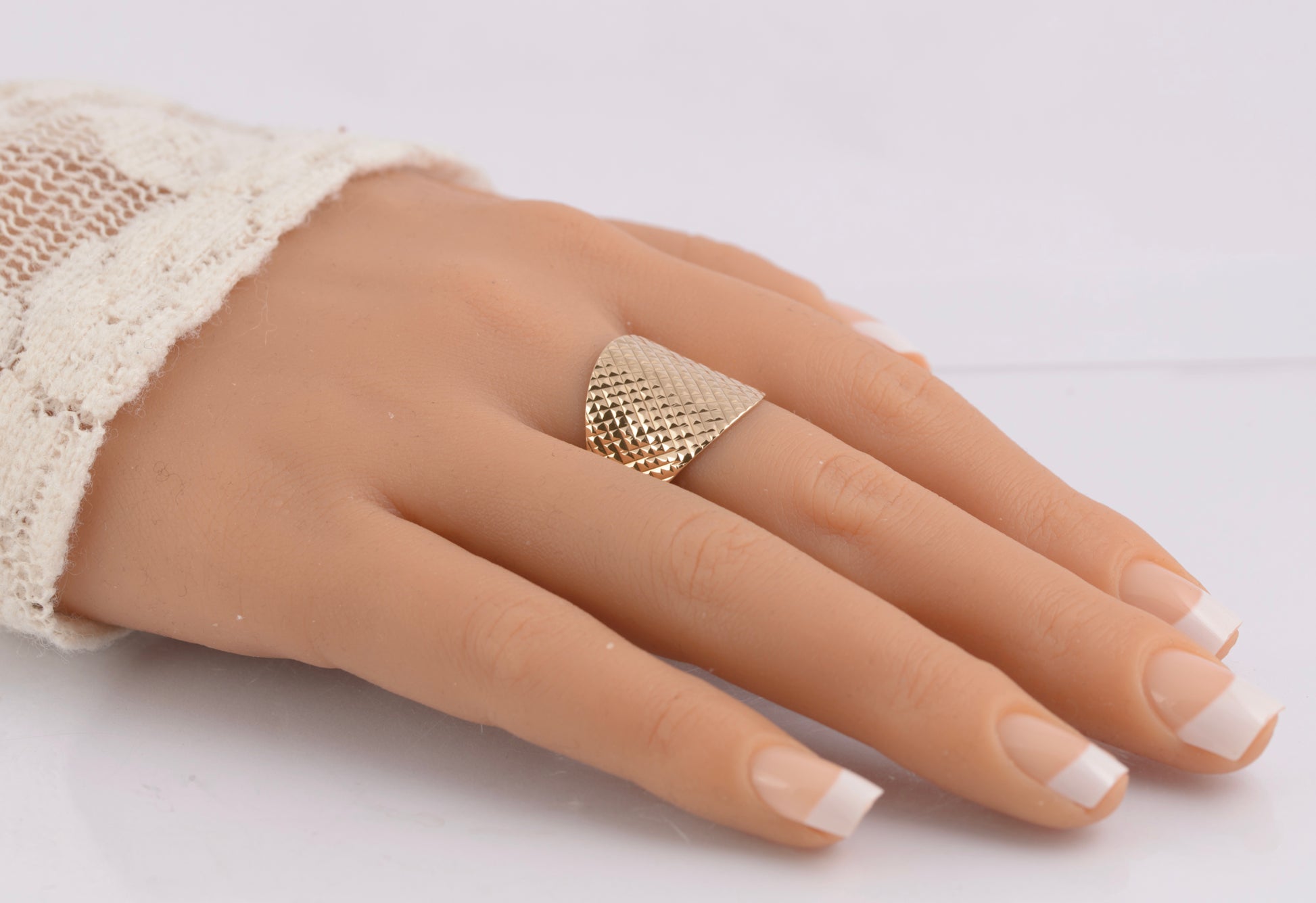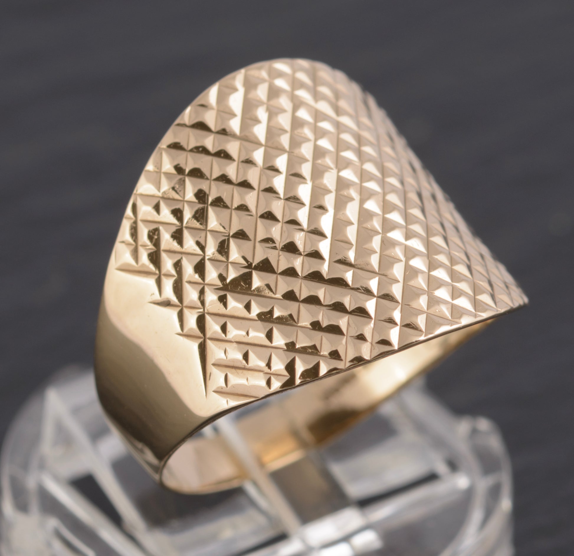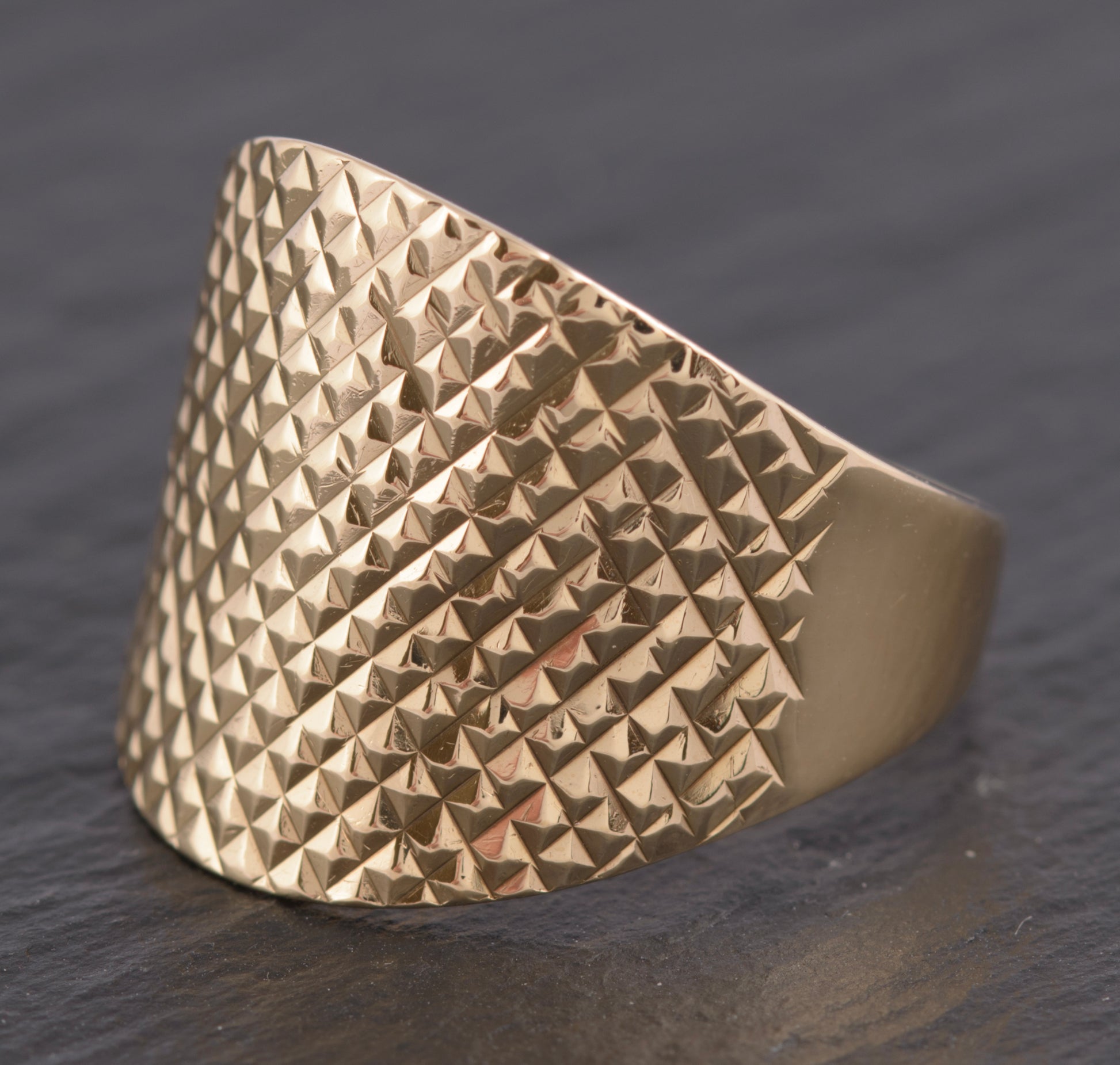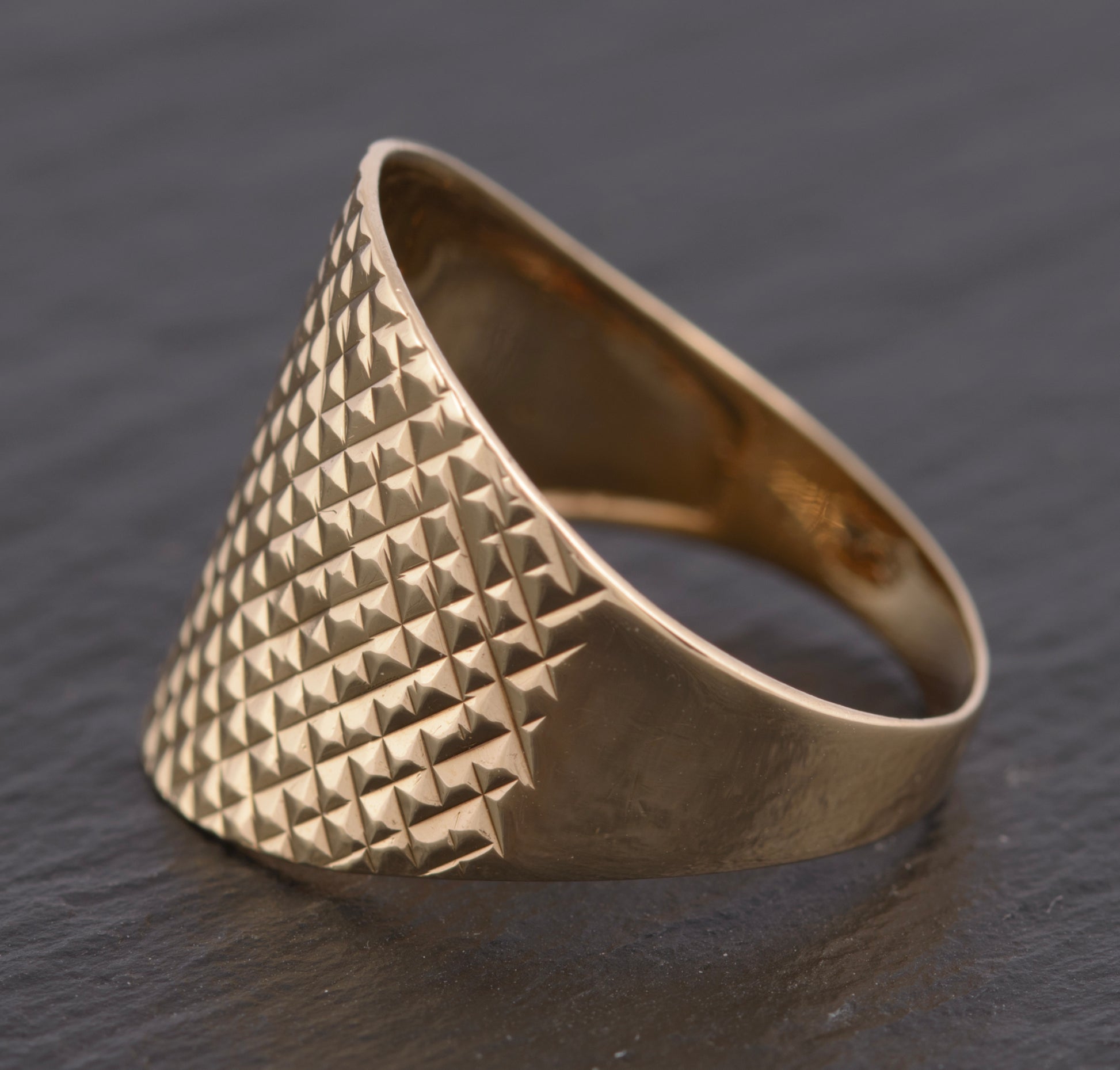 A vintage 9ct gold wide top ring. The top is cut in a diamond pattern to give an interesting optical effect. The lower half of the band is of plain form and tapers down. Inside the band it has a 9K mark and a makers logo with a D and a crown. It also has a full hallmark from the Birmingham assay office with date letter for 2001 and it also has a QVC mark.