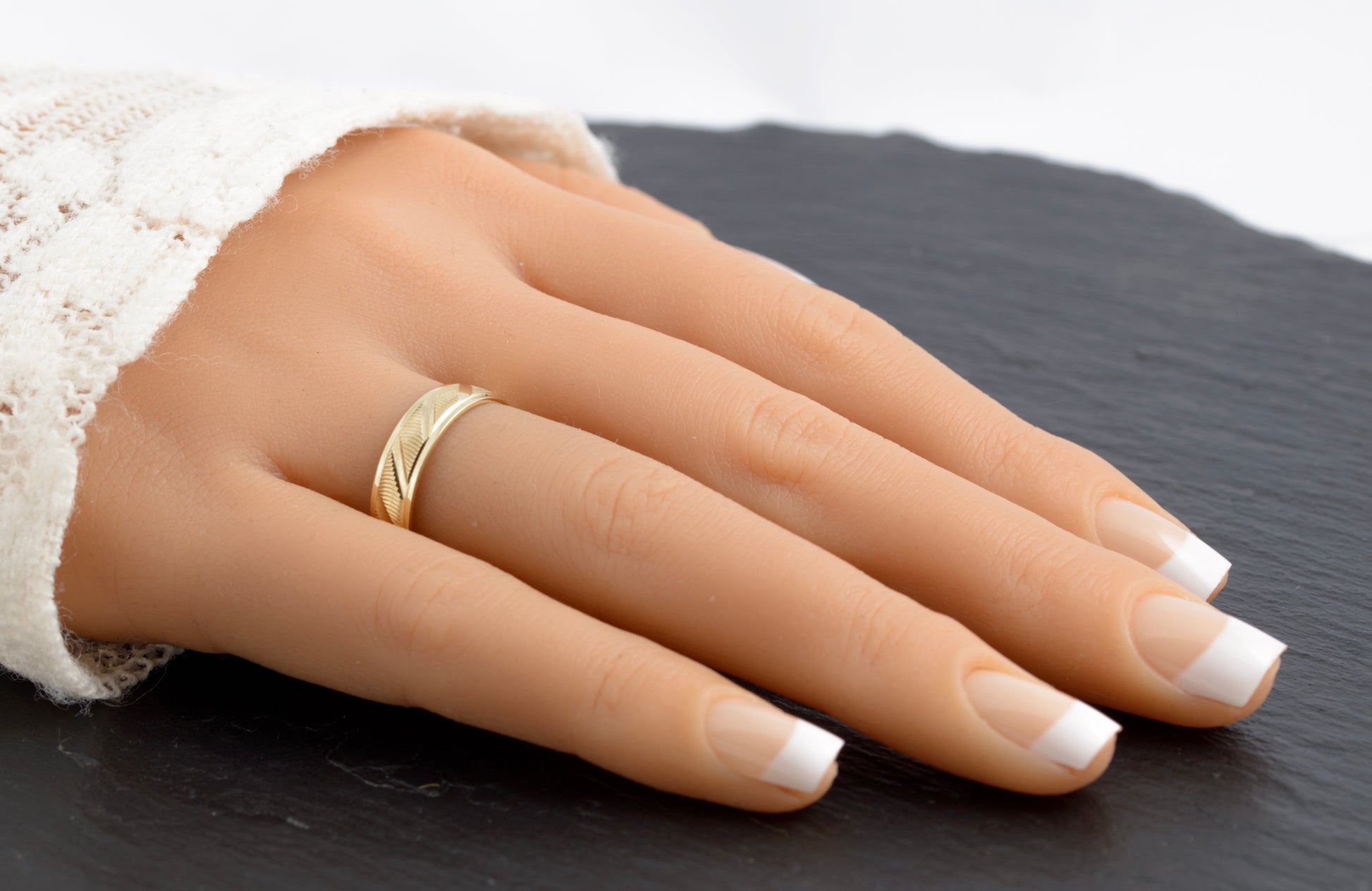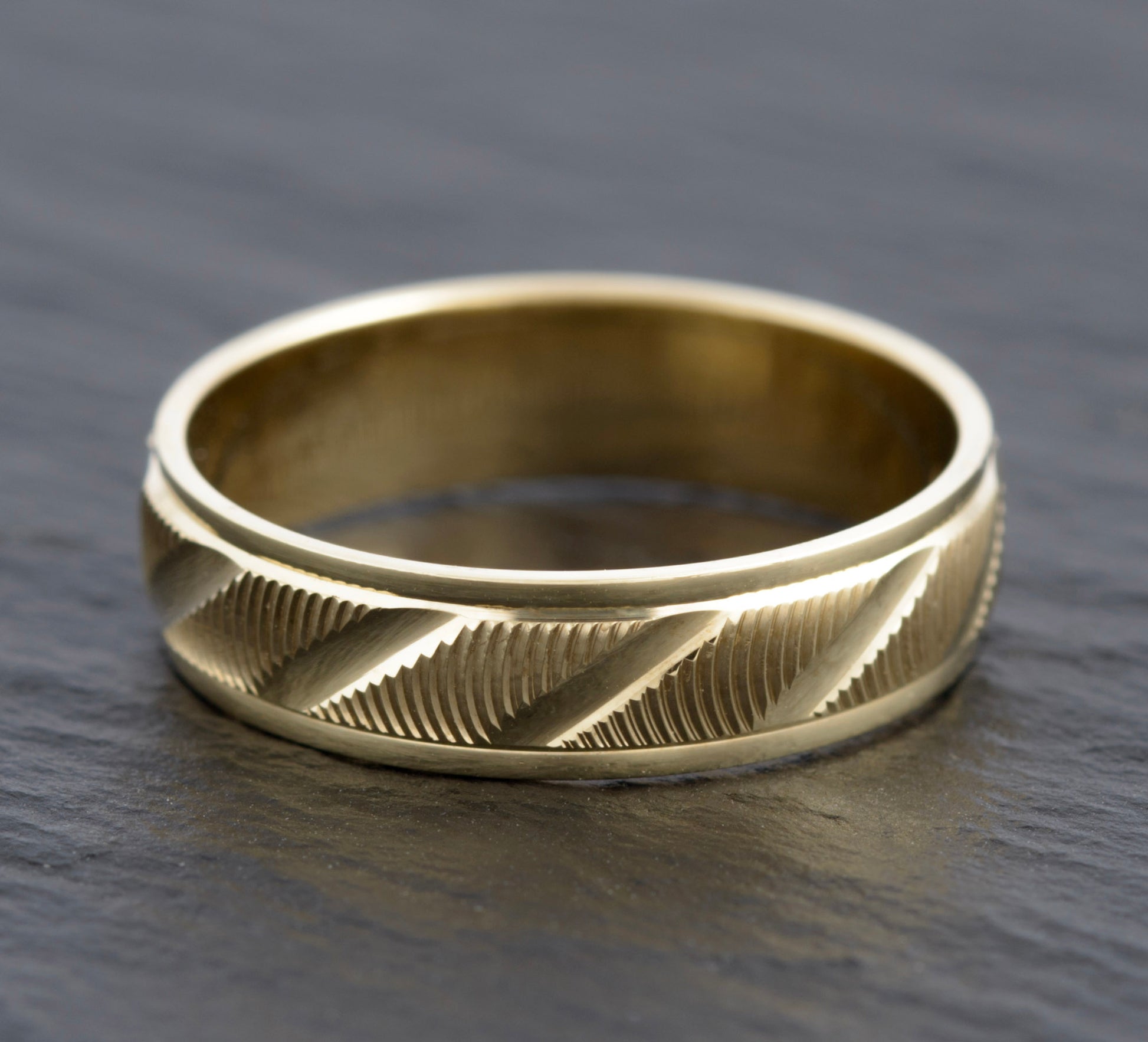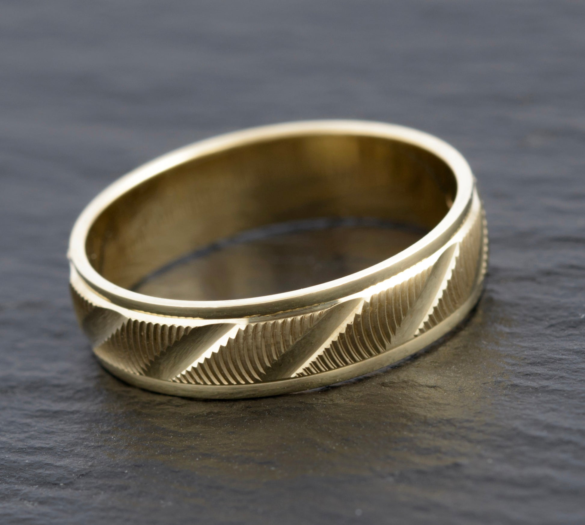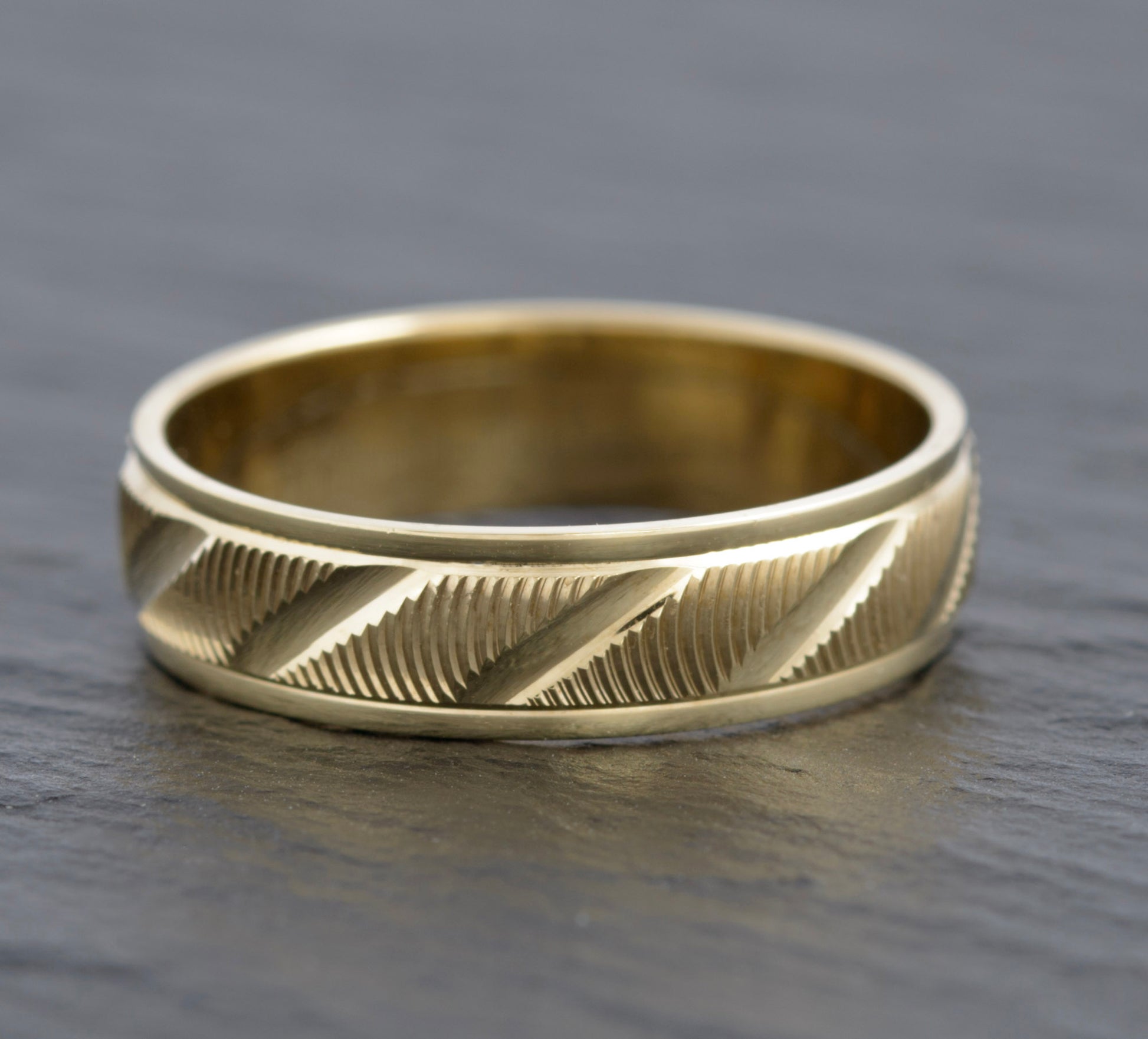 A vintage 9ct gold band ring. It has radial trench cuts giving an optical effect shifting the light lines around the pattern when worn. The outer section of the band is plain. Inside the band it has a hallmark from the Sheffield assay office for 9ct gold. It uses the international gold mark and would date to the 1990's. The makers initials are WJJ.