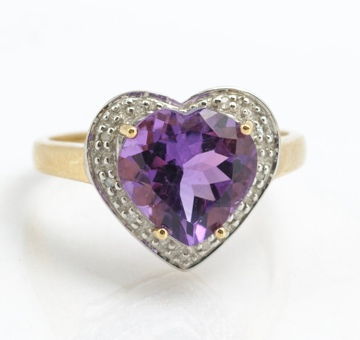A vintage 9ct gold ring set with an amethyst gemstone cut into a heart shape. The stone is quite large being around 9.5mm x 10mm across. The amethyst is around mid saturation and has a very nice sparkle in the light. The amethyst is prong set and there is a matching heart shaped border beneath which contains small natural diamonds. The band is of plain form. Inside the band it has the international style of stamped hallmark from the Birmingham assay office. The makers mark is OPT and it would date to the 1990's. The band is also stamped DIA for diamonds.