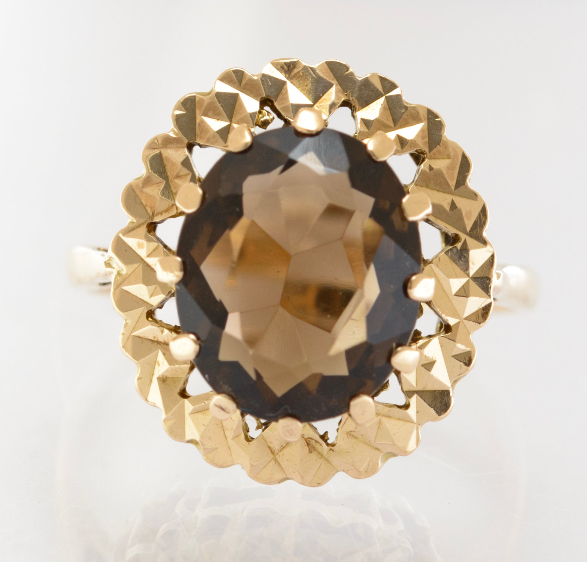 A vintage 9ct gold ring with a large natural smoky quartz (approx 2.75 carat) oval facet cut gemstone. It is set in a claw mount with a border that is diamond cut adding to the interest and sparkle. There is a further open work setting below the diamond cut panel. Inside the band it has a hallmark from the London assay office with date letter for 1966.