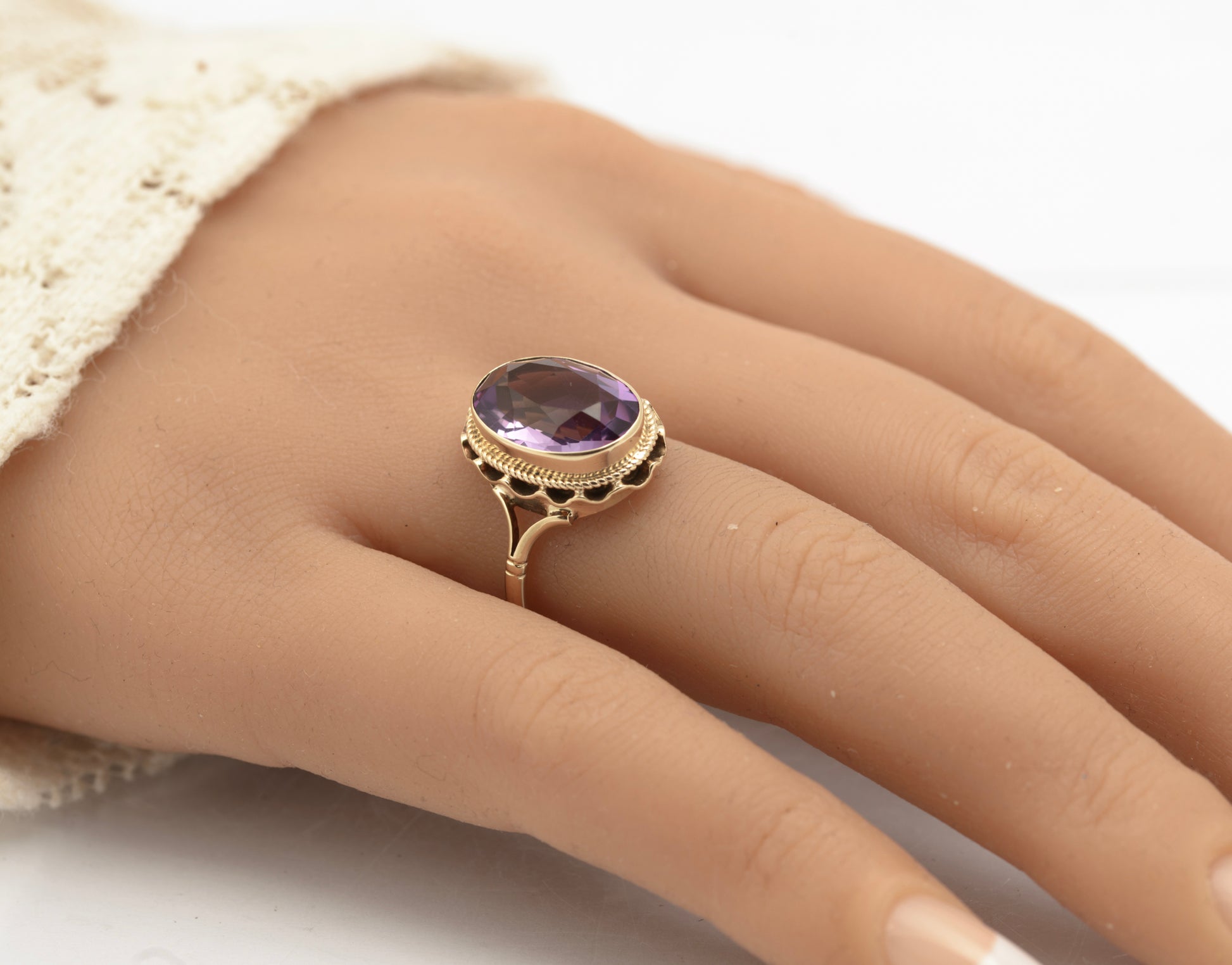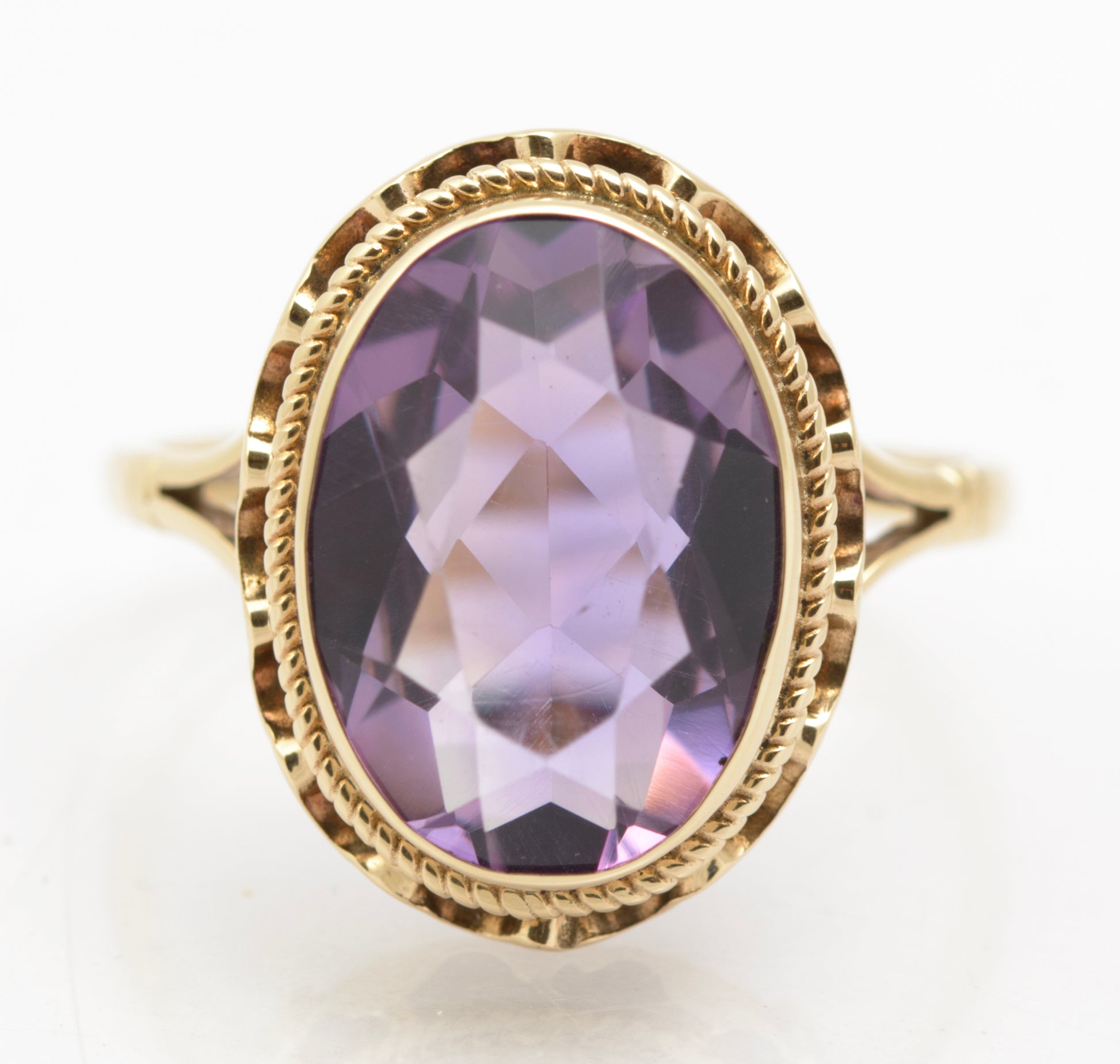 A very attractive vintage ring in 9ct gold. It is set with a large oval faceted natural amethyst in Rose de France tone. The amethyst is approx 4 carats and is bezel set with a rope twist border and further scalloped band. The shoulders are bifurcated with decorative notches at the top. Inside the band it has a full hallmark from the Birmingham assay office with date letter for 1969. The makers mark is FKB Ltd.