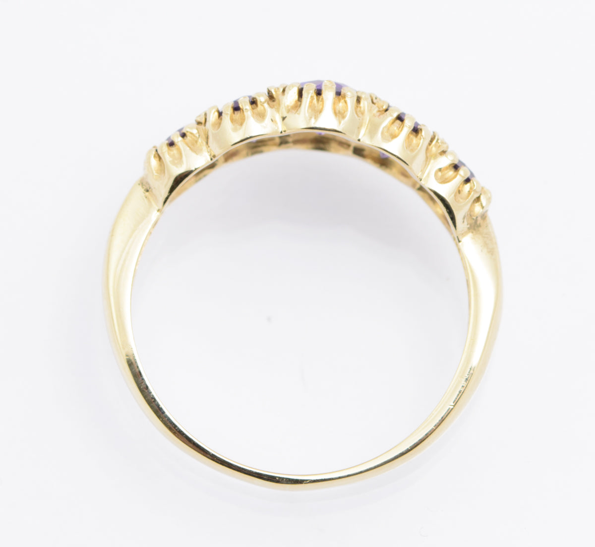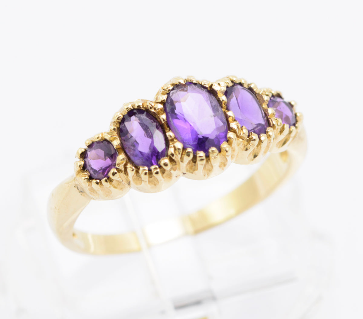 A very pretty vintage 9ct gold ring set with five graduated natural amethysts. The three central amethysts are oval facet cut and the outer two are round facet cut. They are set in a multi claw arrangement which gives and interesting effect as you can see in the images. The amethysts are of good tone and have red flashes in the right light. Inside the band it has a Birmingham hallmark using the international symbols so likely dating to the 1980's. The makers mark is BMJ.