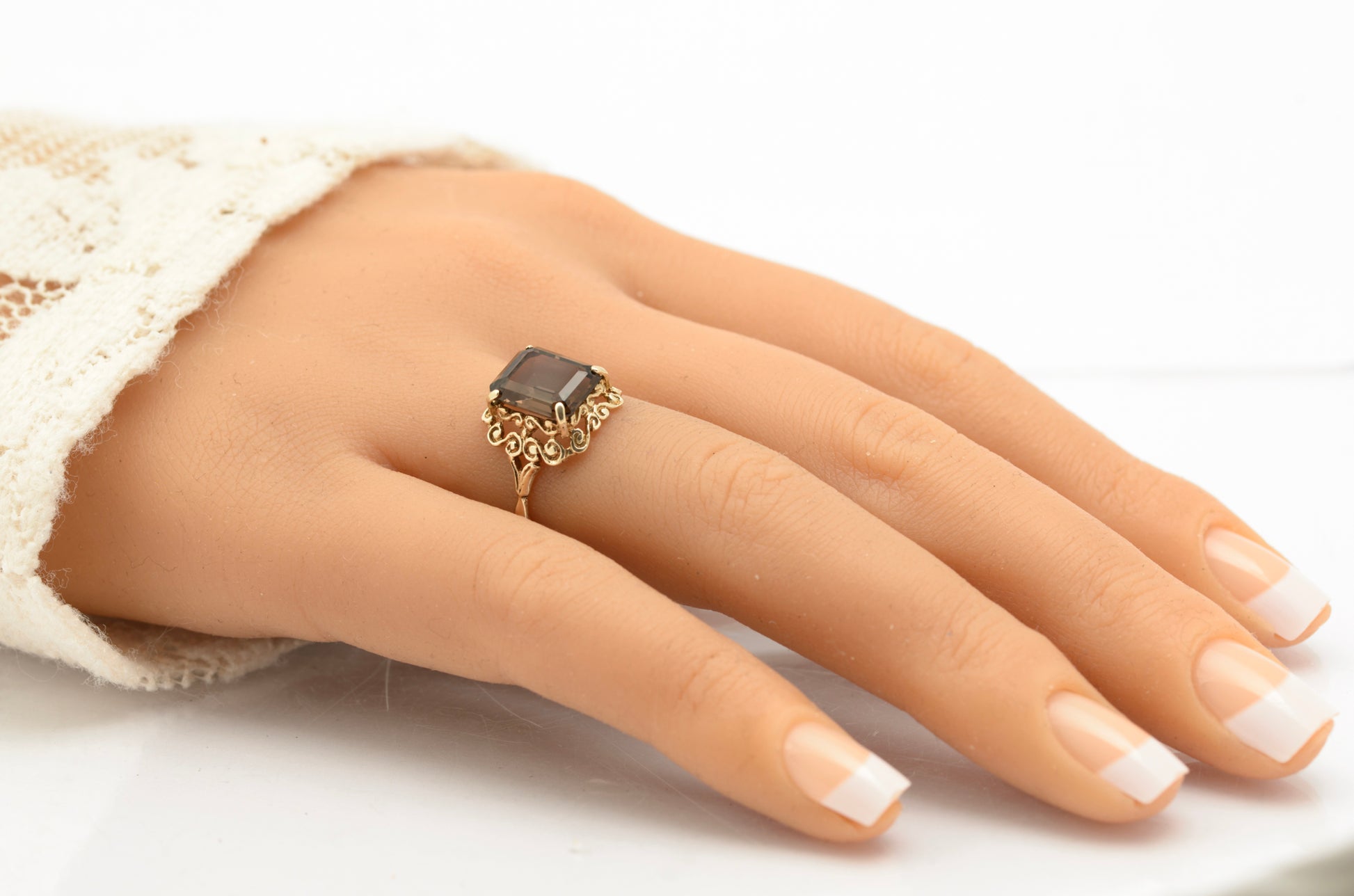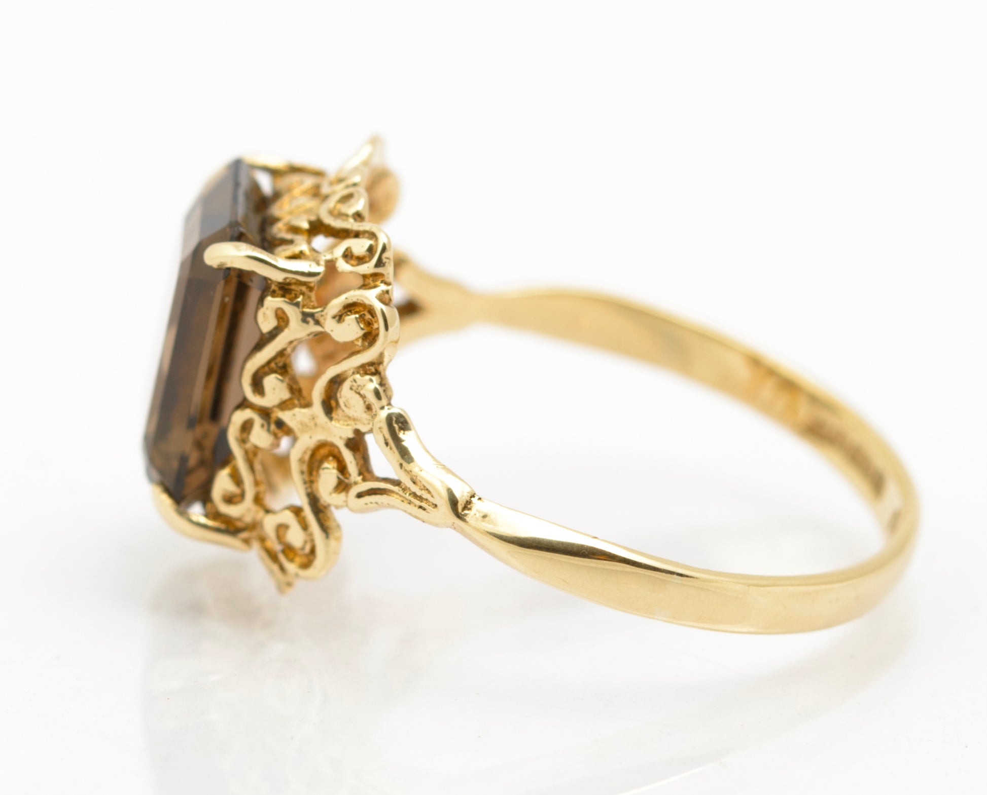A vintage 9ct gold ring in a very decorative design. It is set with an emerald cut smoky quartz gem which has flashes of bronze and aubergine in the right light. The smoky quartz is of natural form and is approx. 2.25 carat. It is claw set and it has a decorative surround. The shoulders are bifurcated and the rest of the band is of plain form. Inside the band it has a hallmark from the Birmingham assay office with date letter for 1976. The makers mark is CL & S.