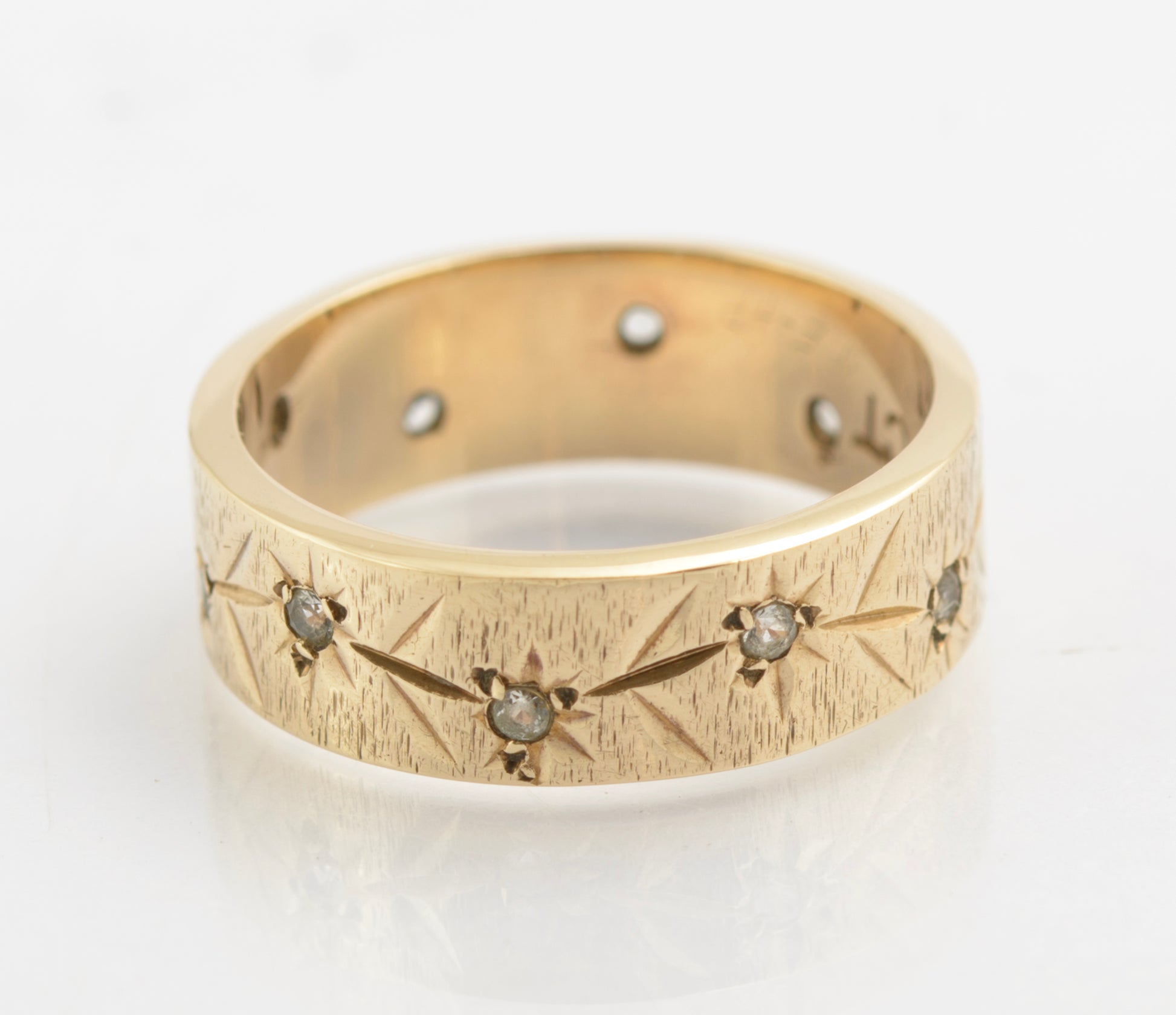A vintage 9ct gold textured band ring set with clear gems. The band has vertical textures very typical of the 1970's and has cut leaf shapes. These link up between the gems which alternate across the band and in flower shaped mounts. The gems are probably rock crystal quartz (very difficult to test accurately due to mounting).
