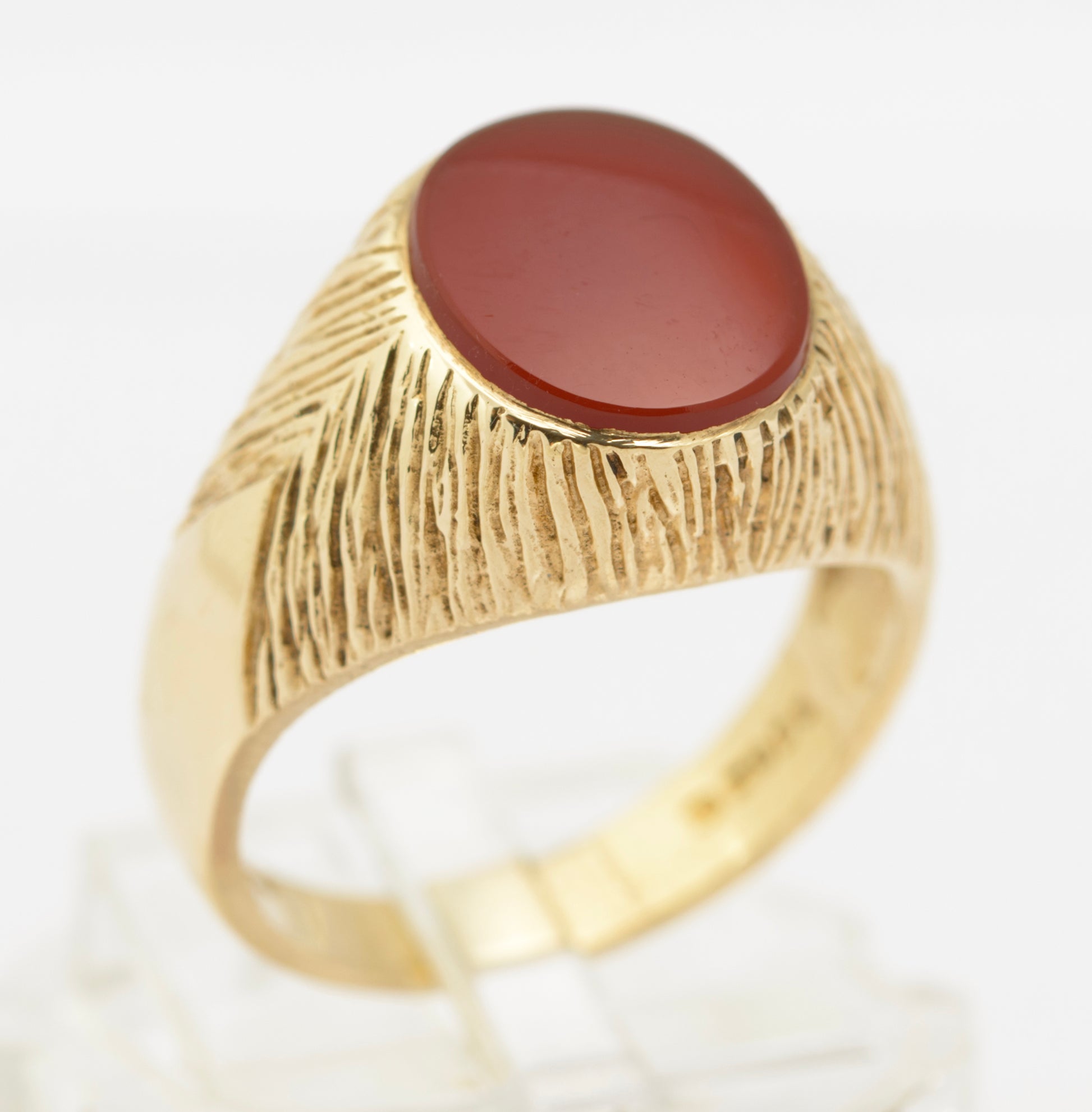 A vintage 9ct gold signet ring. It is set with an oval polished cabochon carnelian. The shoulders and surround have an interesting feathered texture adding interest to the piece. Inside the band it has a hallmark from the London assay office with date letter for 1977. The makers mark is GoL