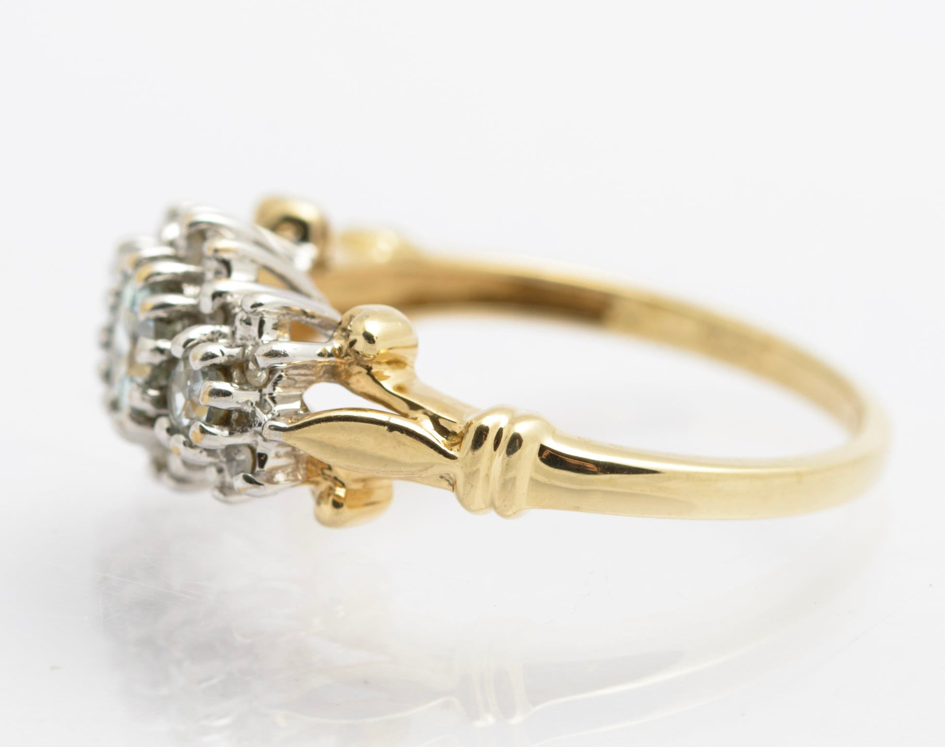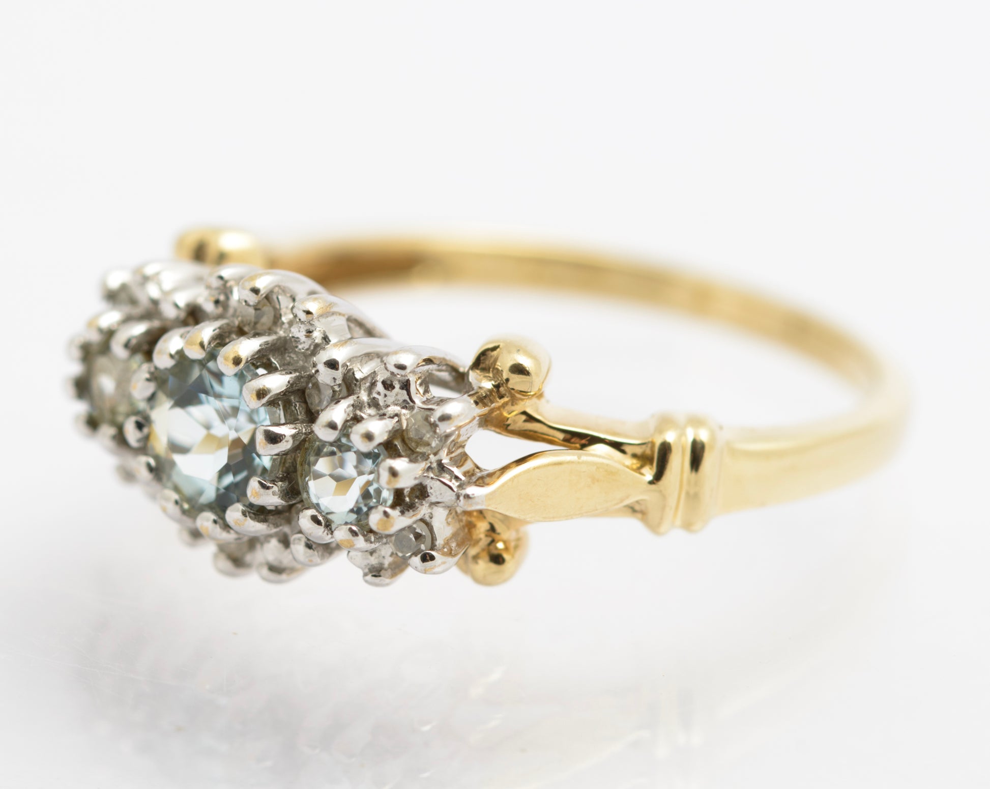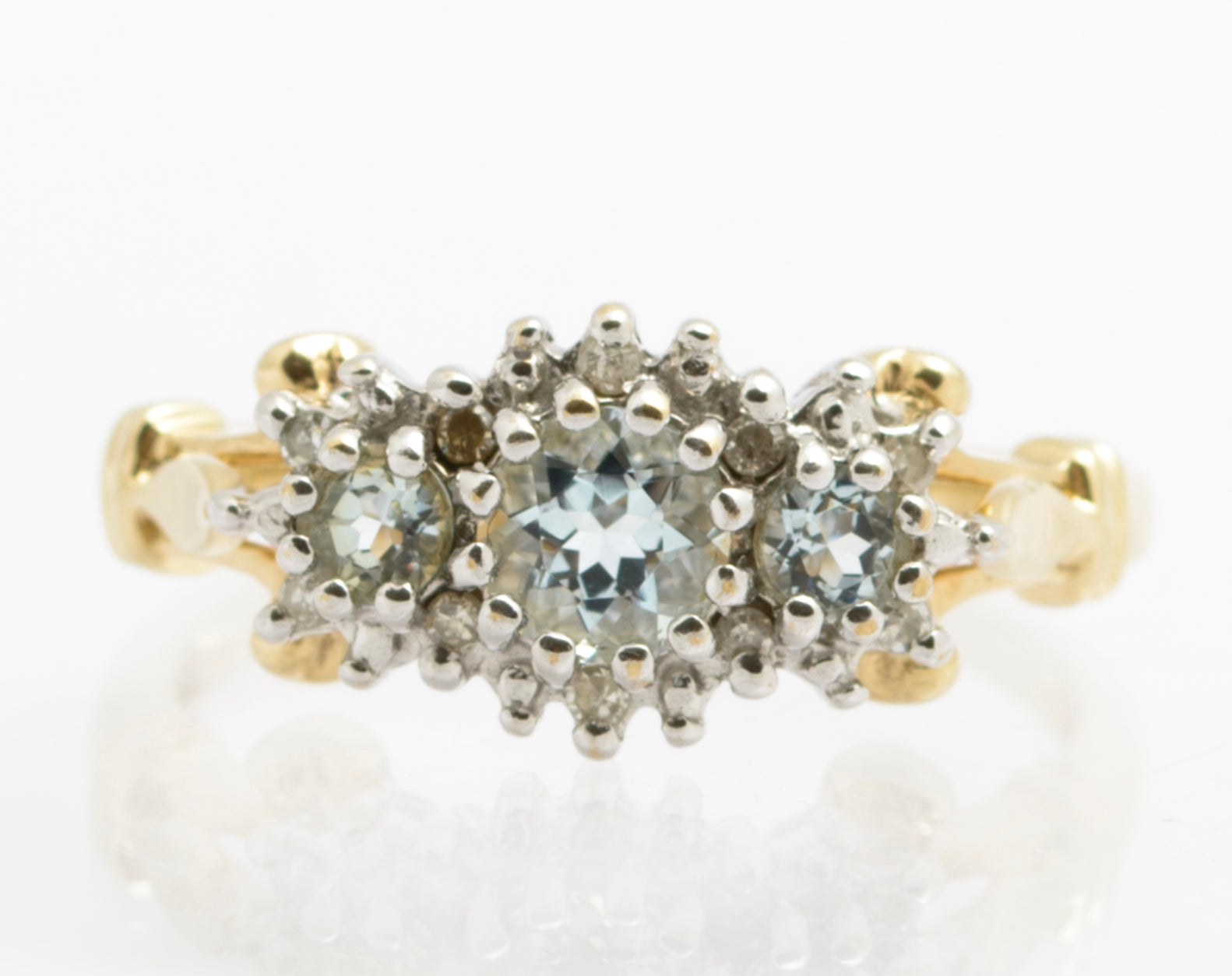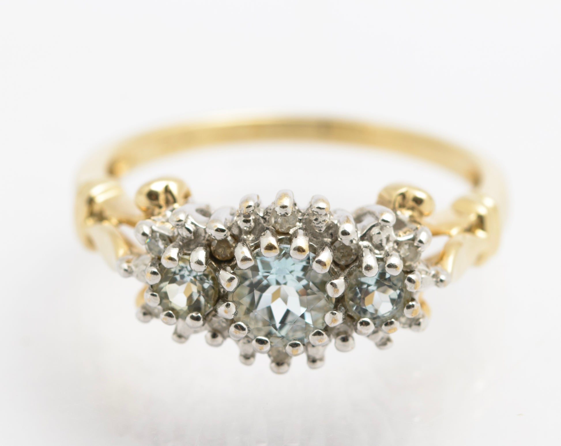A very attractive vintage 9ct gold ring. It is set with three aquamarine stones with a halo of diamonds around the outside. The largest aquamarine is approx. 4.5mm. There are decorative details to the shoulders which are bifurcated. The mount is cathedral style lifting the gems off the finger. Inside the band it has a hallmark from the London assay office using the international style of mark typical for the 1980's. It is further marked 10 PTS for 10 points of diamond.