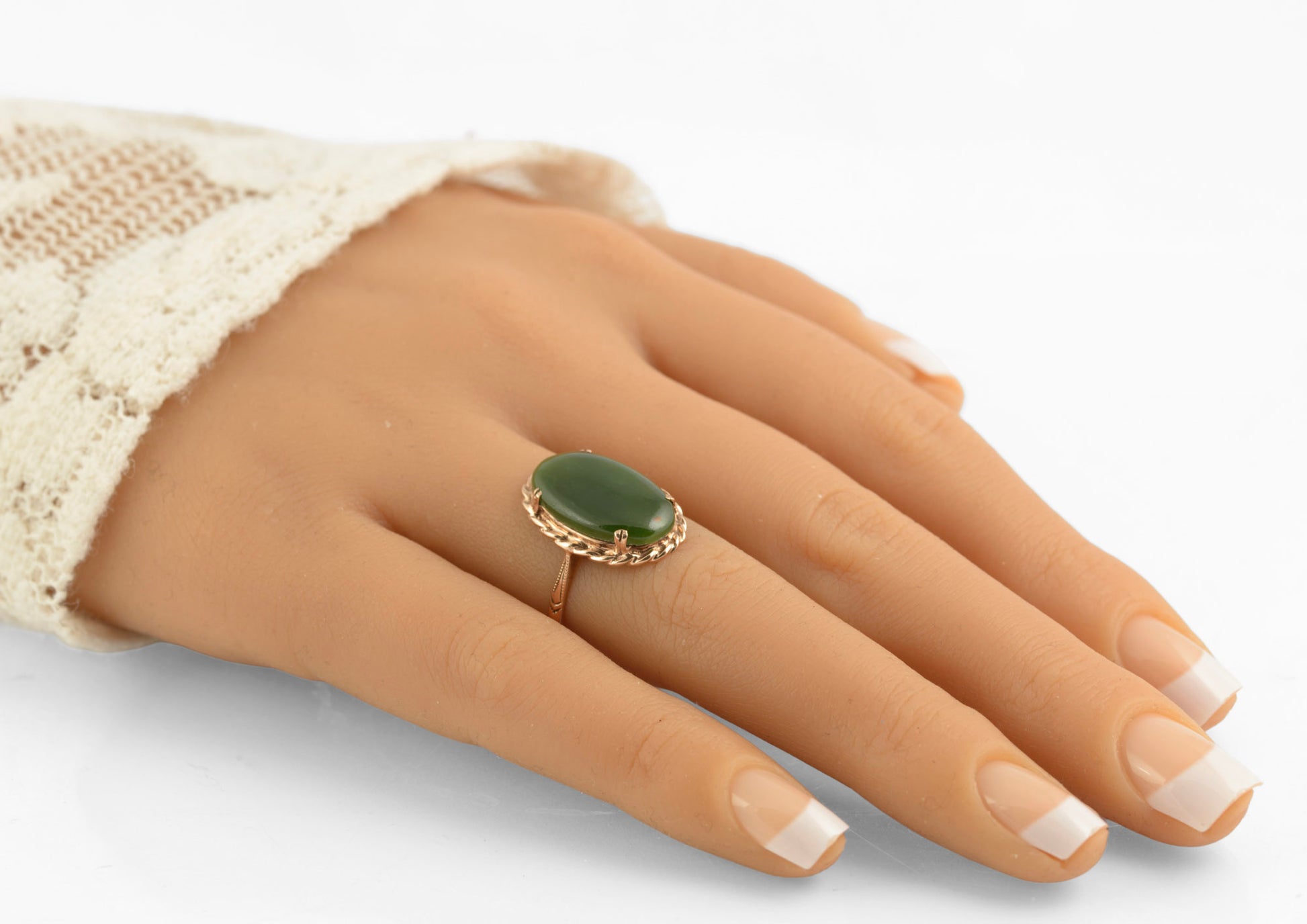A vintage 9ct gold ring with a large oval polished jade cabochon. The cabochon is approx 4 carats and a very nice forest green with slight natural variation in colour throughout the stone. The jade is nephrite species.
