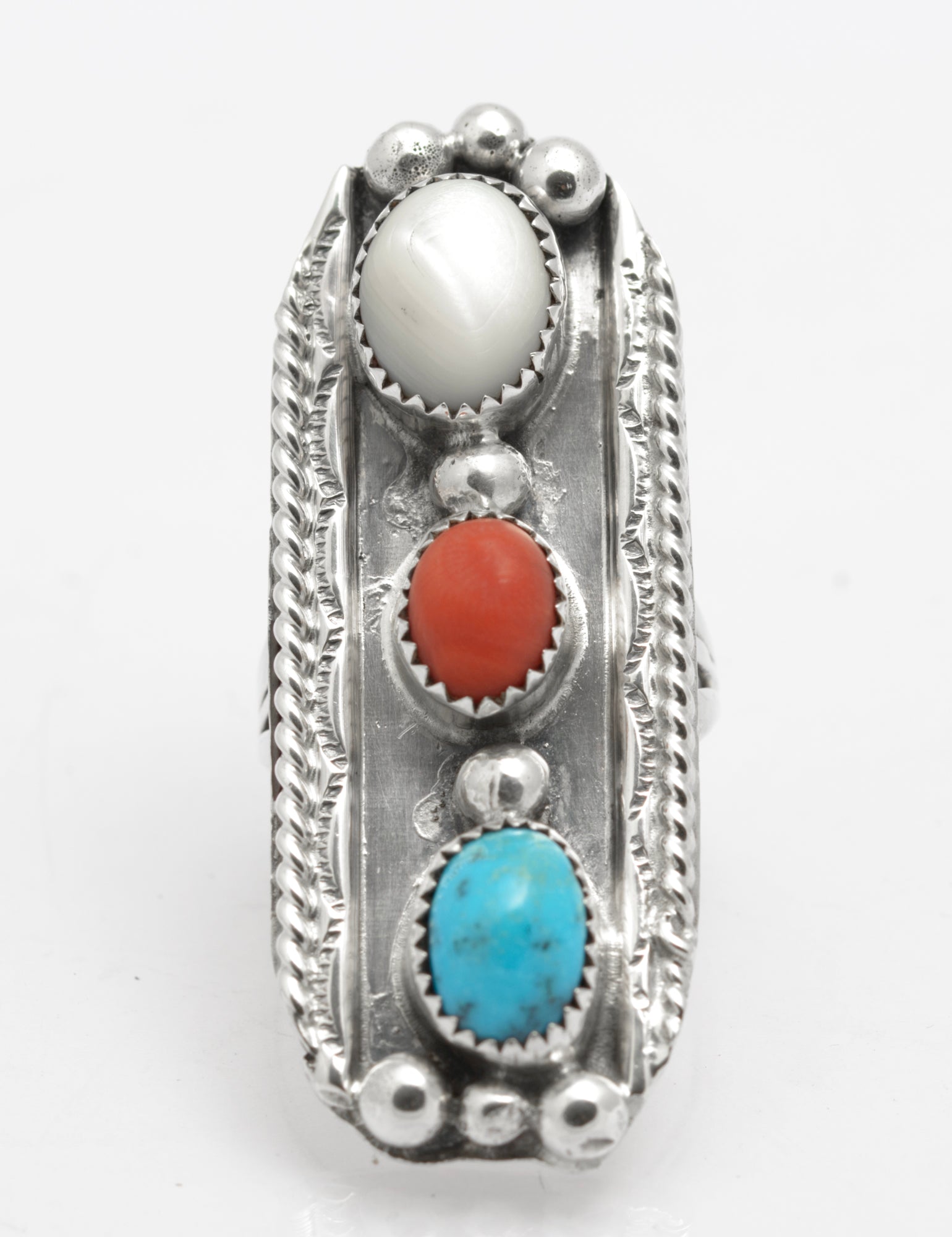 A vintage sterling silver statement ring by Navajo artist Arthur J Williams. It is hand made and has turquoise, coral and mother of pearl bezel set to the elongated head. Arthur Williams was operating in the second half of the 20th century and this ring has his stamped mark to the underside of the head. It tests as sterling grade silver.