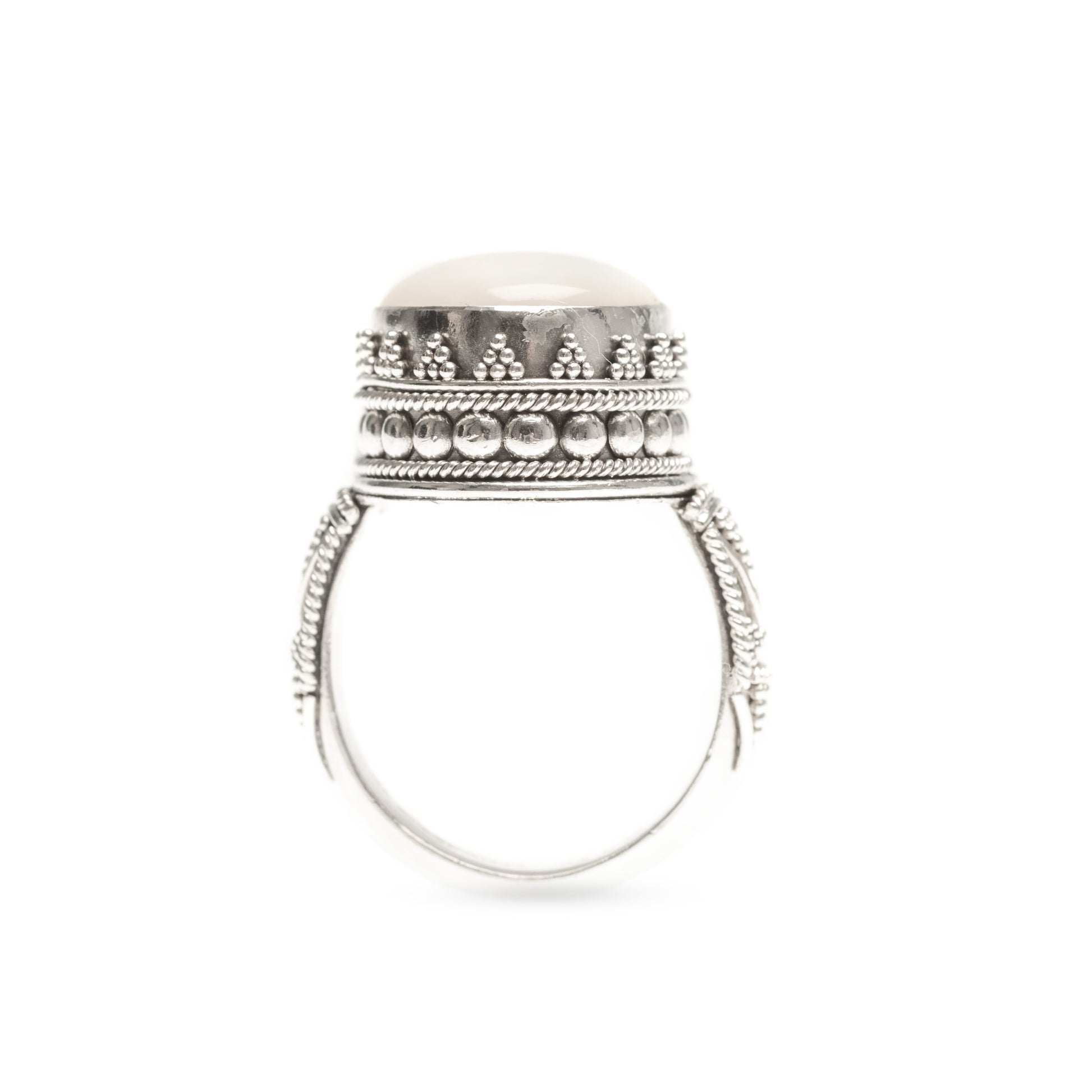 A vintage statement ring by BA Suarti. This silver ring is set with an impressive mother of pearl cabochon in an elaborate decorated high bezel mount. There is further relief decoration to the shoulders of the ring. The inside of the band is marked for Sterling grade silver and is also marked Suarti and there is also a partial silver hallmark.