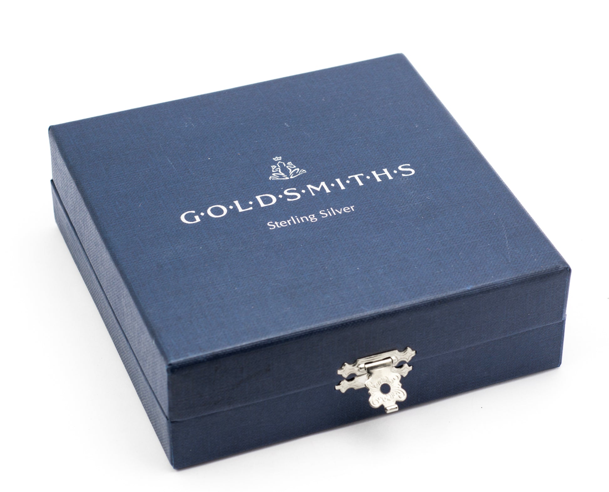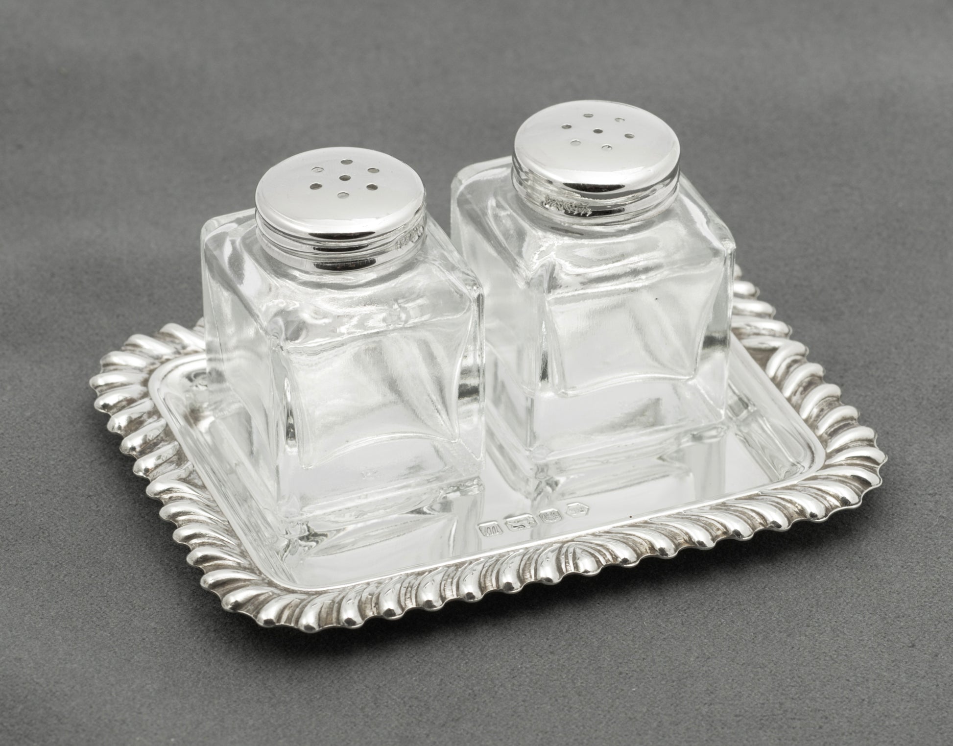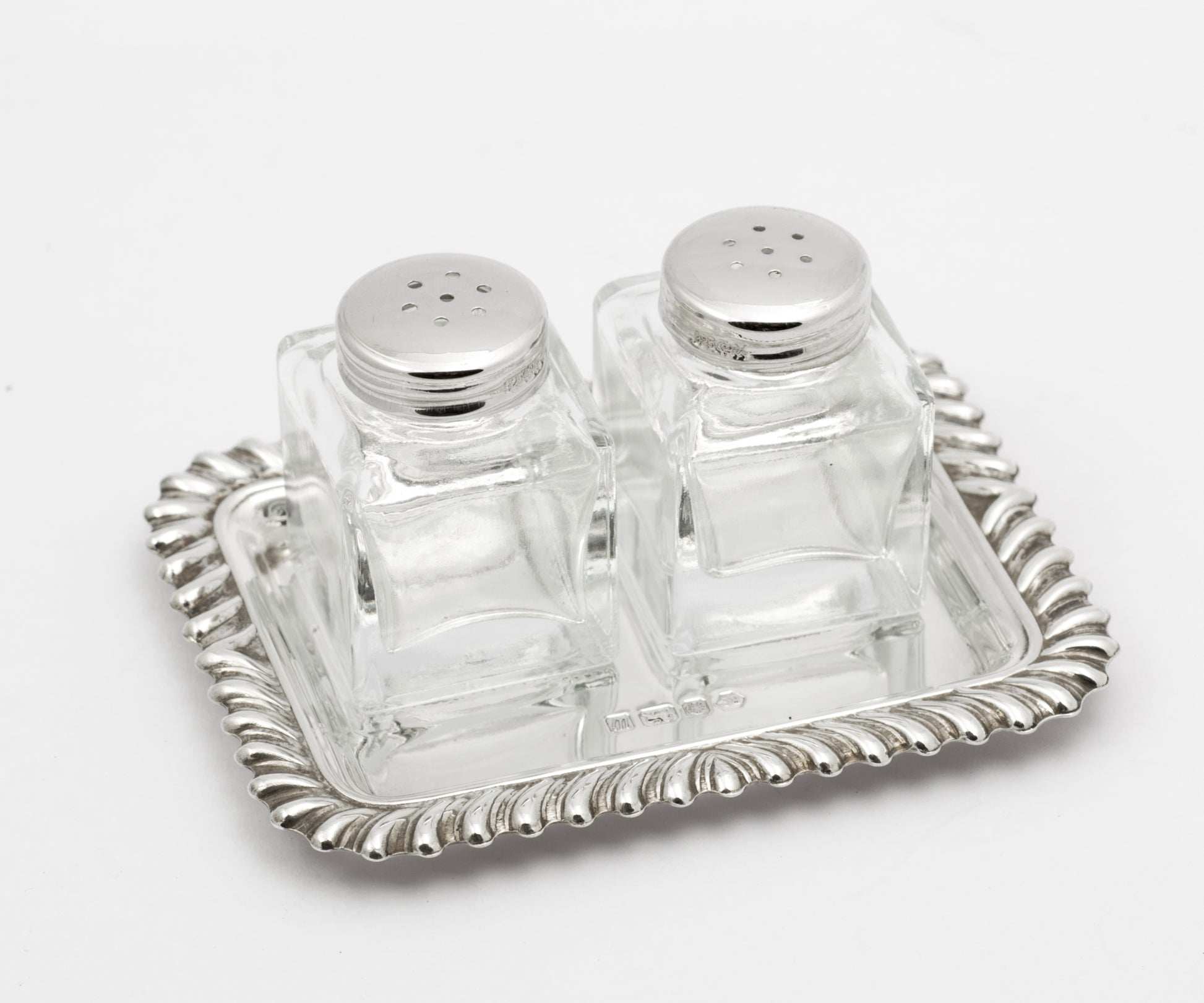 A vintage cruet set comprising two small glass jars for salt and pepper with silver lids and a silver tray with a gadrooned border. The tray is hallmarked by the Sheffield office with date letter for 1996 and the makers mark is for Carr's of Sheffield Ltd. The set comes in a Goldsmiths branded box so would have been retailed through them. The salt and pepper have silver lids with 925 marks.
