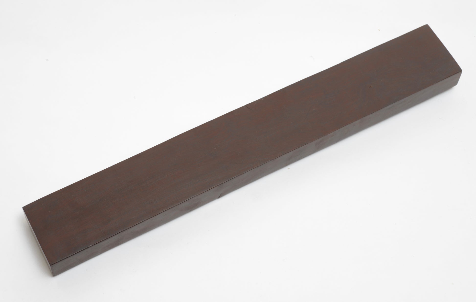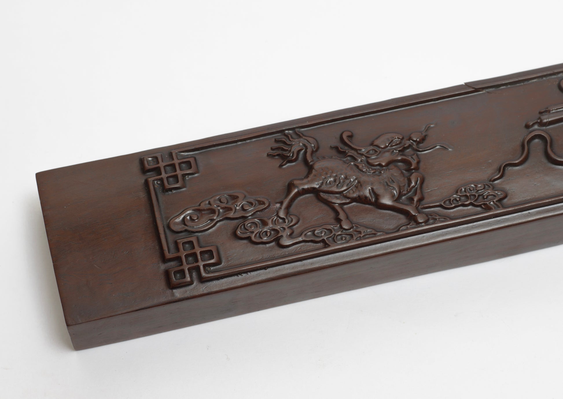 A Chinese hardwood carved large scroll weight. I believe this to be zitan wood as it sinks like a stone in water and does have a purple hint. The grain is very dense. It is carved with two cloud dragons facing a tied scroll with a traditional border. There are no names or makers details. Dating is very tricky and I think it is more likely vintage than antique although this is a very large chunk of a rare wood to use for such a piece.