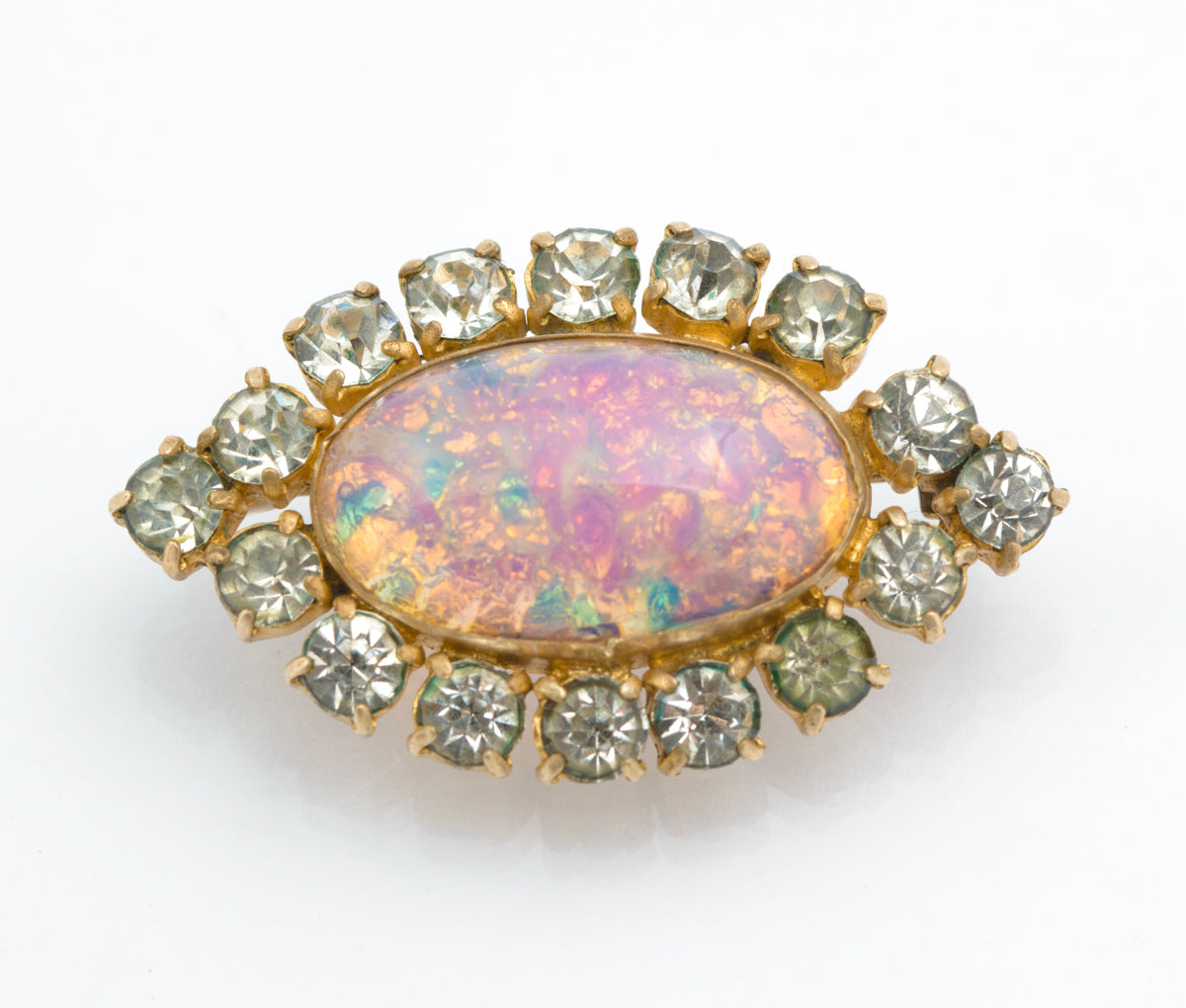 An early 20th century Czech brooch. It is a dragons eye design using a dragons breath opal which is a man made glass gem with foil and a moonstone like glass. It is formed in the shape of an eye with paste glass gems and the setting is brass and has a safety roll over catch. It likely dates to the 1930's. The gem in this example is much larger than usual and makes for a nice display.