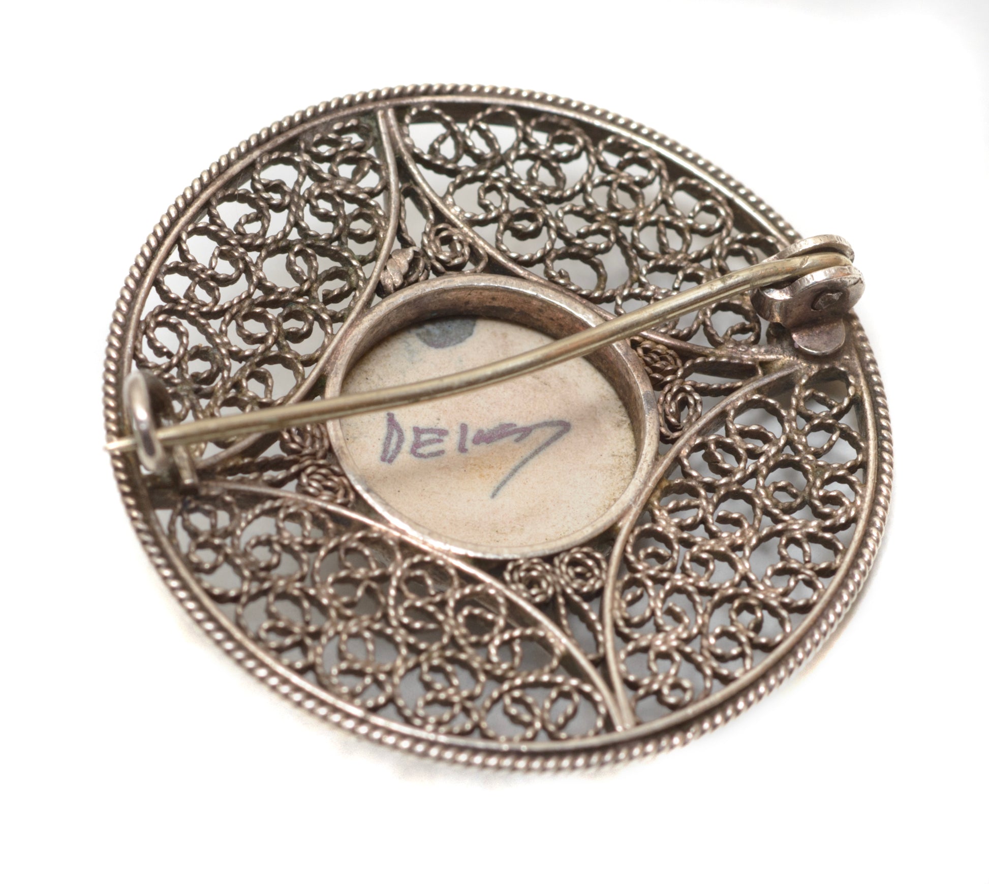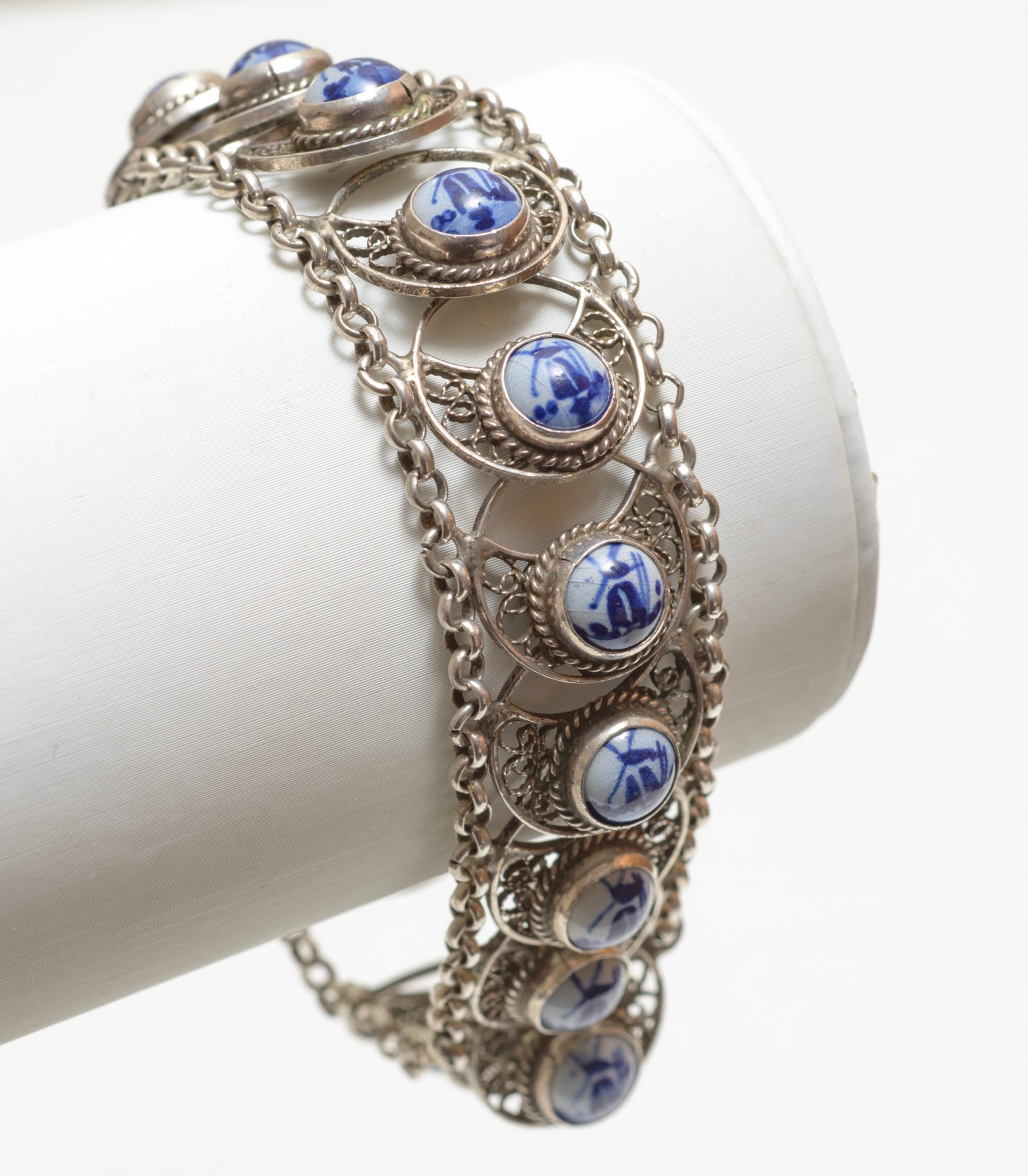 A vintage Dutch Delft demi parure set comprising necklace, bracelet and brooch. The necklace and bracelet are formed from panels of filigree work and each bezel set with a hand painted Delft ceramic windmill roundel. The tang to the sliding clasp of the necklace has Dutch control marks, the 833 sword mark is discernible but the others are not legible. To the brooch, the back of the ceramic is mark Delft. The brooch has a standard pin and c clasp fixing. It is likely mid 20th century in period.