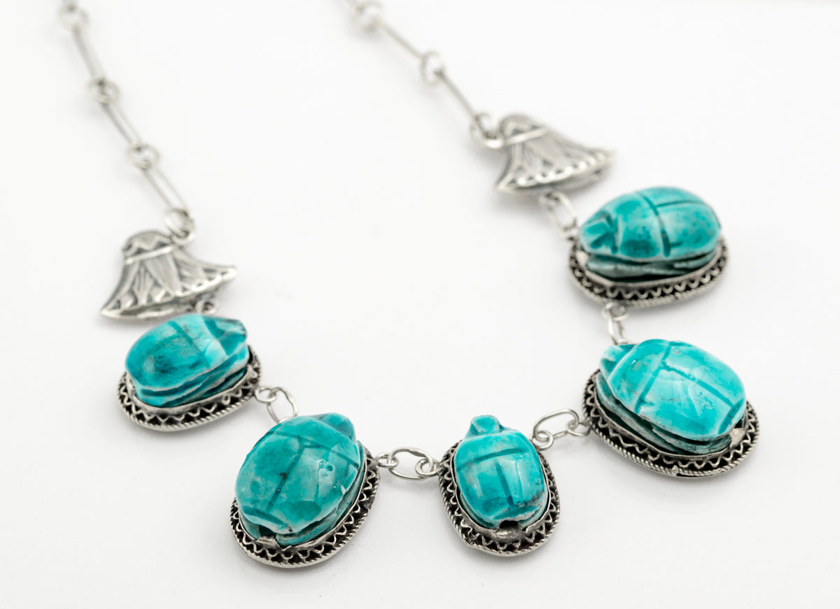 A vintage Egyptian necklace. It features five faience pottery scarab beetles in a turquoise blue glaze. These appear to have symbols to the underside, possibly birds. The mounts have wire formed details and are open beneath. There are two silver ancient Egyptian style lotus flower charms. The necklace likely dates to the early 20th century Egyptian revival period. There are Arabic type marks stamped to various parts, however they are not clear enough to decipher. The metal tests as silver around the .800 standard which is commonly used in Egypt. It is interesting to note that the scarabs are of varying size and are asymmetrically set around the chain. The necklace closes with a simple hook and loop.