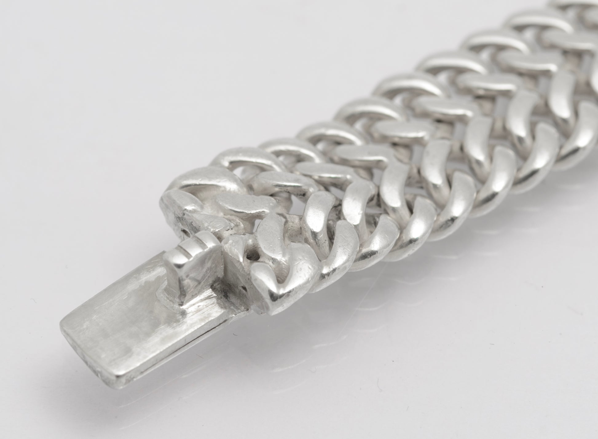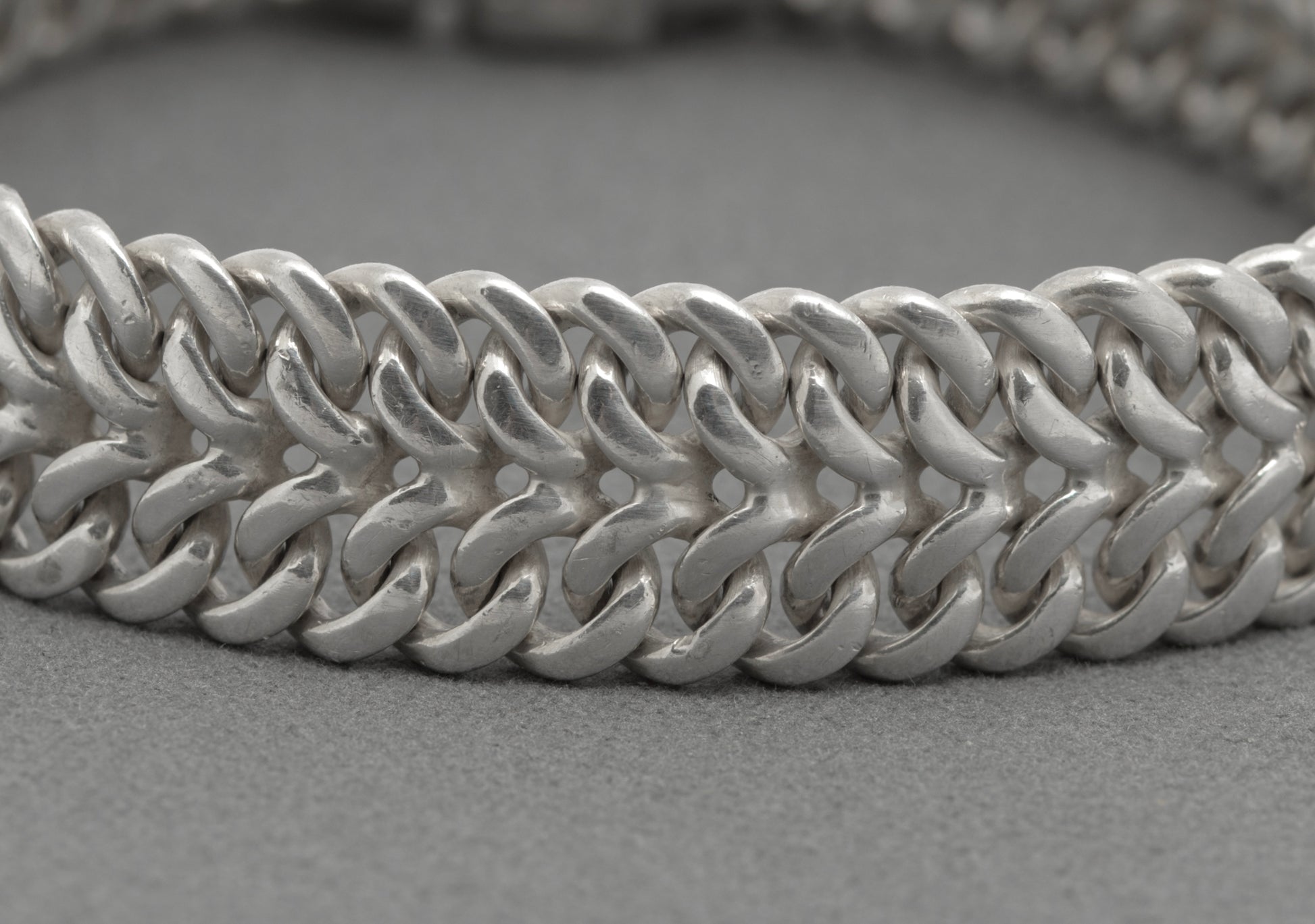 A vintage Scottish sterling silver bracelet with triple link chain band with centre herringbone style links by Tianguis Jackson. It is quite chunky for the size and has a stylish look possibly inspired by Mexican jewellery. It fastens using a slide clasp which is working fine. The back of the slide clasp has a 925 mark for sterling silver and also a Scottish sterling silver hallmark from the Edinburgh assay office. No date letter but this mark was used prior to the year 2000. The makers mark is TS for Tianguis Jackson.