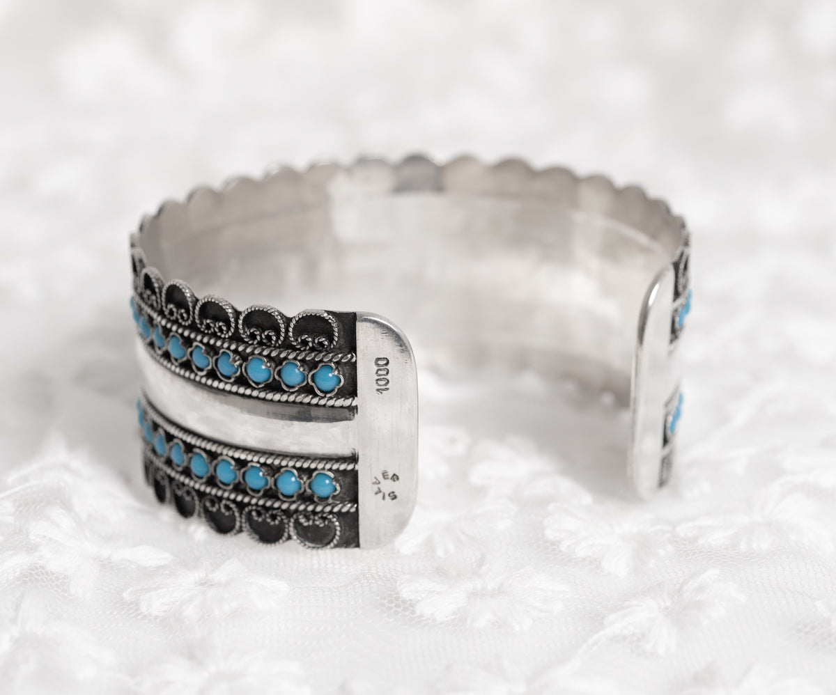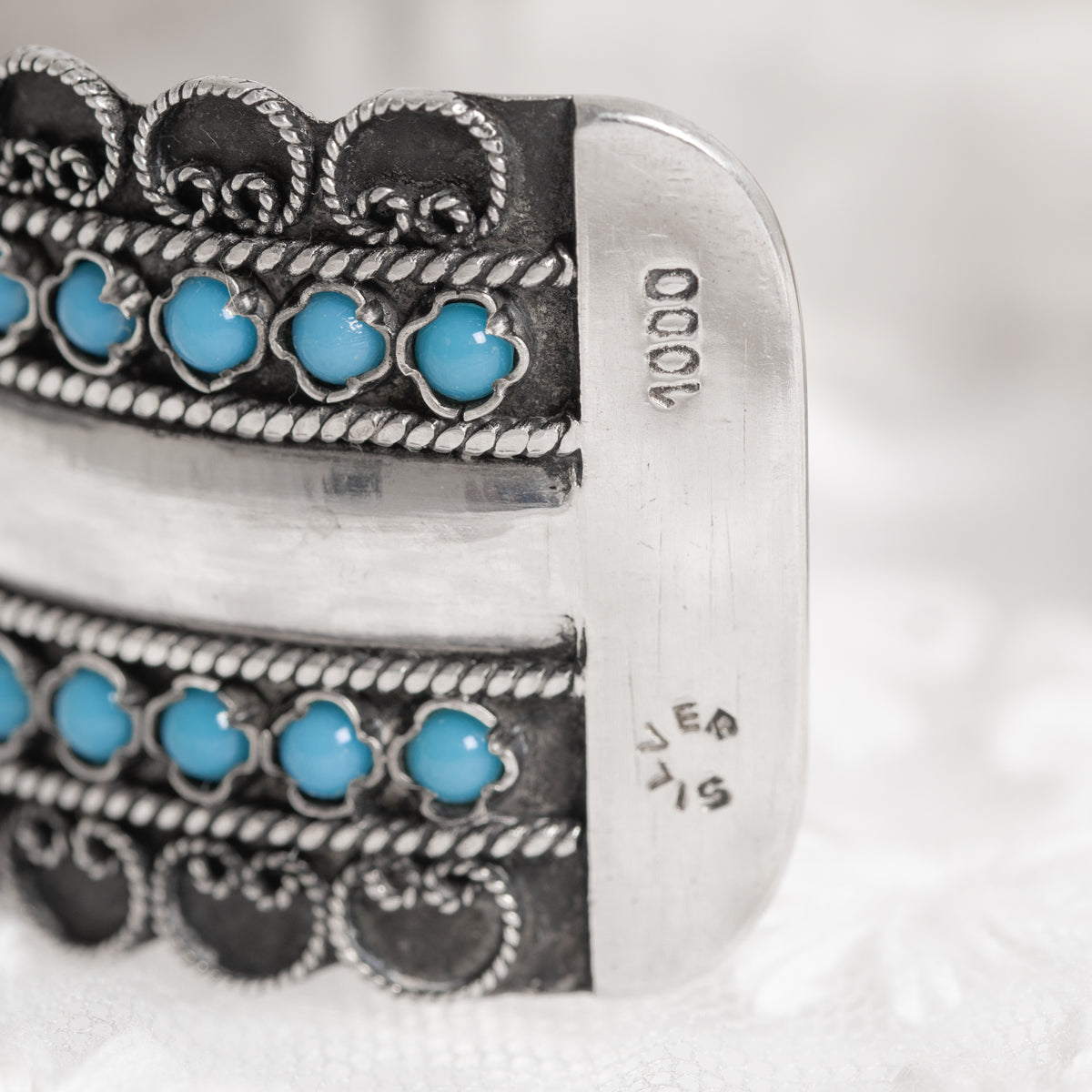 A very attractive vintage hand made silver bangle. It is unusual in being made of pure silver rather than sterling or a lower grade and is marked silver 1000 on one of the end tabs. The bangle has two lines of turquoise cabochons which are probably of Persian origin and there are decorative wire work details and a highly polished band down the centre. The silver under the wire work is intentionally black oxidised to provide contrast. There are no makers marks and it is perhaps Indian or middle Eastern in origin and dates to the mid 20th century.