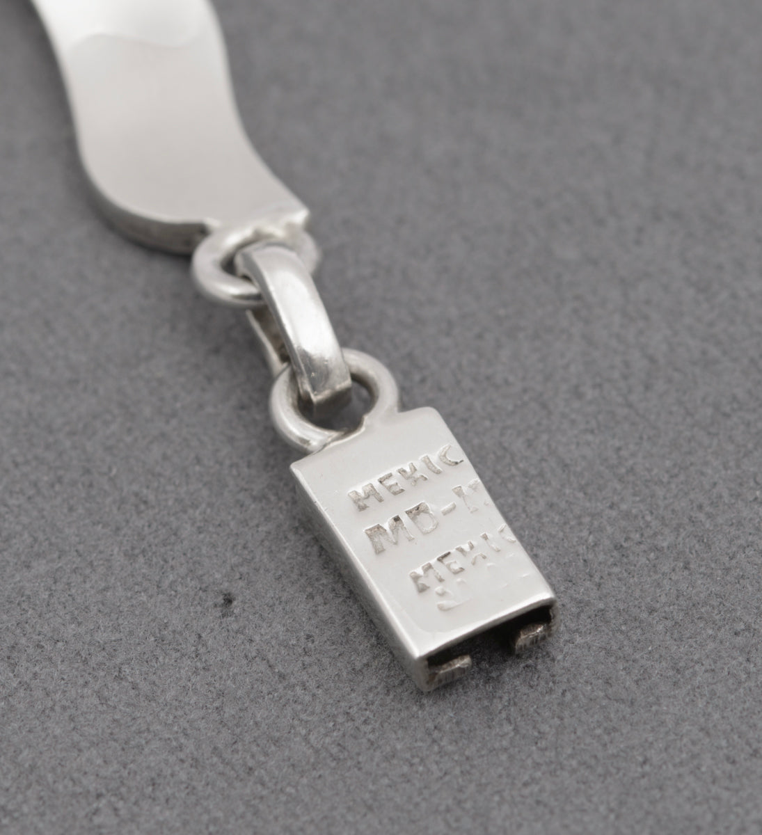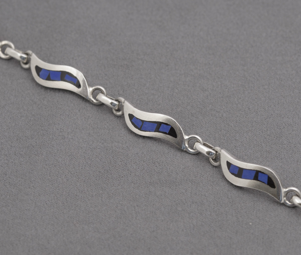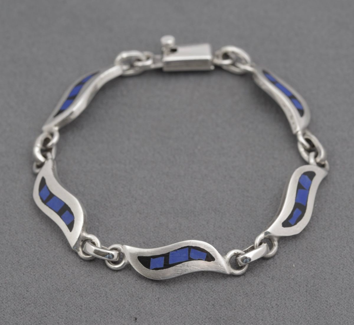A vintage sterling silver panel bracelet. It is of Mexican origin and has an MD mark for Mexico City. The panels are of wave shape and set with slices of cobalt blue colour stone. The links have articulated rings in between them and it fixes with a box clasp. It is likely 1970 or 1970's in period.