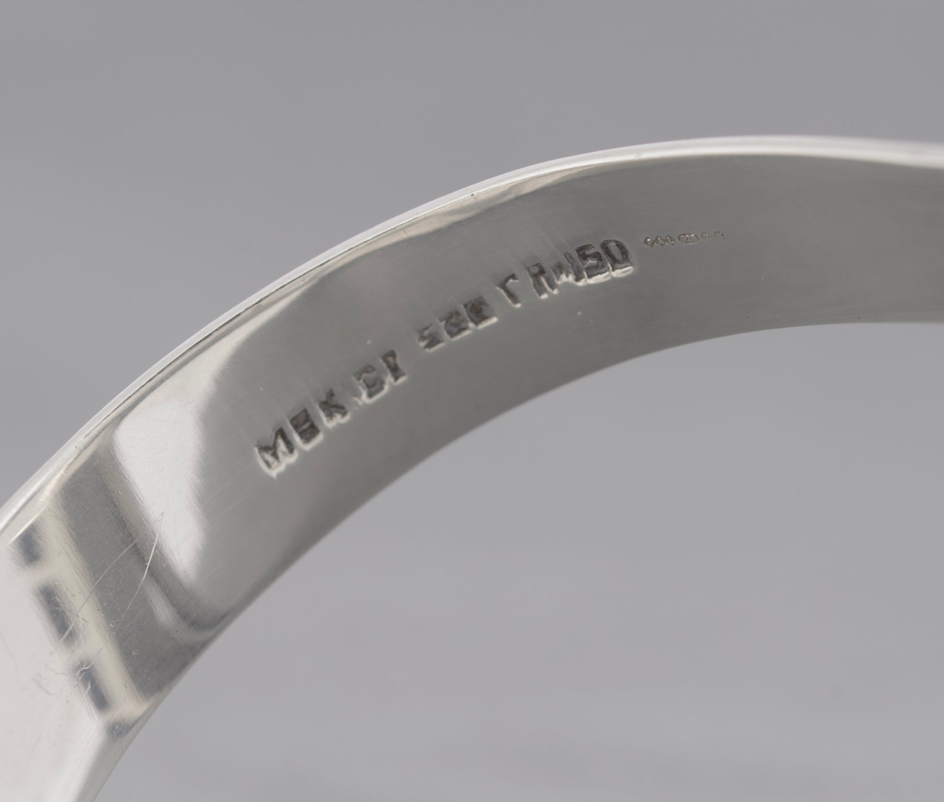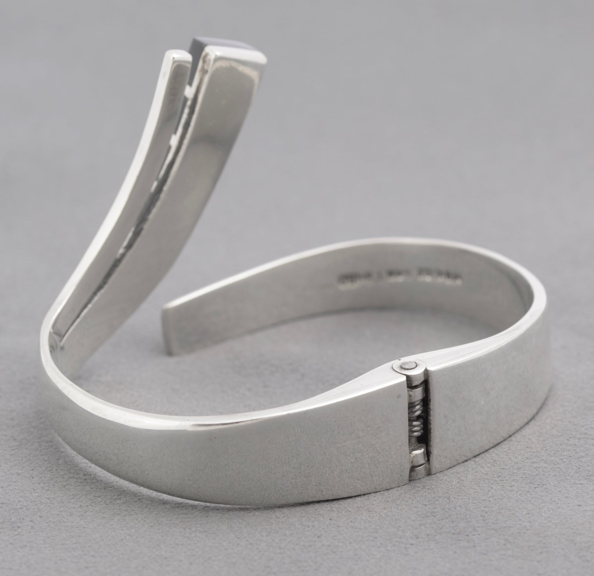 A vintage late 20th century Mexican sterling silver bangle. Heavy construction with thick silver and a hinged opening. Stylised form and set with four black onyx cabochons to one end. It is marked inside the band Mexico 925 and TA-150. It also has an official hallmark for when it was imported into the UK, this was done at the Edinburgh office and has the date letter for 1997.
