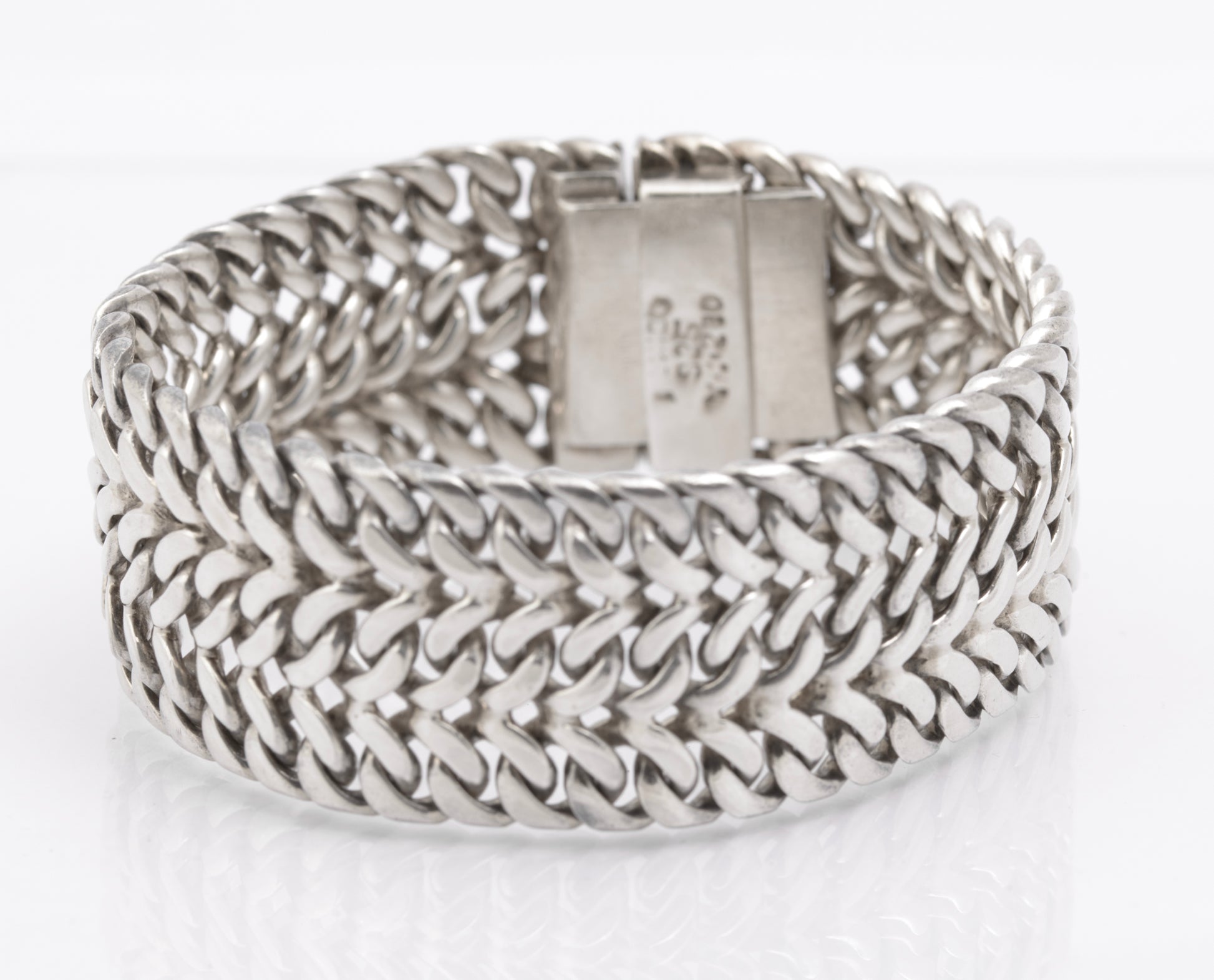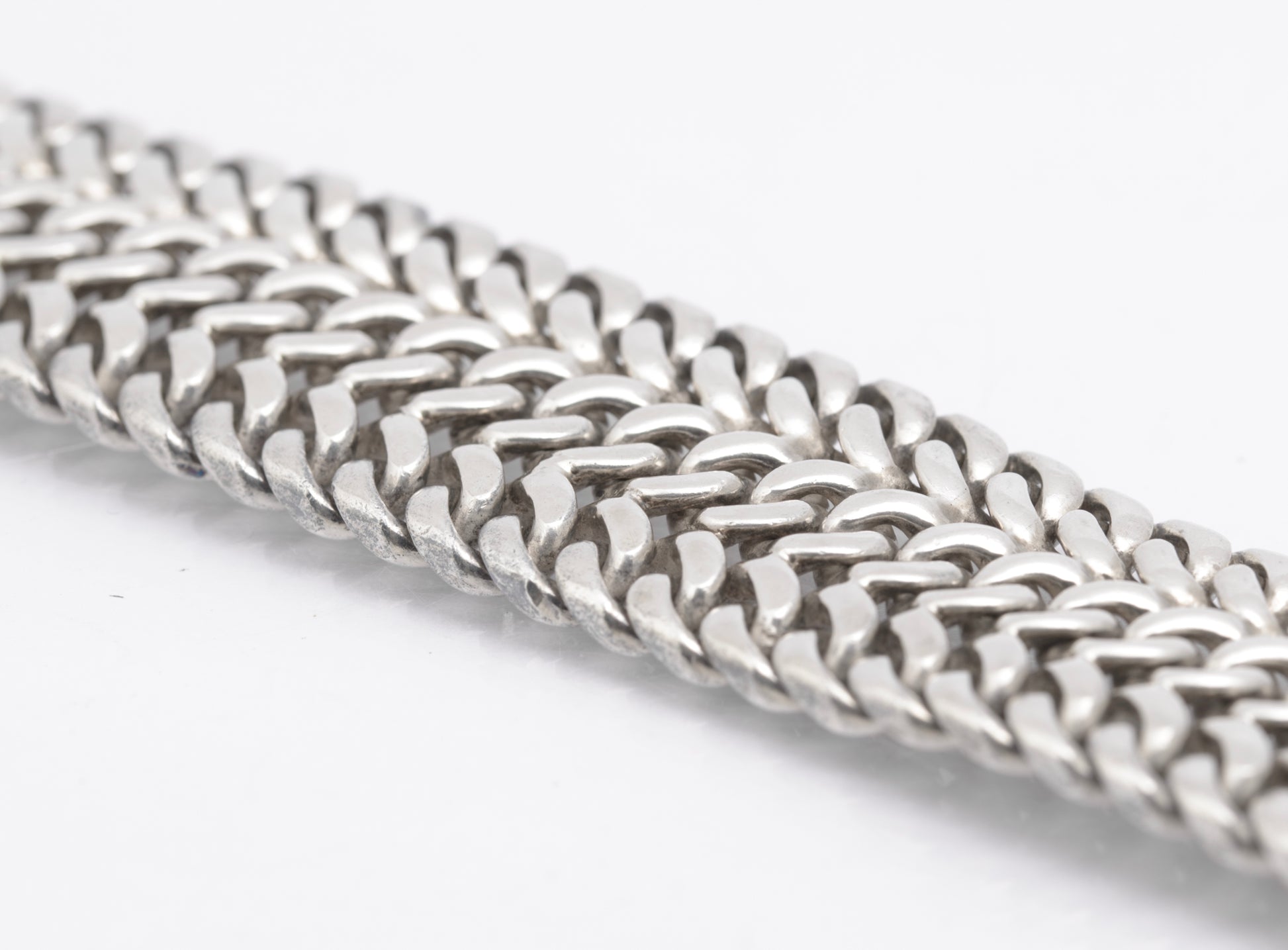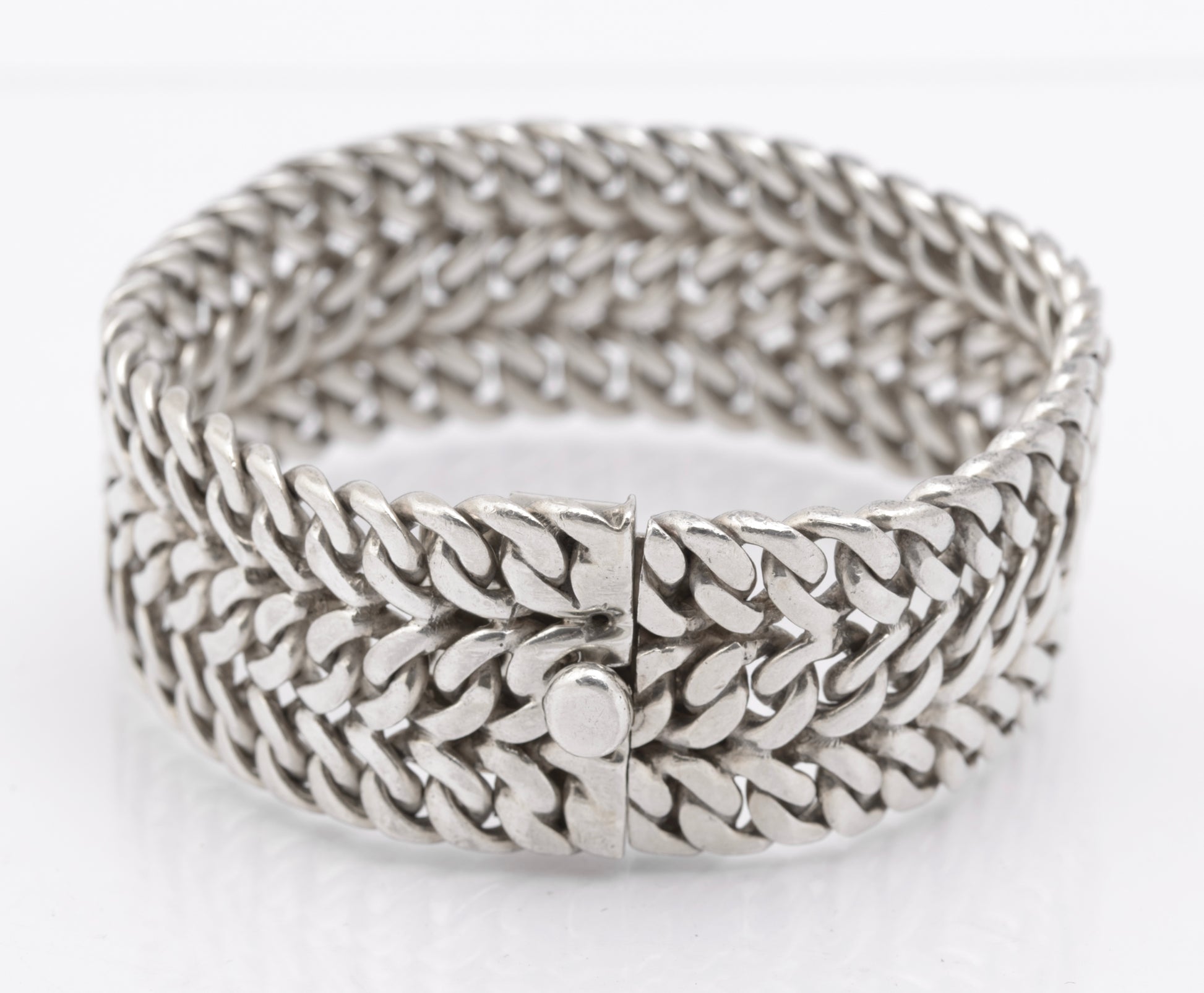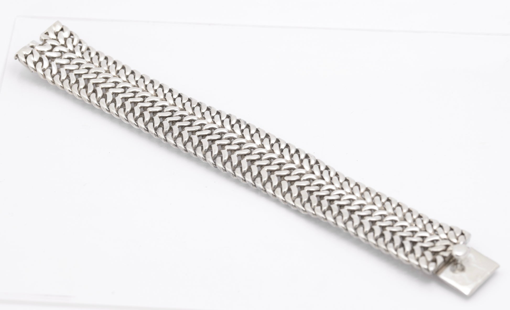 A vintage Mexican sterling silver bracelet. It is heavily constructed with wing shaped links and it has a wide slide catch. The construction is slightly biased so it fits nicely on the wrist tapering a little. It has marks to the back of the clasp, with Mexico 925 and a further makers mark. The bracelet also tests as sterling silver. It appears to be hand made and makes a statement due to the large size, it is also quite heavy so will suit people that like weighty jewellery.