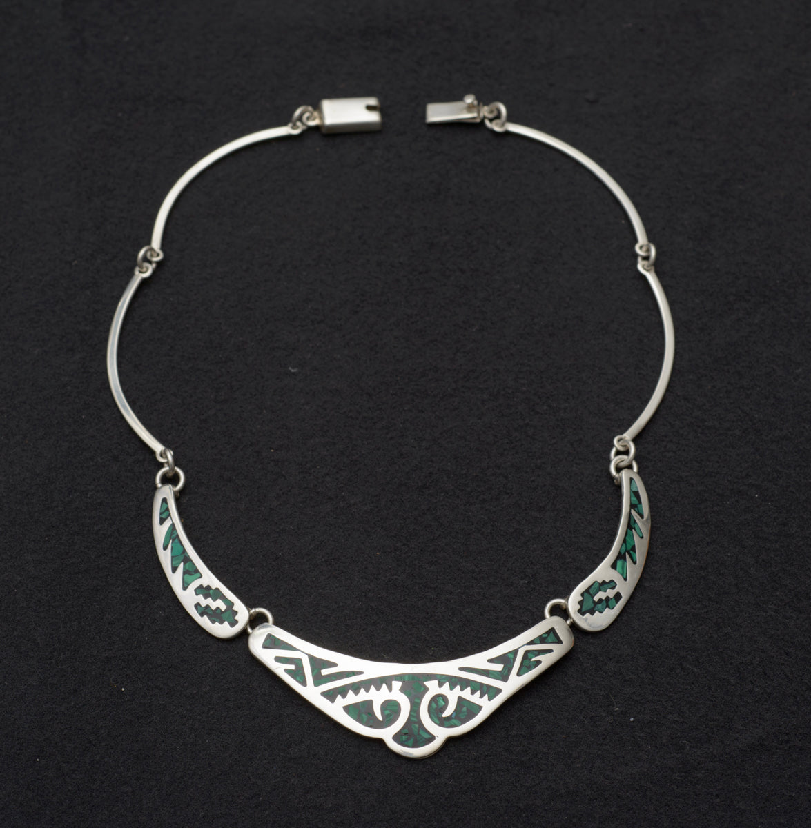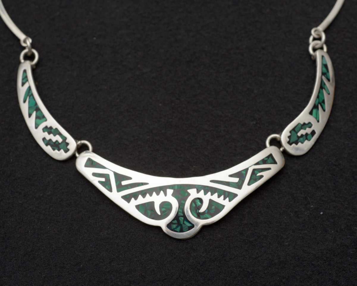Vintage Mexican Taxco Sterling Silver Panel Necklace With Green Malachite Inlay (B2499)