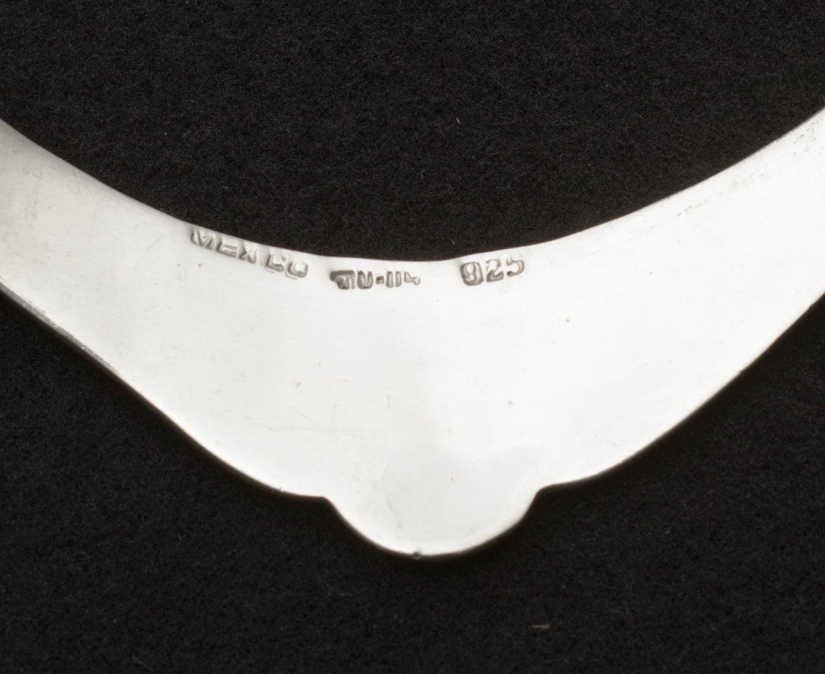 A vintage Mexican sterling silver panel necklace. It has three panels which are set with malachite and further strap type links which are curved. It has a sliding box clasp closure. The reverse of the main panel is stamped Mexico with a TV114 mark for Taxco and 925 for sterling silver. It likely dates to the 1980's and is a short collar length.