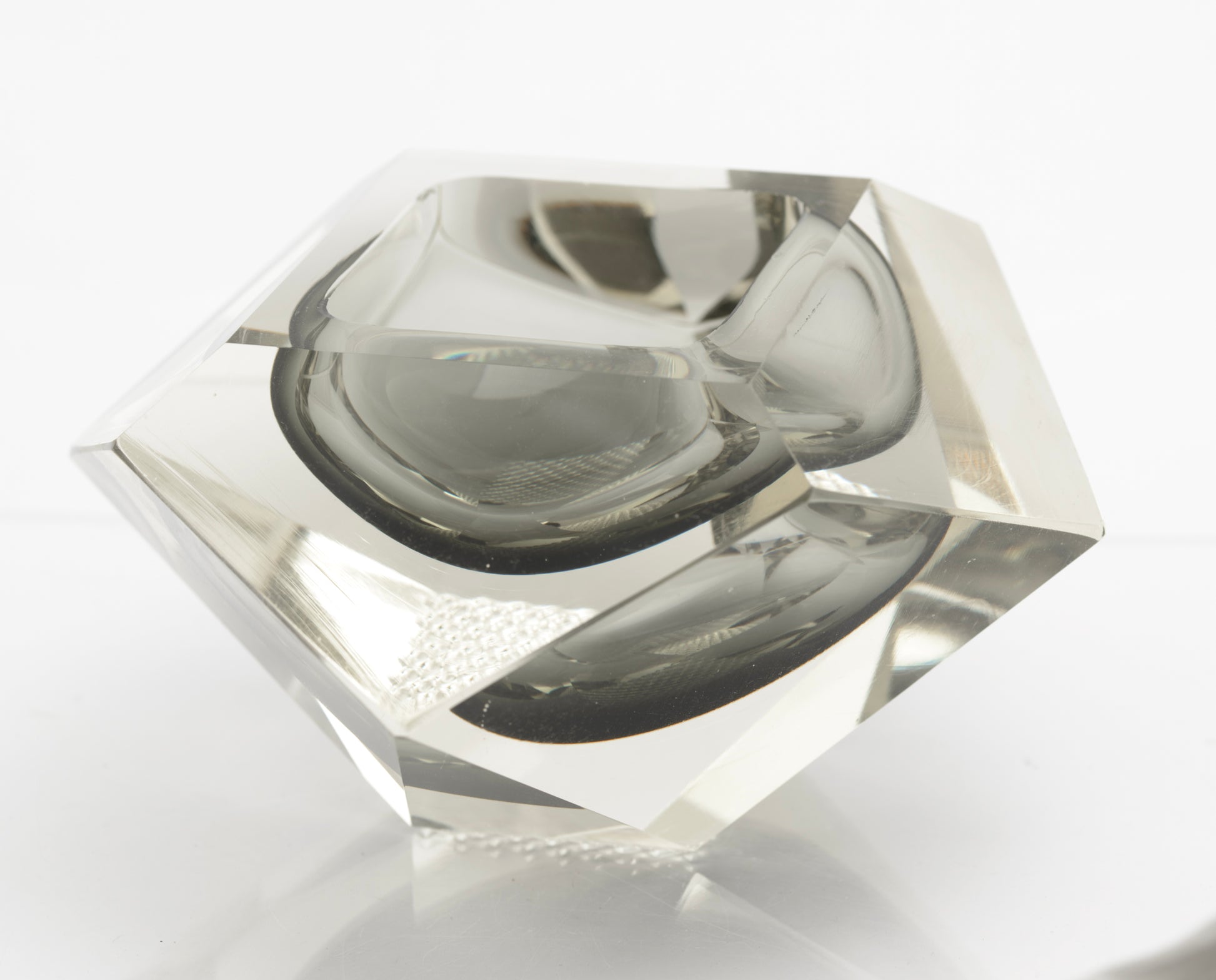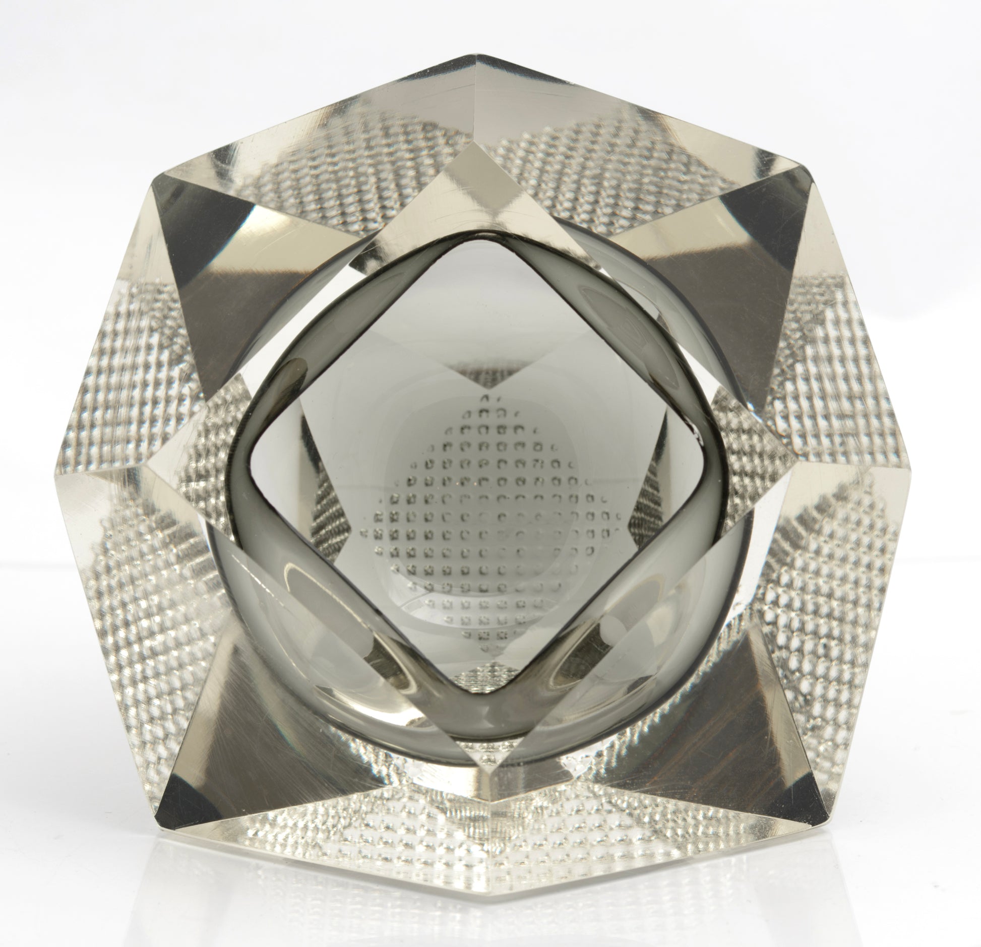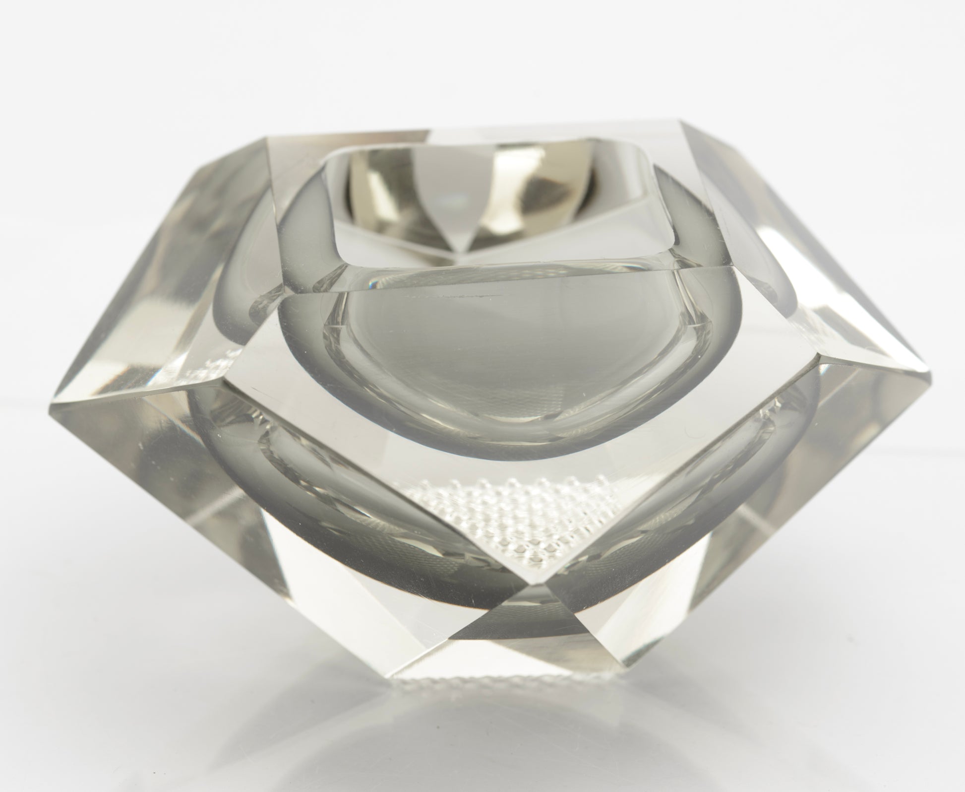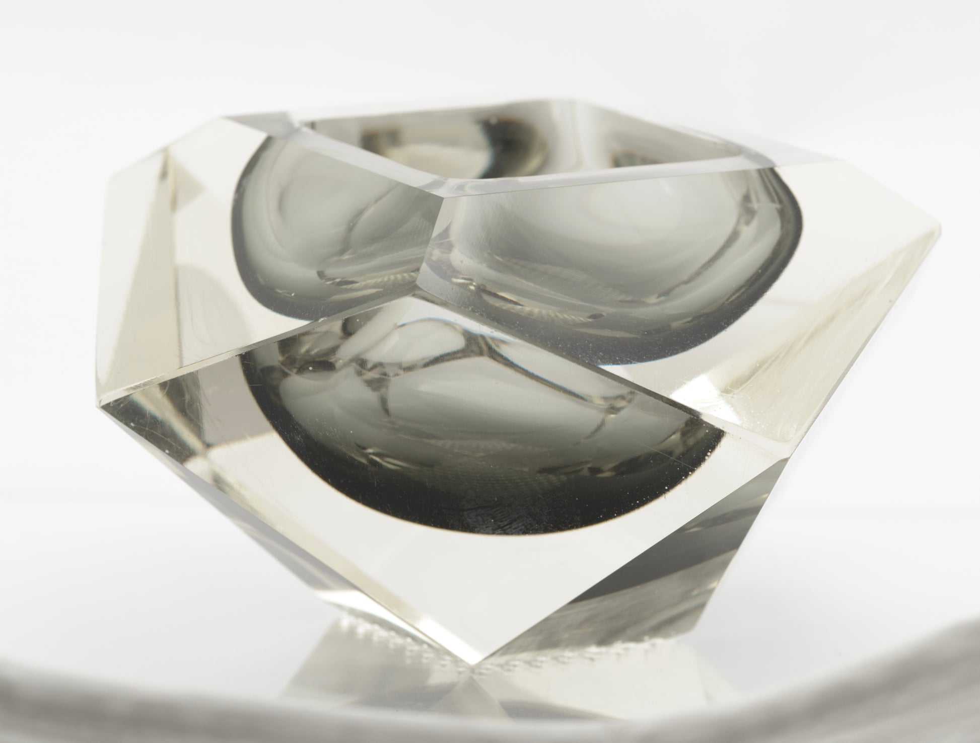 A vintage Murano art glass geode bowl in the manner of Mandruzzato. It is a sommerso glass example with clear outer glass and a pewter toned interior. It has a textured base which reflects throughout the bowl when viewed head on. There are no makers marks which is normal as these items usually came with paper sticker. It would date to the 1960's.